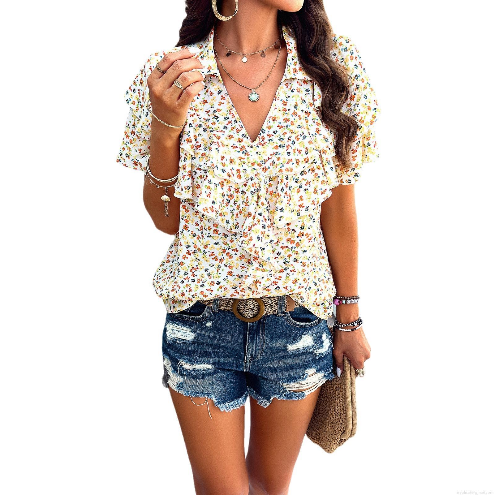 • Women's Elegant Floral Print V Neck Ruffle Sleeve Blouse Top Summer Hibiscus Linen Casual Commuting Shirt Women Clothing