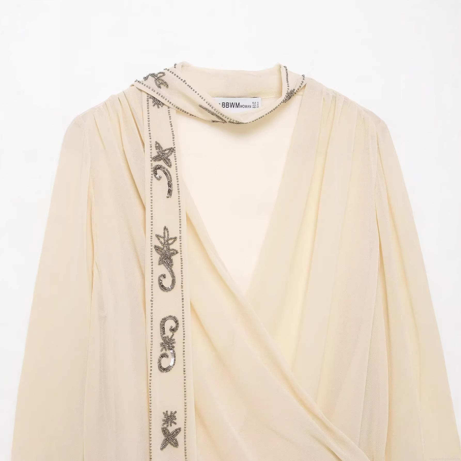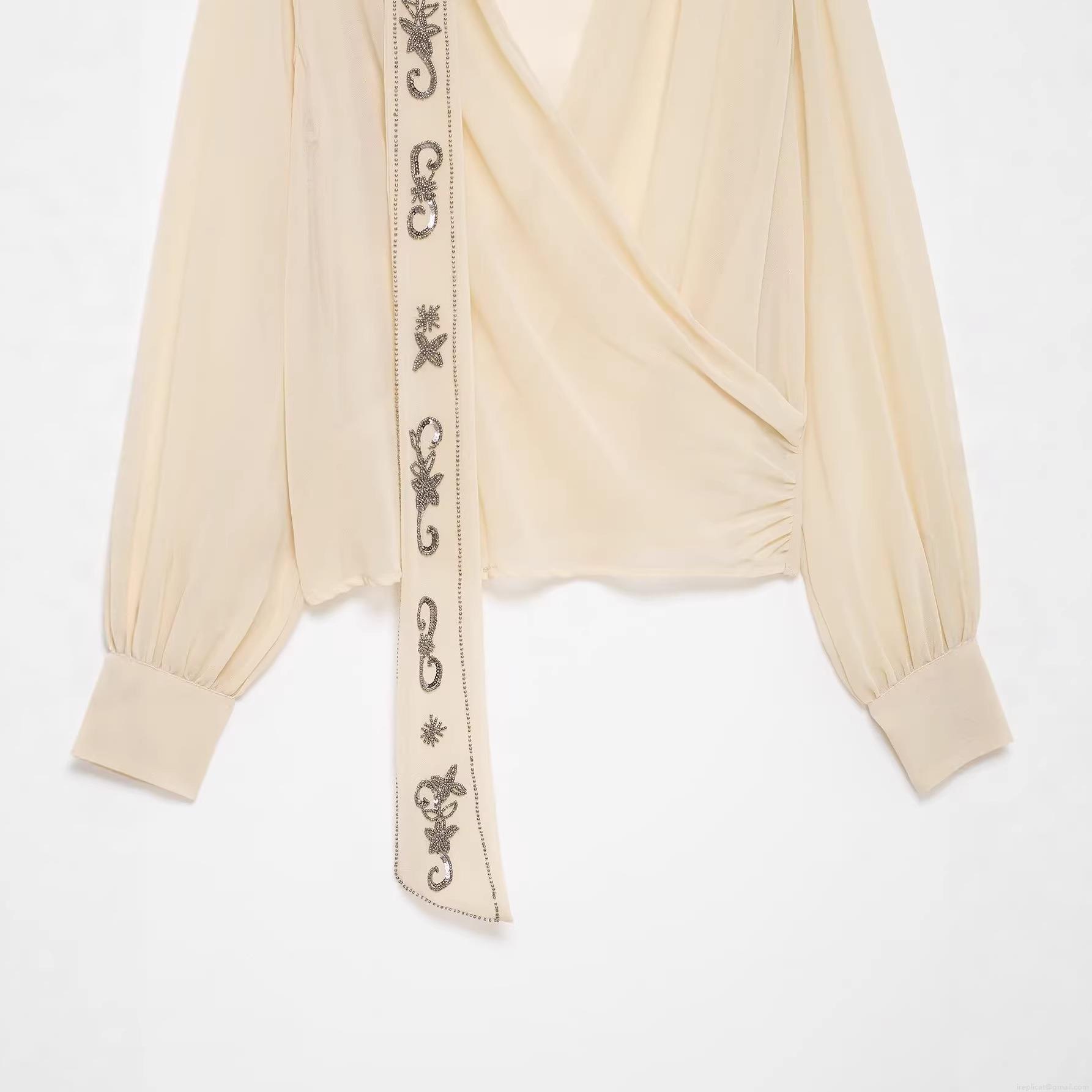Women's Elegant Georgette Chiffon Blouse Shirt With Beaded Sequin Scarf V Neck Wrap Top Long Sleeve Fashion Apricot Office Party Shirt For Ladies