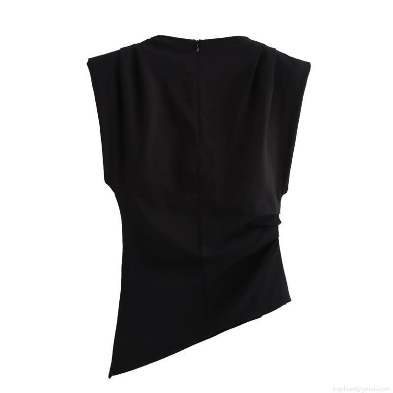 • Women's Elegant High Neck Sleeveless Pleated Top Asymmetric Hem Blouse with Shoulder Pads Fashion Casual Streetwear Solid Color Polyester Top for Women