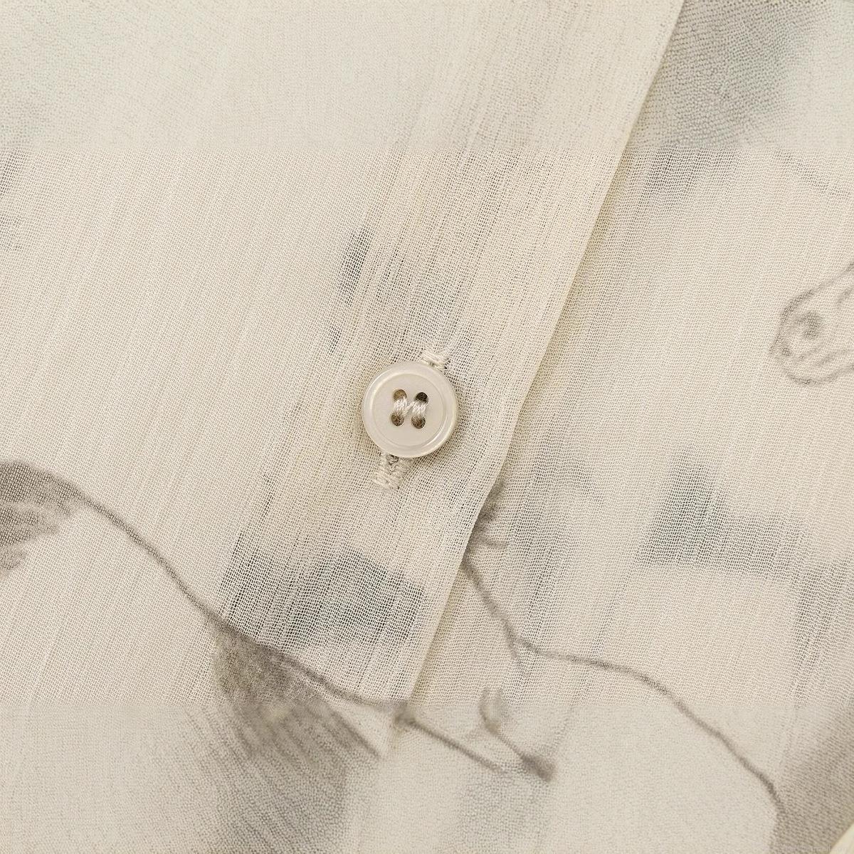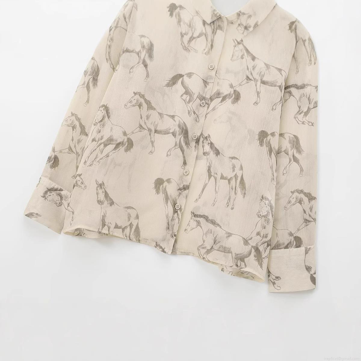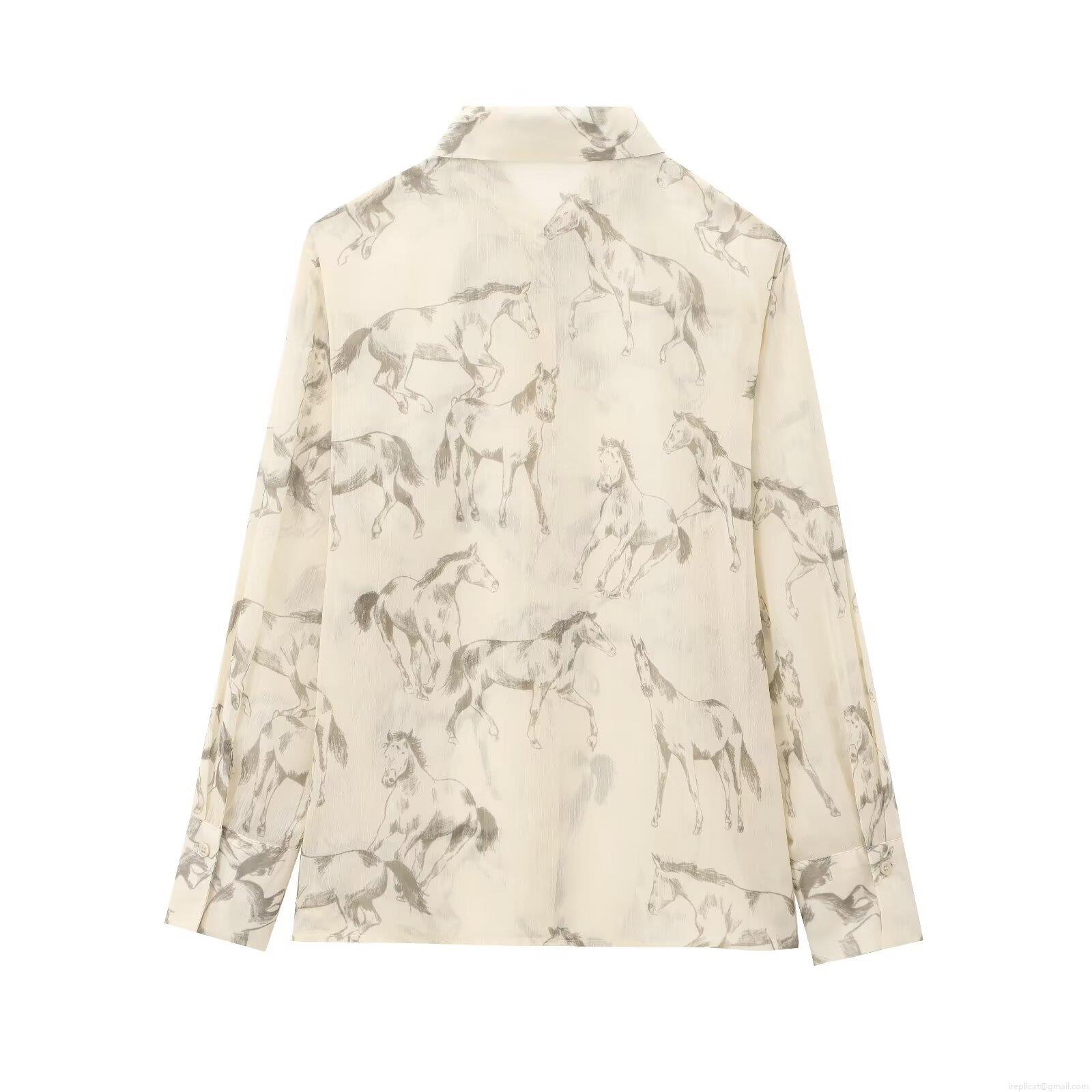 • Women's Elegant Horse Print Chiffon Blouse Long Sleeve Semi-Transparent Button Down Casual Shirt Tops Beige Apricot