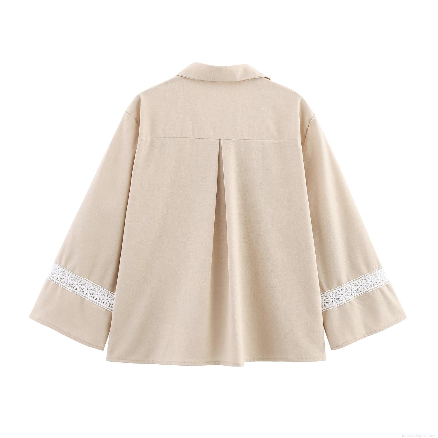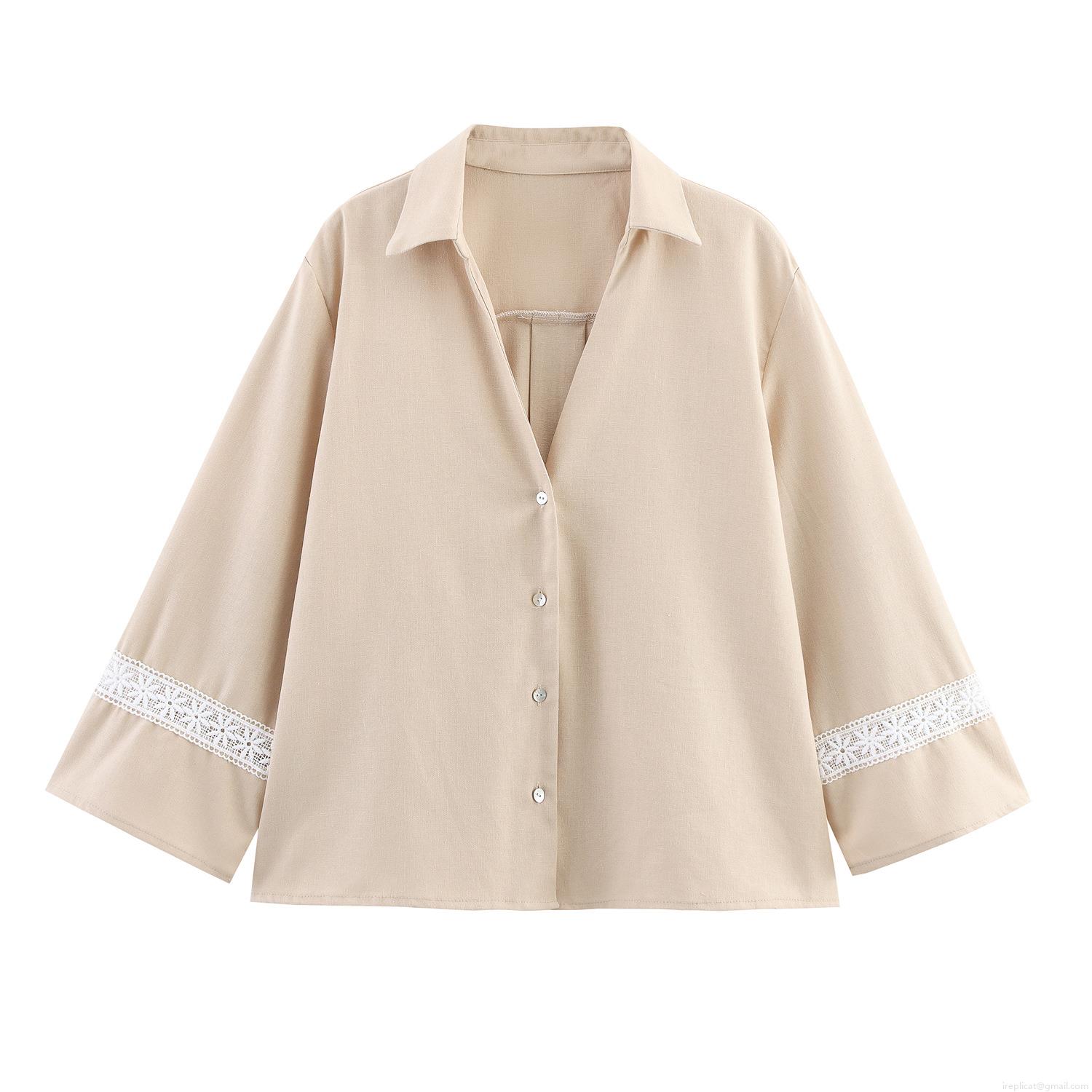 • Women's Elegant Lace Patchwork V-Neck Blouse Loose Long Sleeve Single Breasted Shirt Casual Comfortable Polyester Top Spring Summer Women Clothing