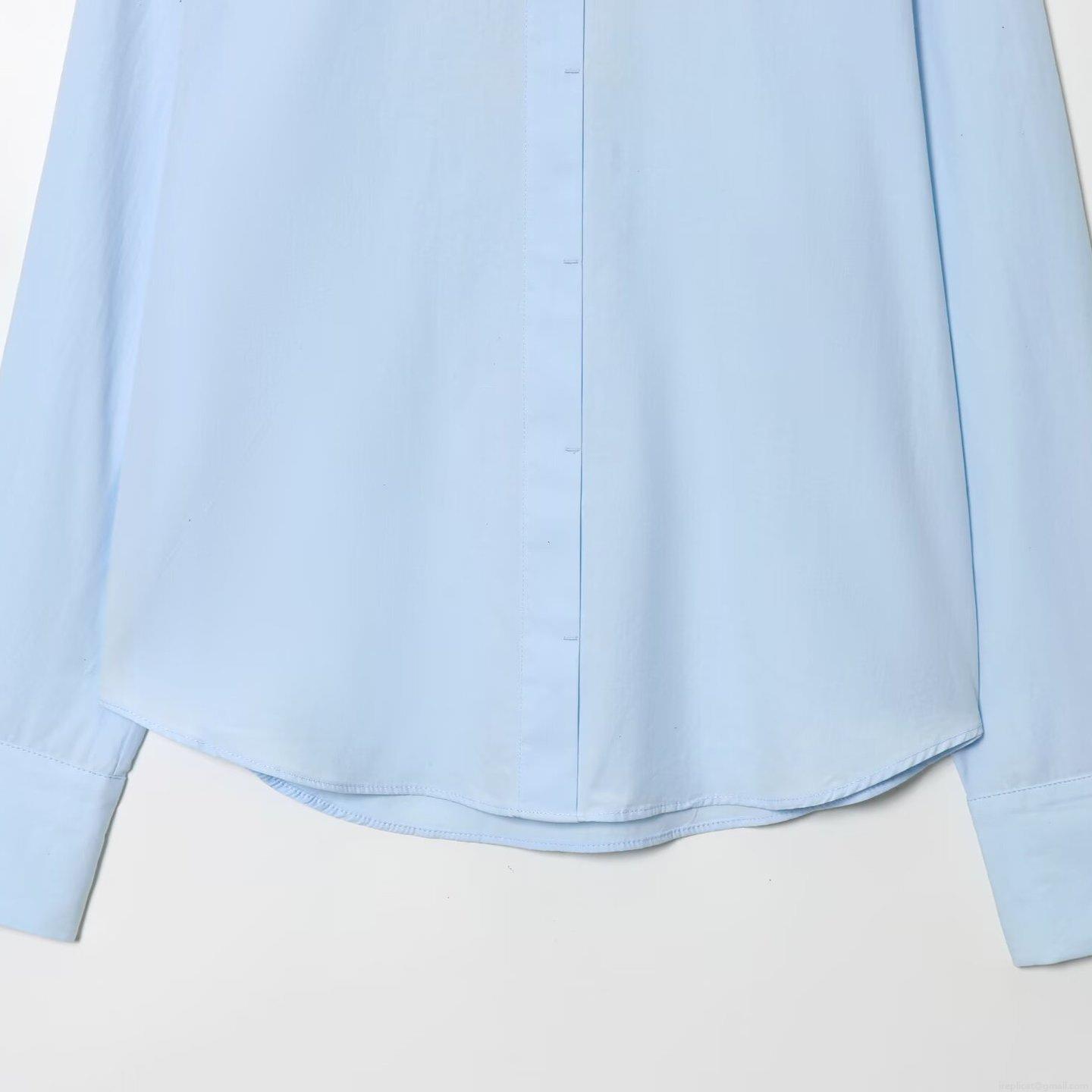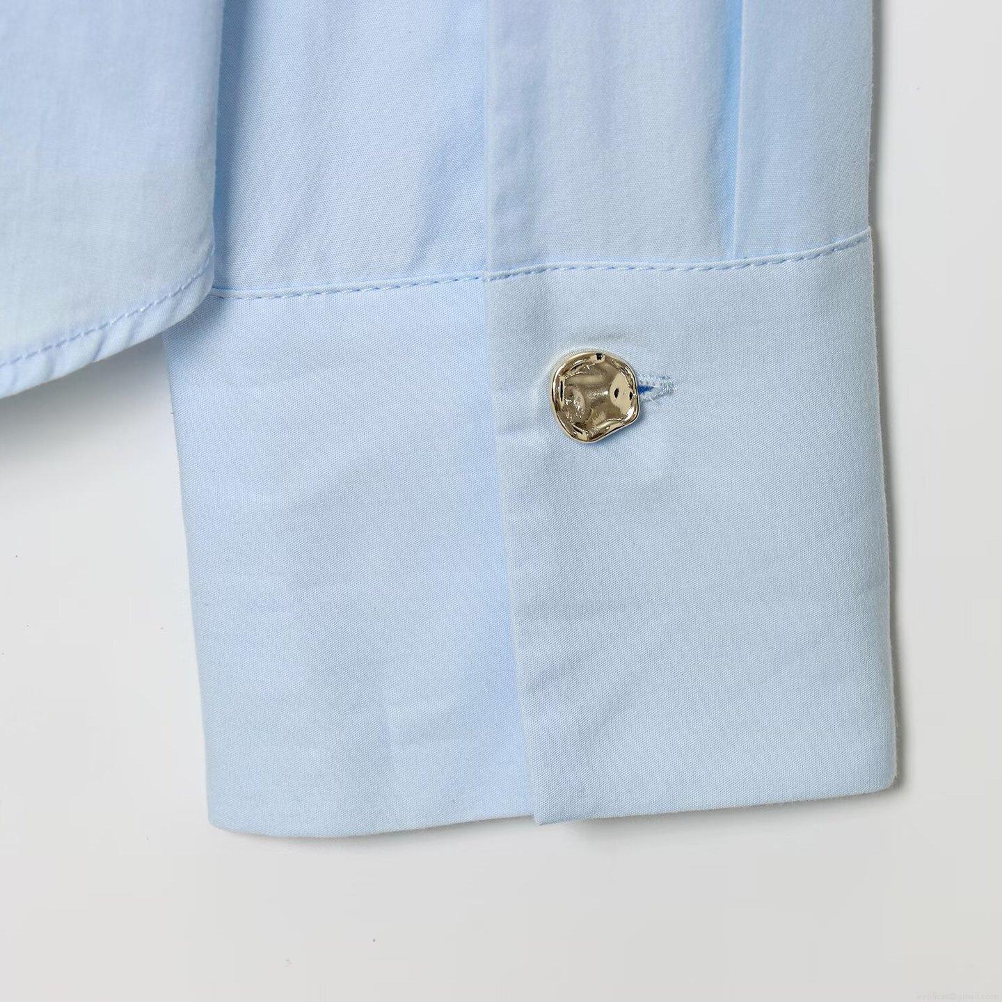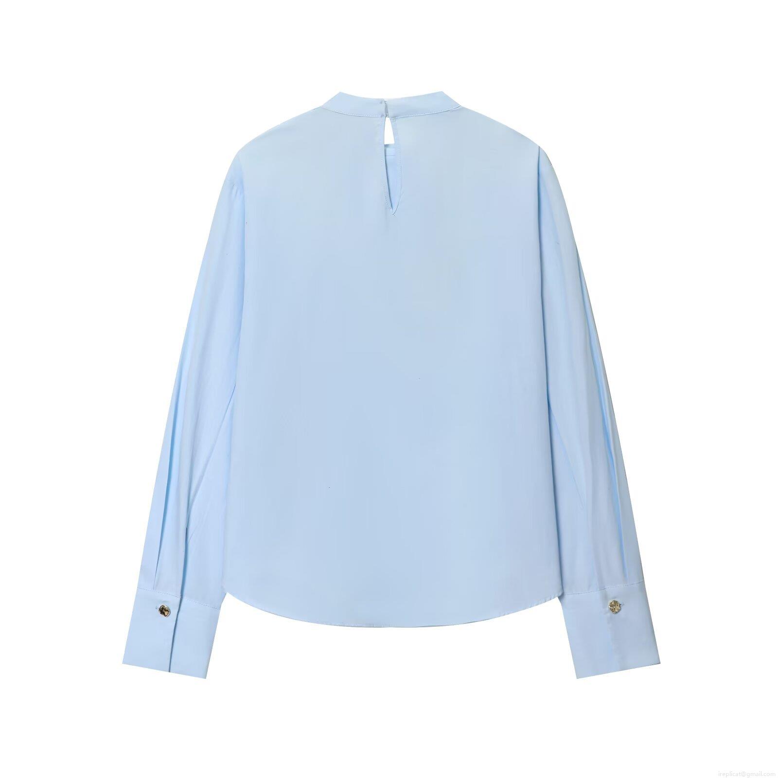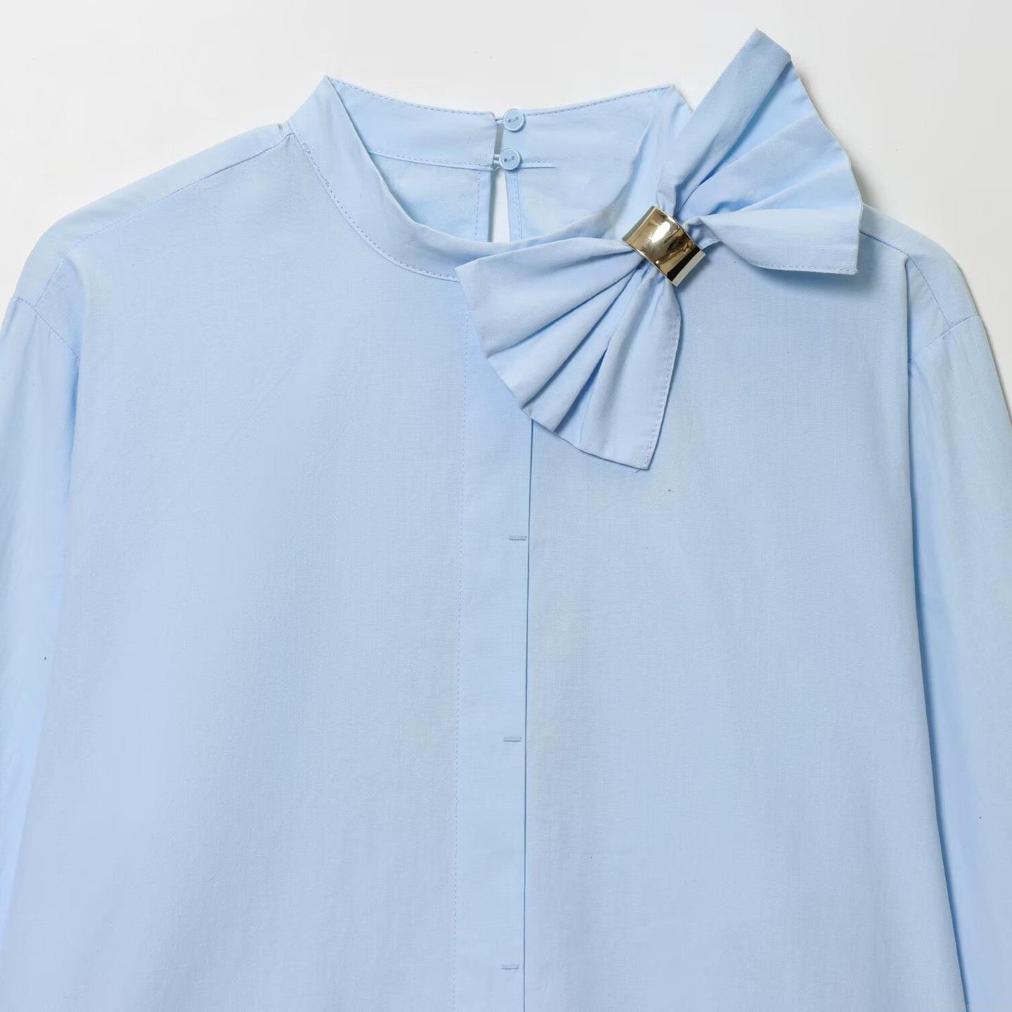 • Women's Elegant Light Blue Long Sleeve Blouse With Bow Tie Decoration Gold Metal Ring Sweet Style Poplin Shirt For Office Work Casual Wear Autumn Fashion Tops