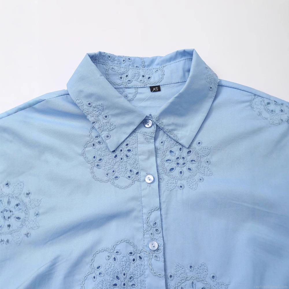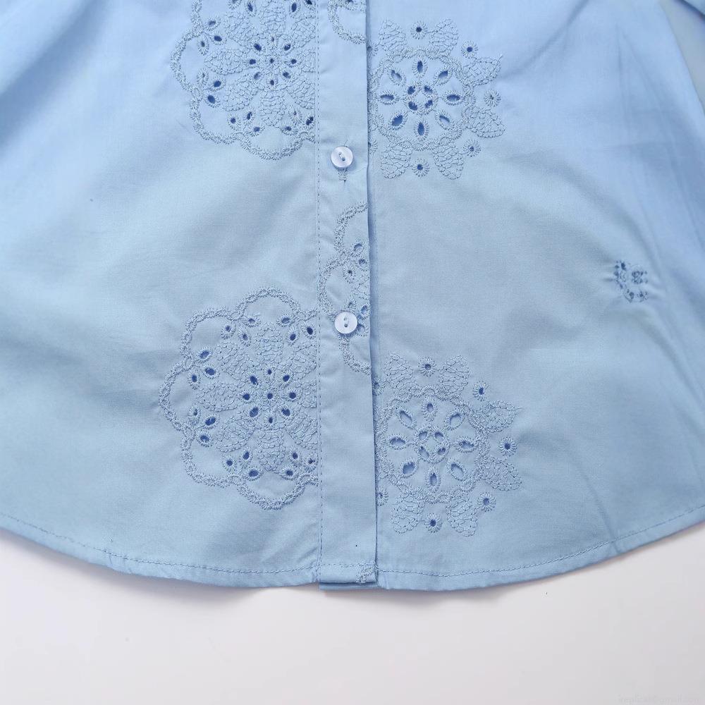 • Women's Elegant Light Blue Long Sleeve Shirt With Hollow Out Flower Eyelet Embroidery Cotton Blend Button Down Blouse For Spring Daily Wear