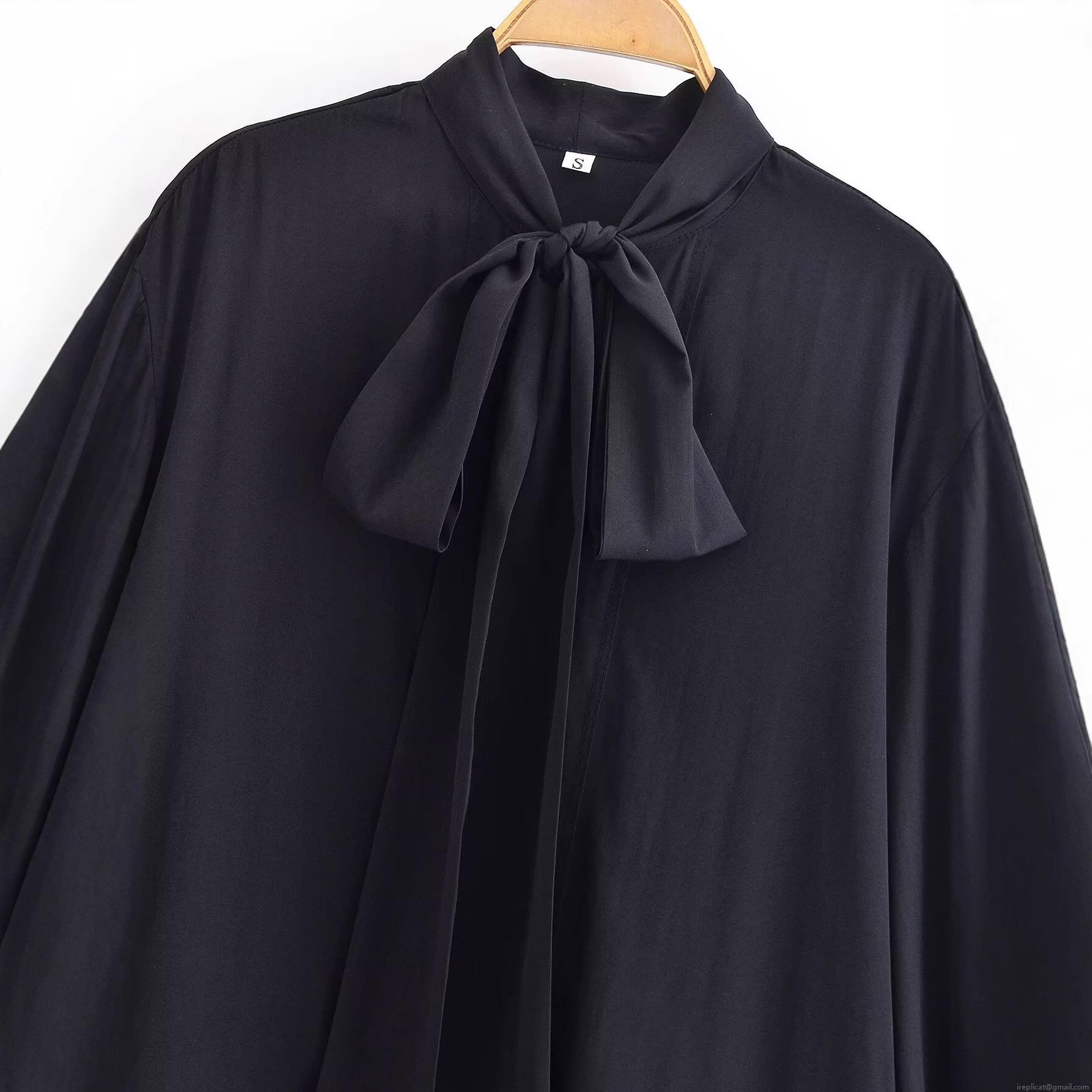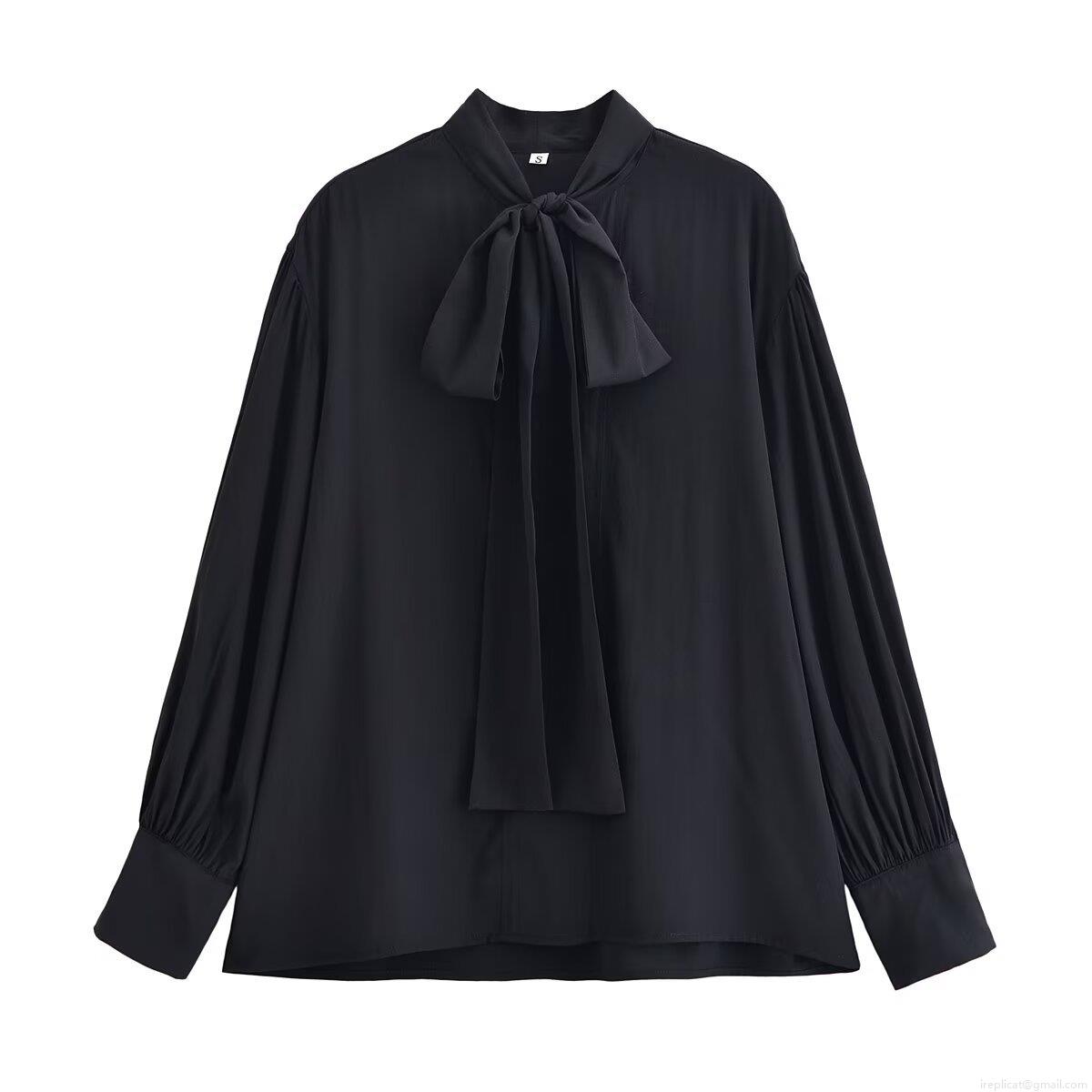 Women's Elegant Long Sleeve Bow Tie Blouse Solid Black Polyester Shirt Casual Office Party Tops Fashion Sweet Style Ladies Clothing