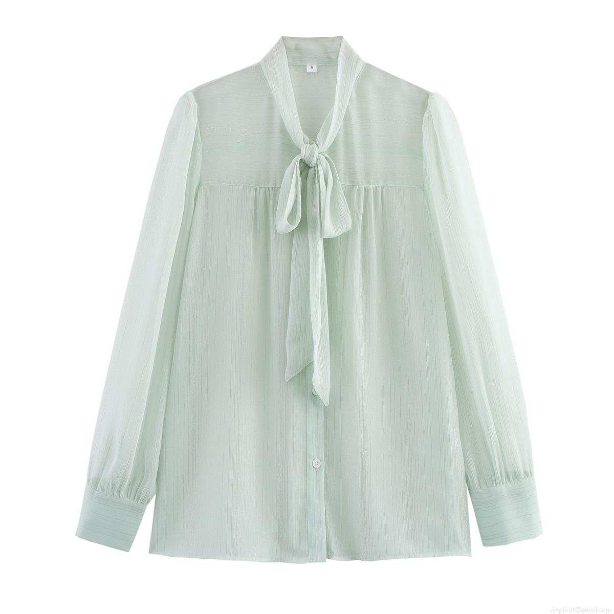 • Women's Elegant Long Sleeve Bow Tie Neck Blouse Metallic Stripe Sheer Chiffon Shirt Fashion Office Lady Daily Top