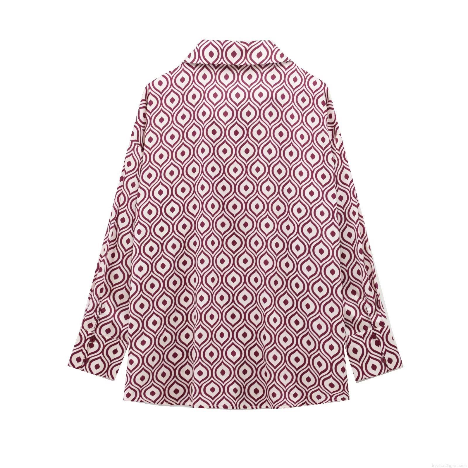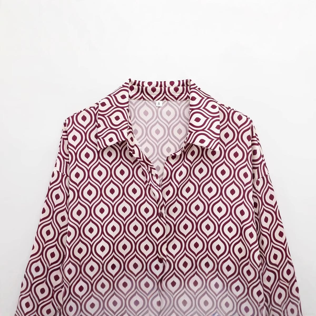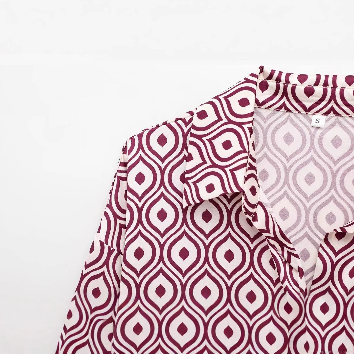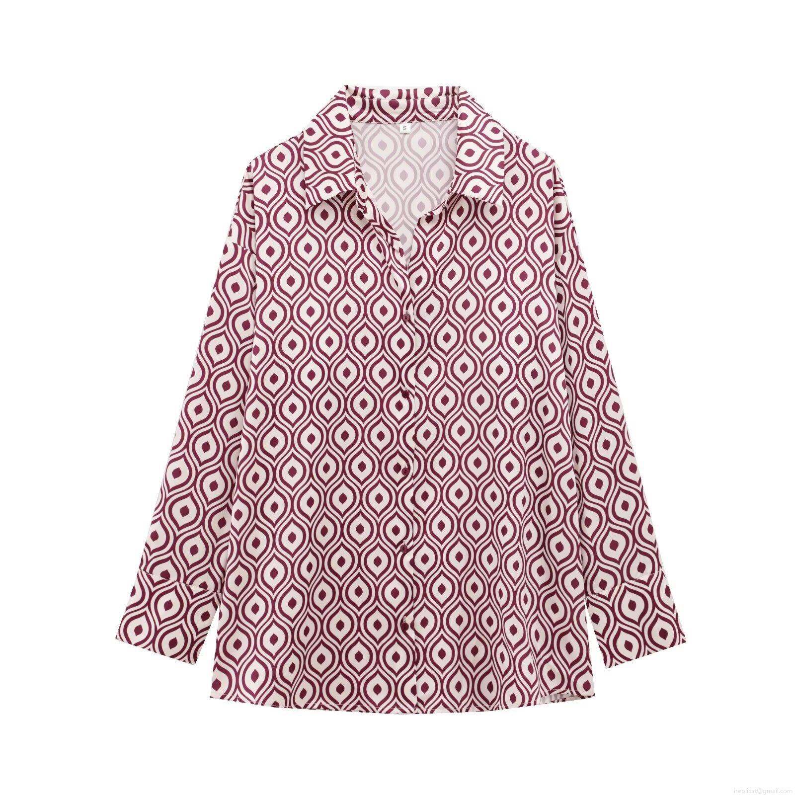 • Women's Elegant Long Sleeve Button Down Blouse Shirt Geometric Water Drop Print Stretch Satin Polyester Fabric Wine Red Beige Tops for Office Casual Wear