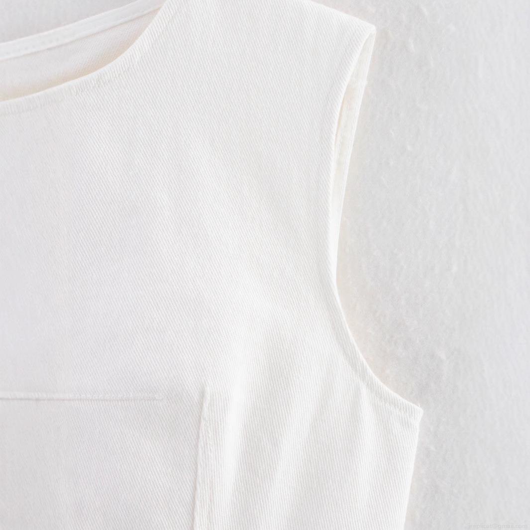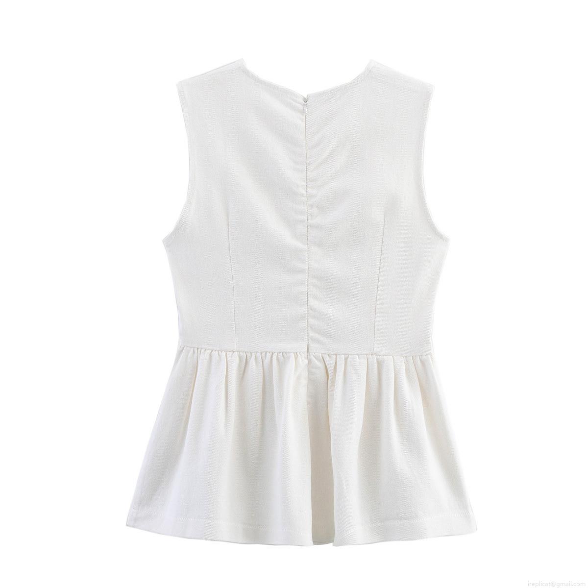 • Women's Elegant Peplum Top Sleeveless Round Neck 100% Cotton Twill Blouse With Decorative Pocket Back Invisible Zipper Slim Fit Solid White Summer Street Style Shirt