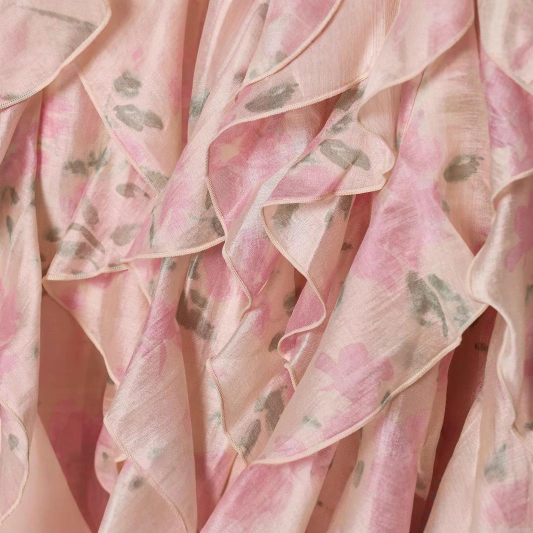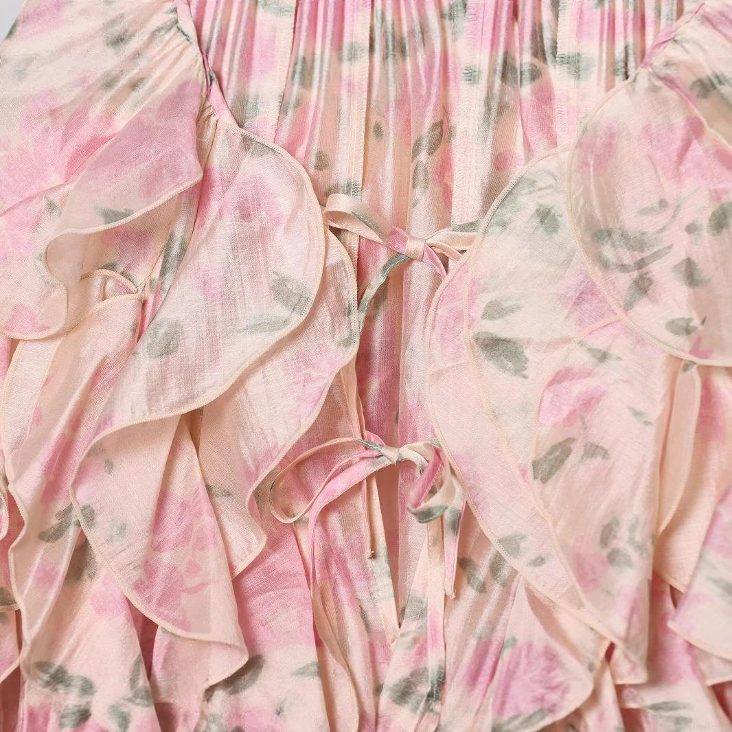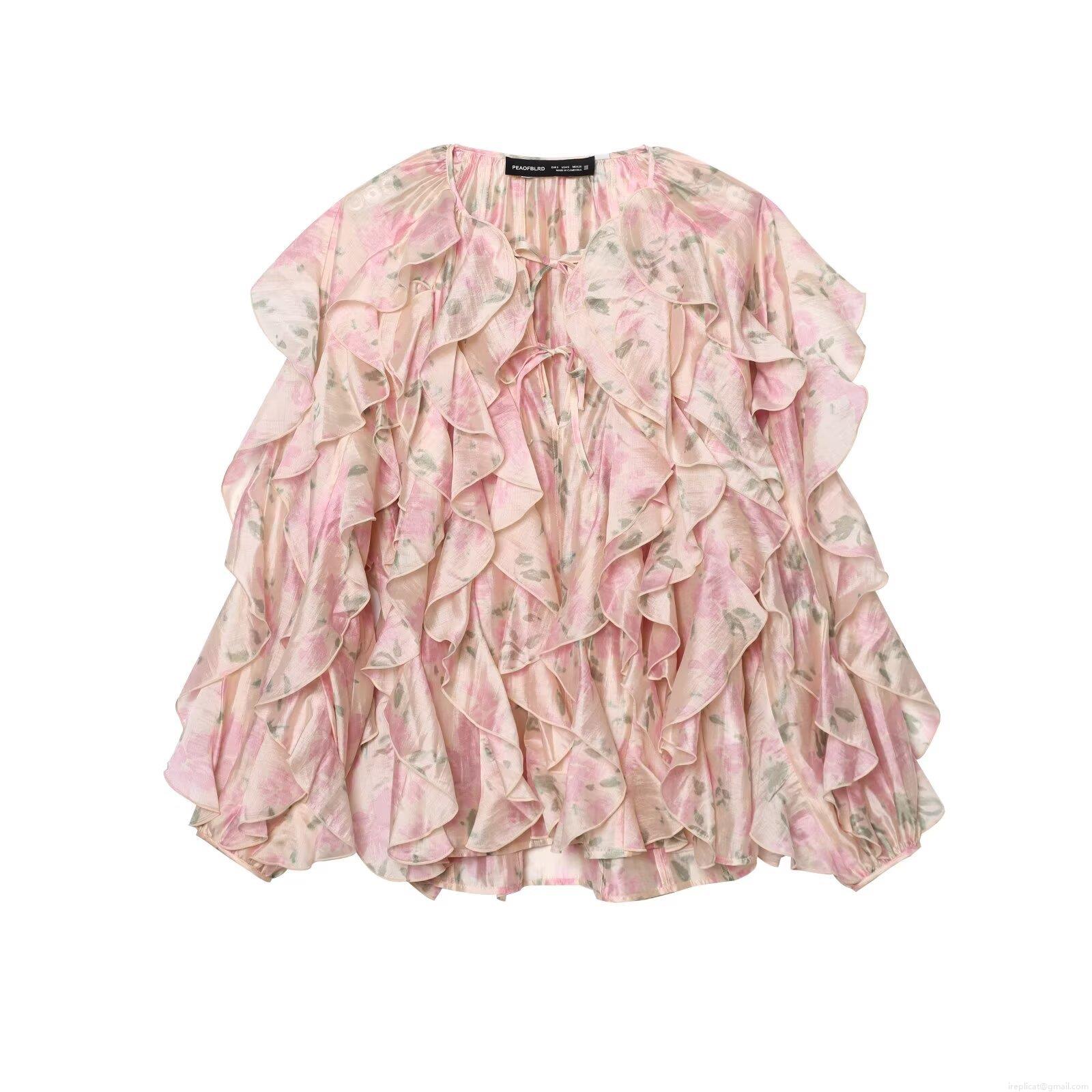• Women's Elegant Pink Floral Ruffle Chiffon Blouse Long Sleeve V Neck Tie Front Top Romantic Multi Layered Ruffle Streetwear Shirt For Daily Party Ladies