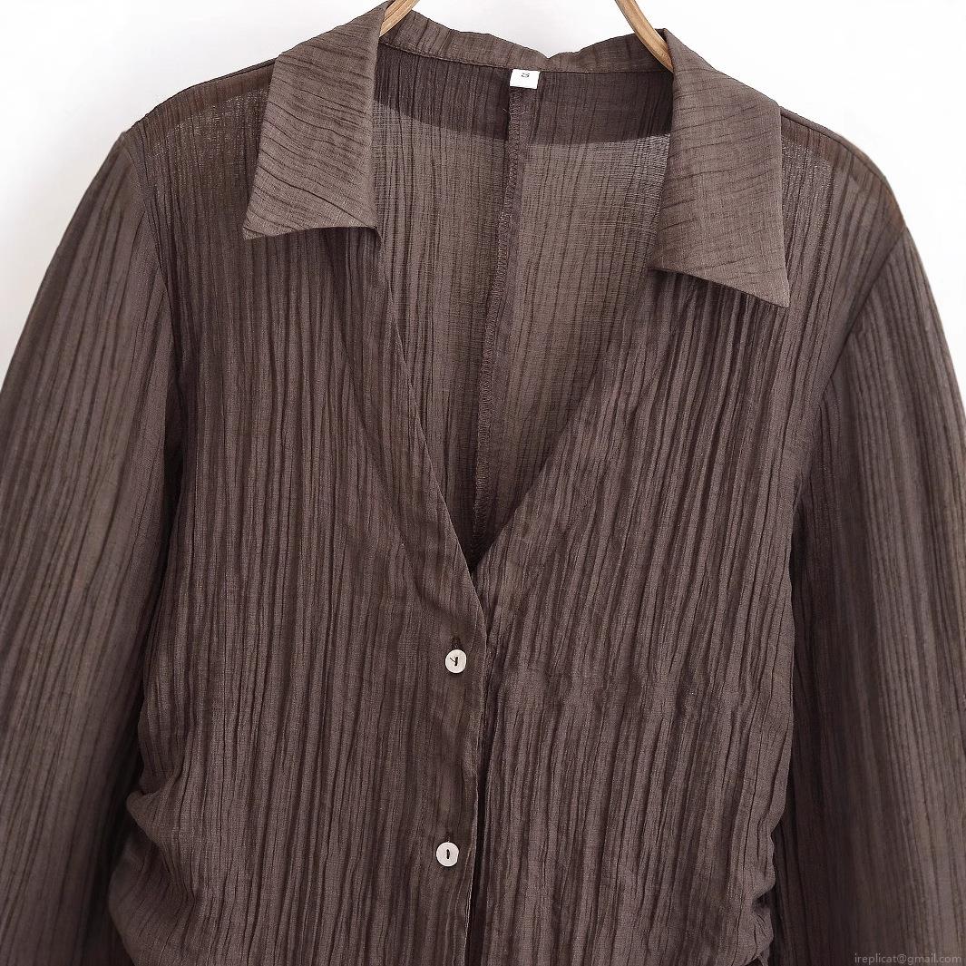 Women's Elegant Pleated Coffee Brown Long Sleeve Blouse With Bow Tie Cuffs V-Neck Button Down Transparent Polyester Shirt For Office Daily Wear