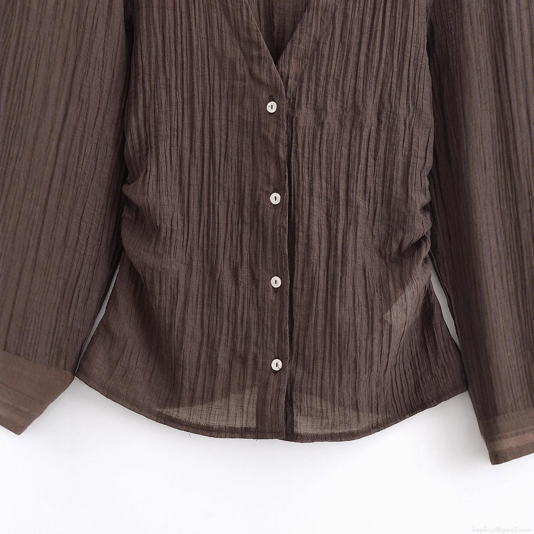 • Women's Elegant Pleated Coffee Brown Long Sleeve Blouse With Bow Tie Cuffs V-Neck Button Down Transparent Polyester Shirt For Office Daily Wear