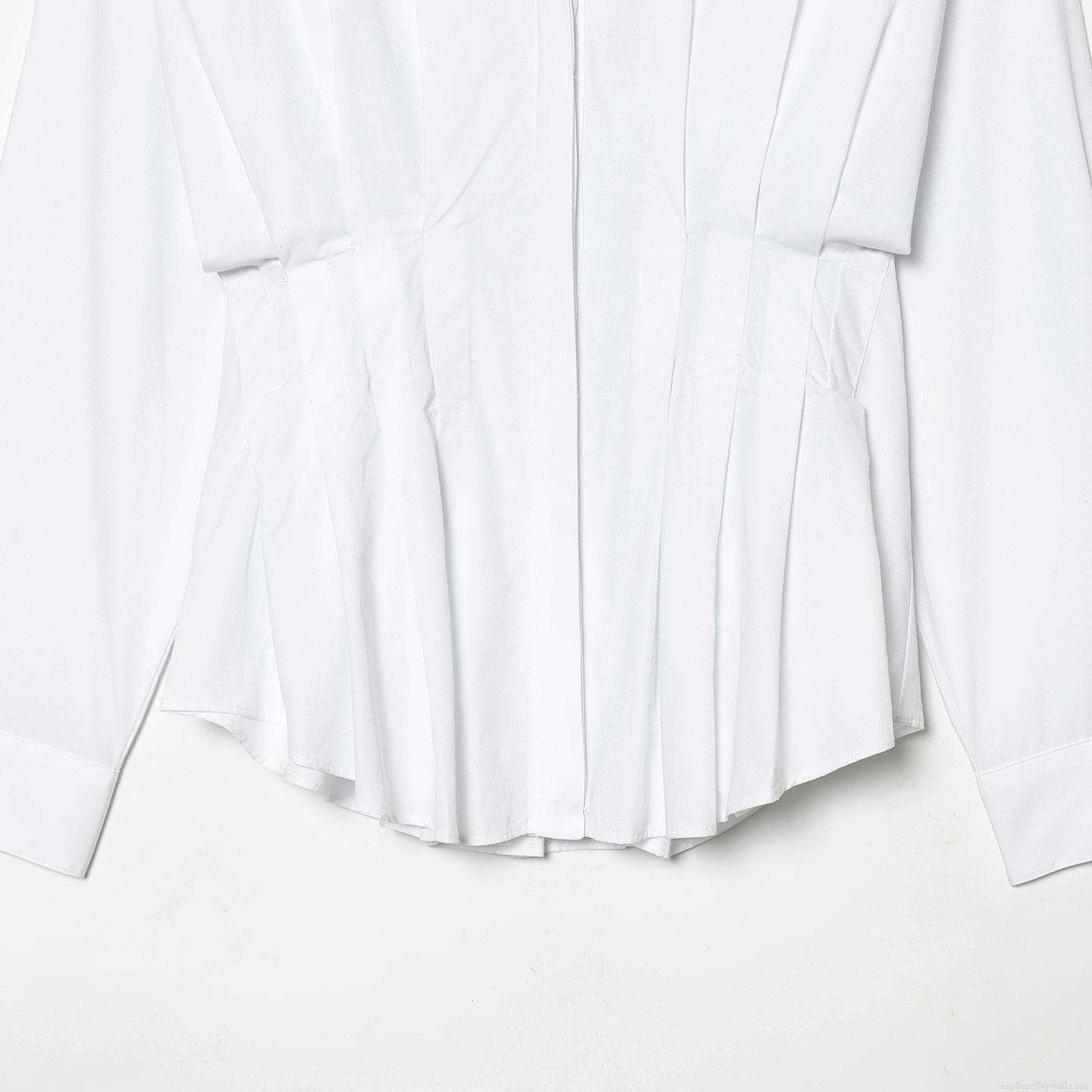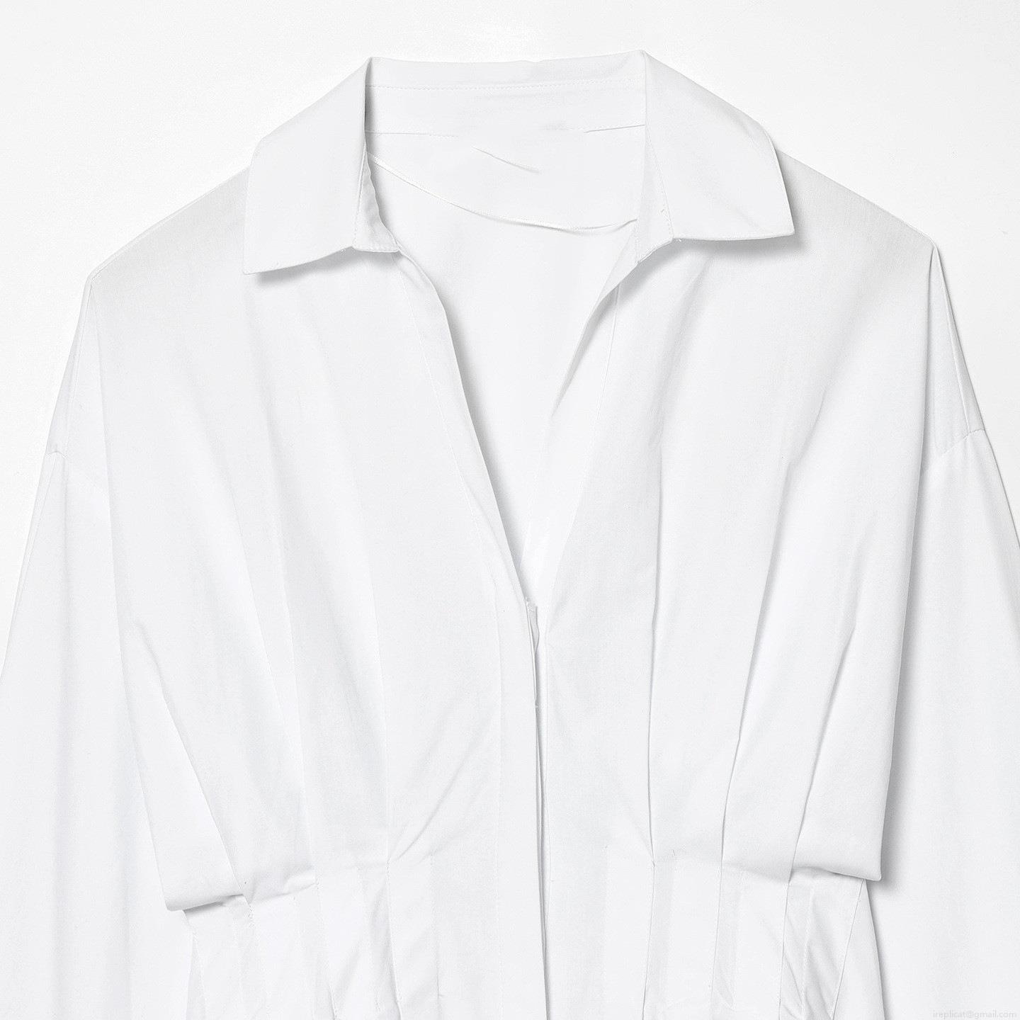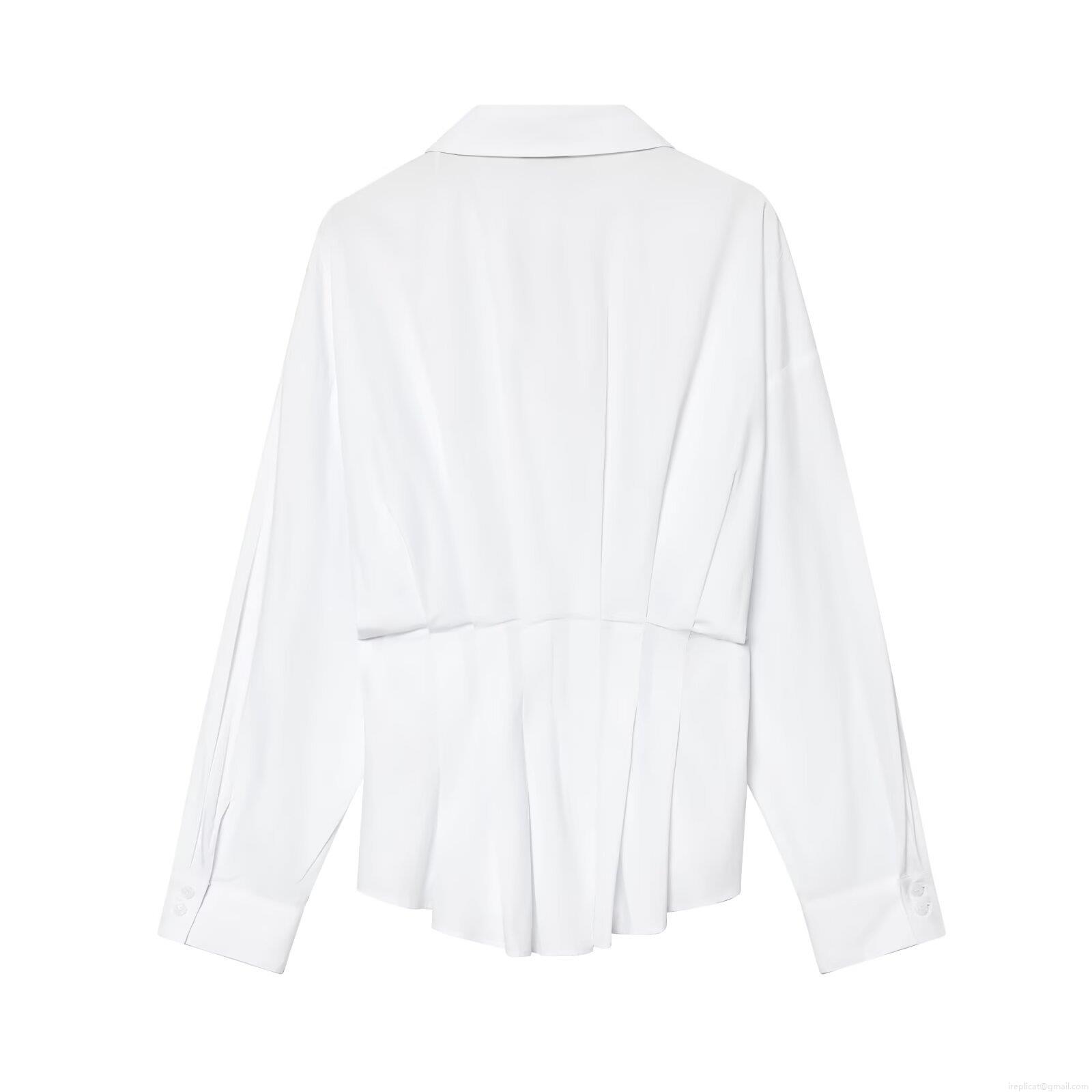 • Women's Elegant Pleated Waist Long Sleeve Poplin Shirt Slim Fit V-Neck Solid Color Blouse for Office Work Business Casual Spring Autumn Fashion