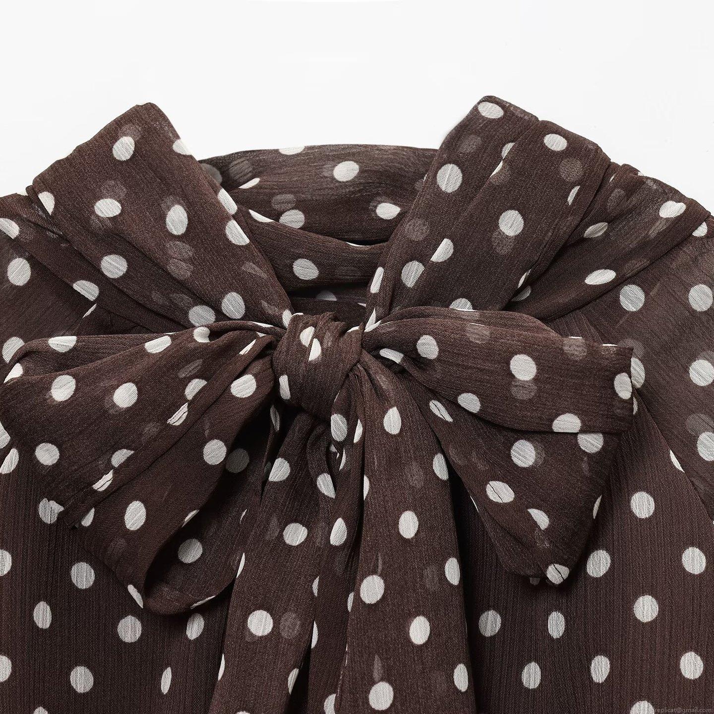 • Women's Elegant Polka Dot Chiffon Blouse Long Sleeve Bow Tie Neck High Collar Casual Office Top Retro Bubble Sleeve Shirts For Women