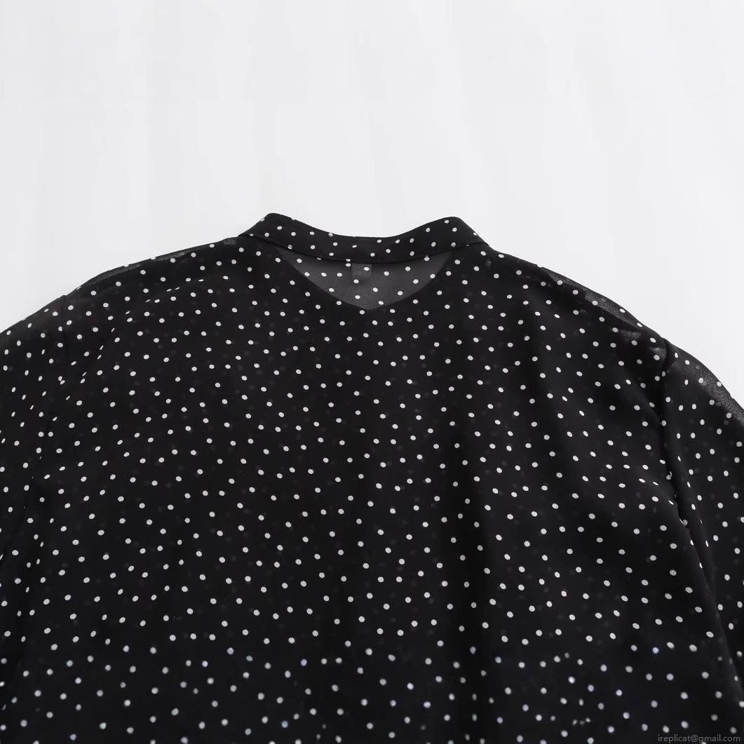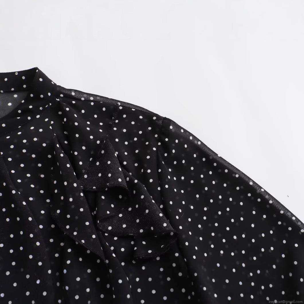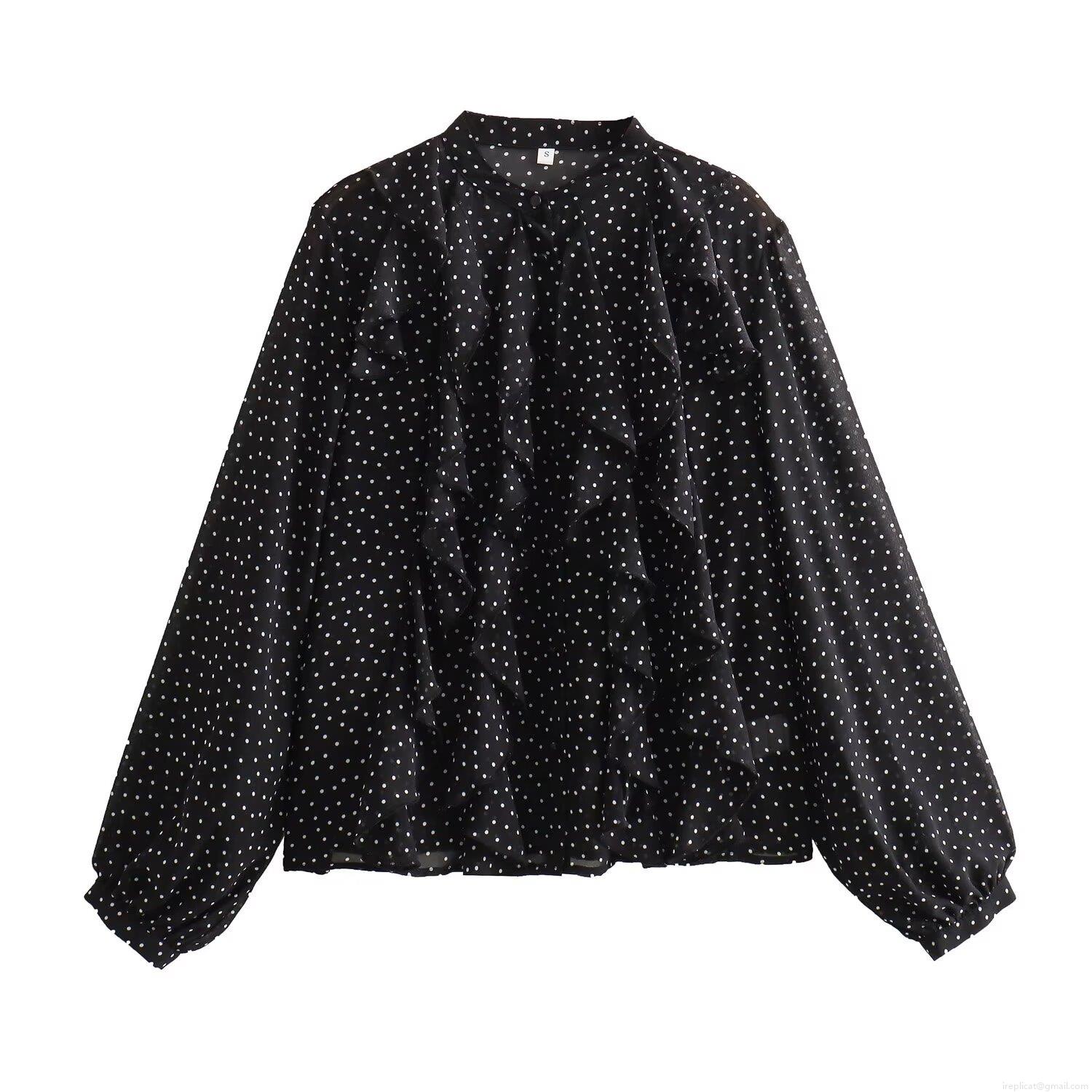 • Women's Elegant Polka Dot Chiffon Shirt Ruffle Trim Long Sleeve Stand Collar Casual Loose Blouse Top for Office Dating
