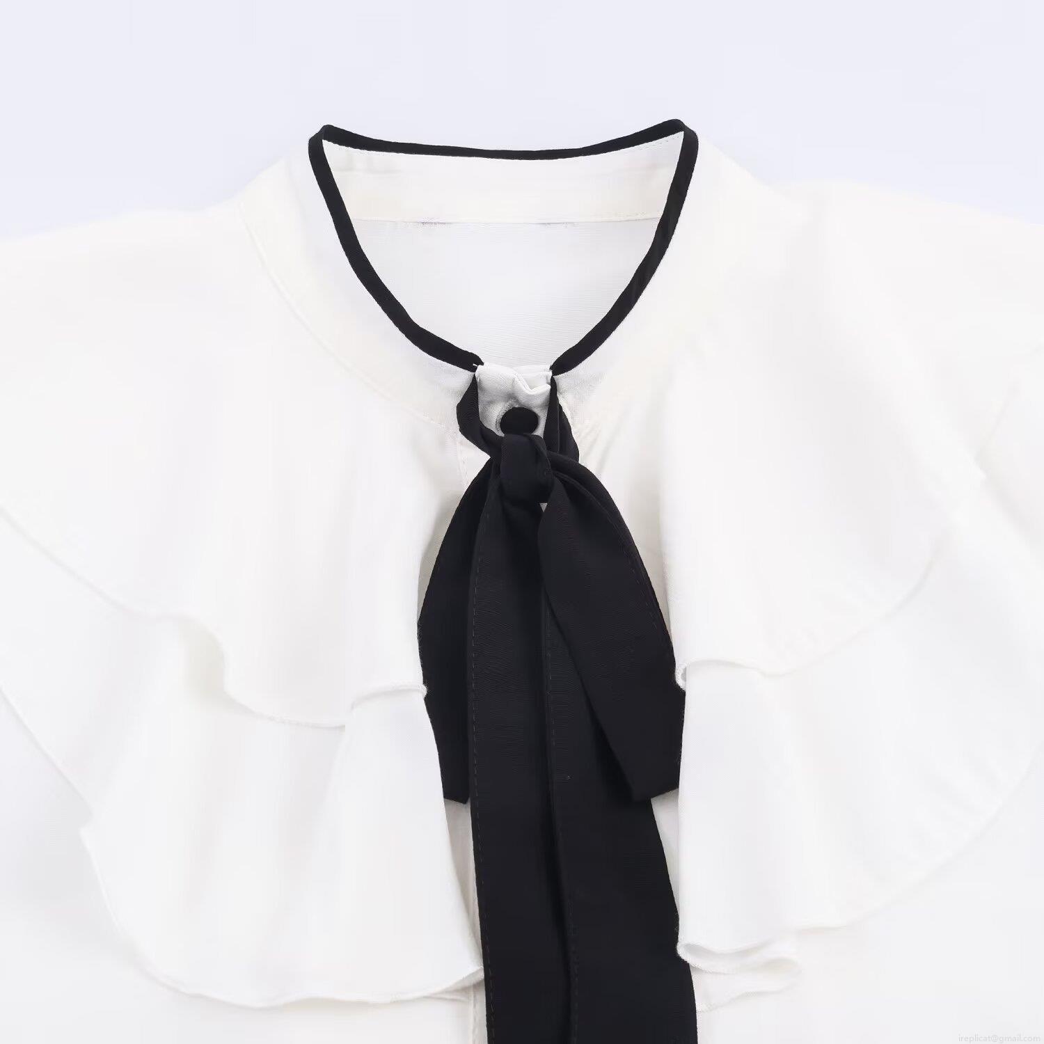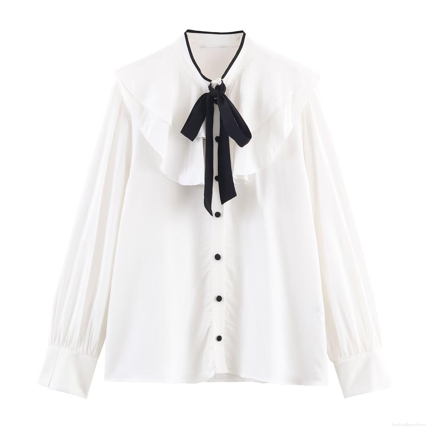 Women's Elegant Polyester Blouse Shirt Contrast Bow Tie Ruffle Trim Long Sleeve Single Breasted Casual Office Daily Tops For Women Ladies