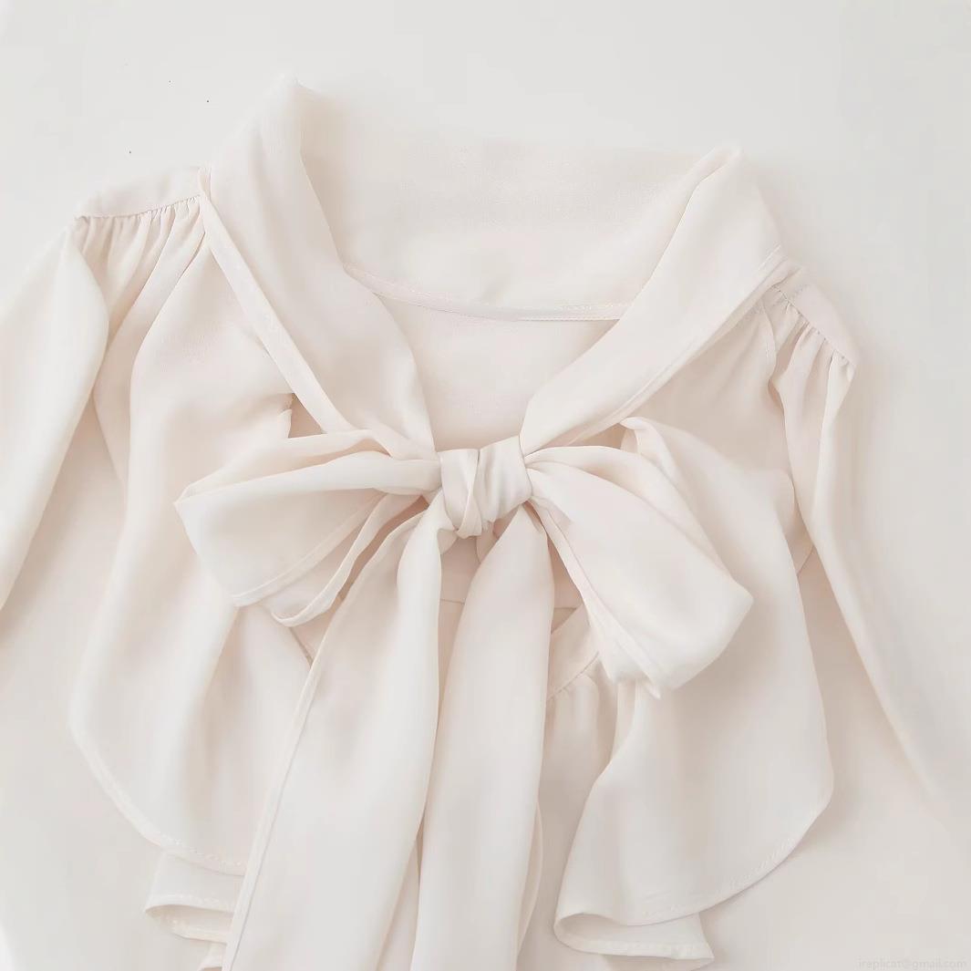 • Women's Elegant Polyester Chiffon Bow Tie Neck Blouse Loose Long Sleeve Shirt with Ruffle Cuffs for Office Party Casual Wear