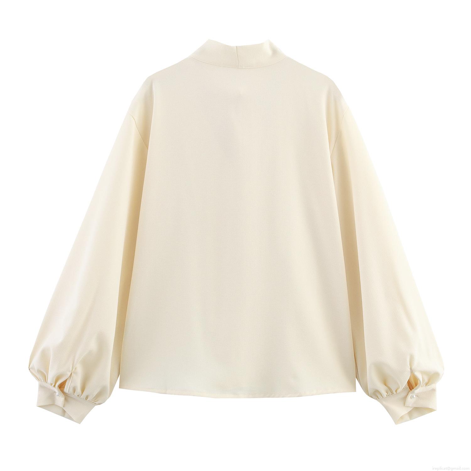 • Women's Elegant Polyester Lace Patchwork Blouse Sweet Bow Tie Neck Lantern Sleeve Shirt With Pearl Button Casual Loose Long Sleeve Top For Lady