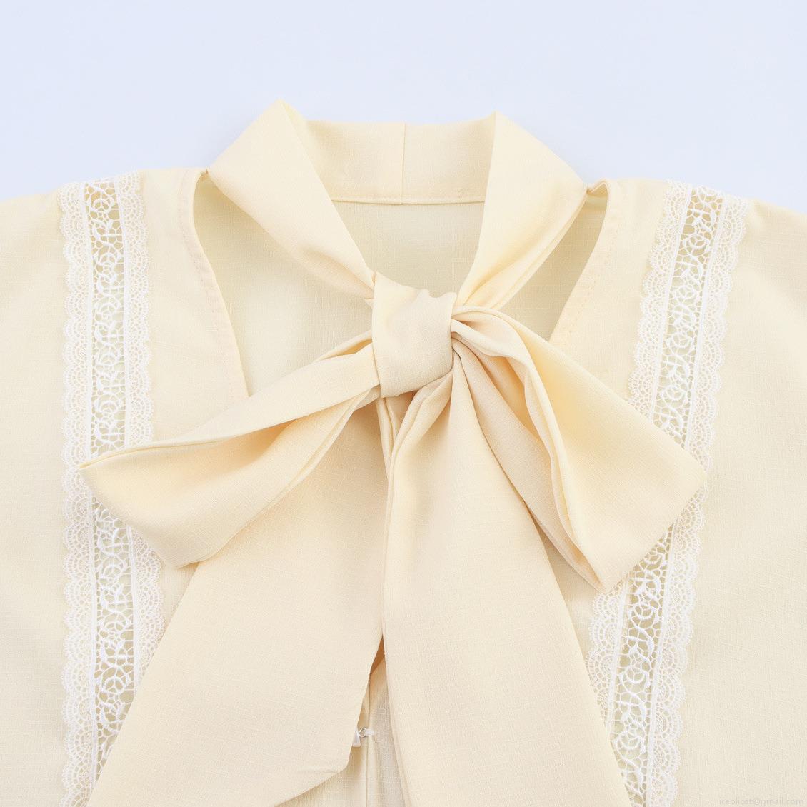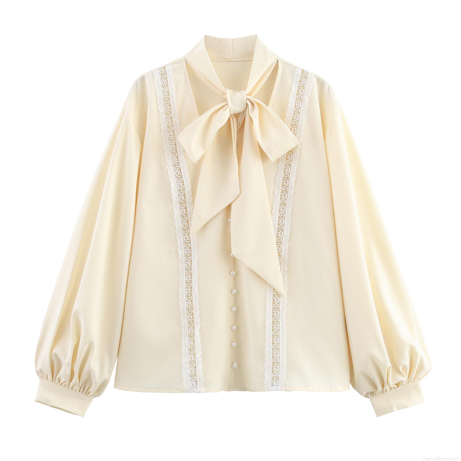 Women's Elegant Polyester Lace Patchwork Blouse Sweet Bow Tie Neck Lantern Sleeve Shirt With Pearl Button Casual Loose Long Sleeve Top For Lady