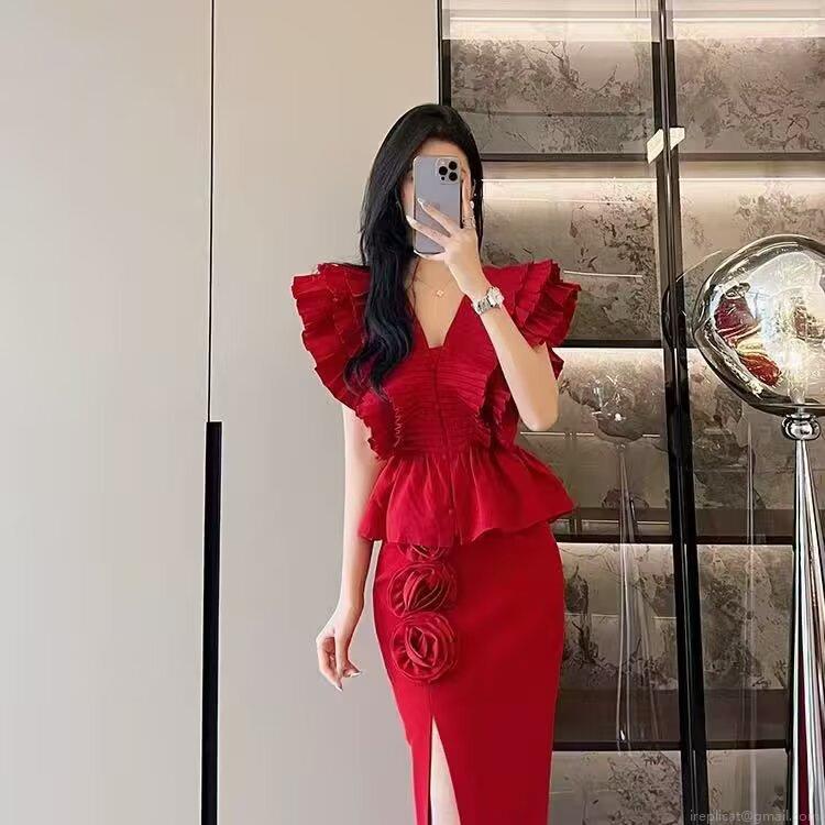 • Women's Elegant Red Pleated Ruffle V-Neck Blouse Sleeveless Peplum Top Sexy Layered Heavy Industry Shirt For Party Summer Fashion