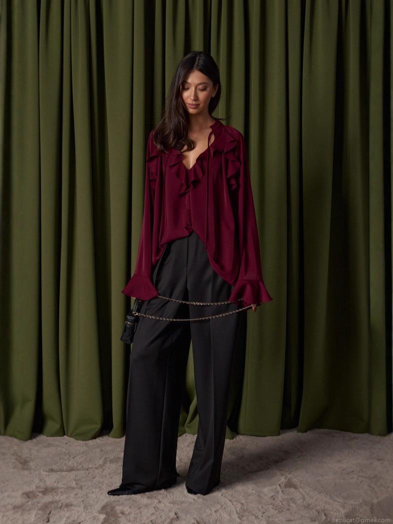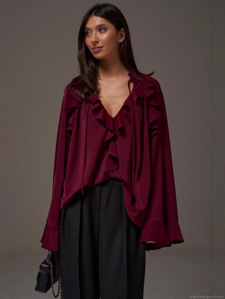 • Women's Elegant Ruffle Blouse Satin Polyester V Neck Flare Sleeve Top For Office Daily Commuting Casual Loose Shirt