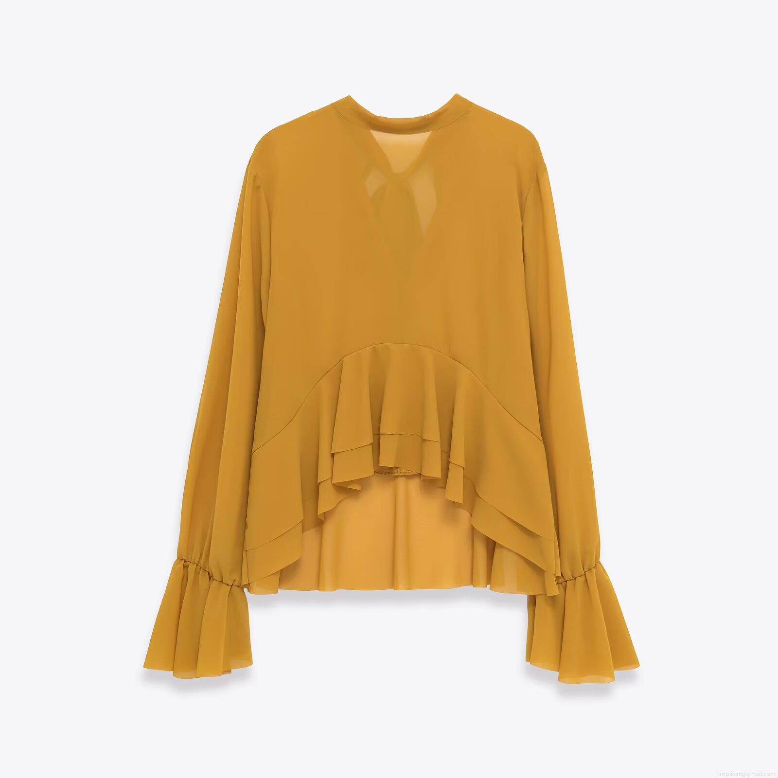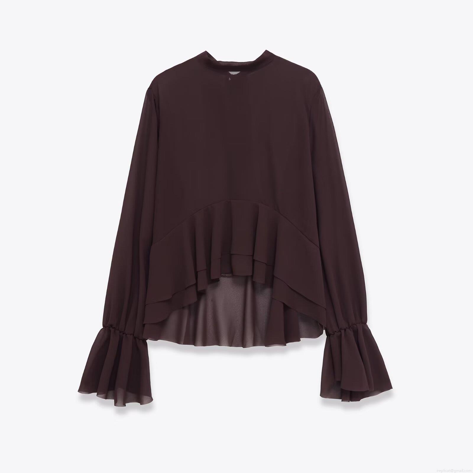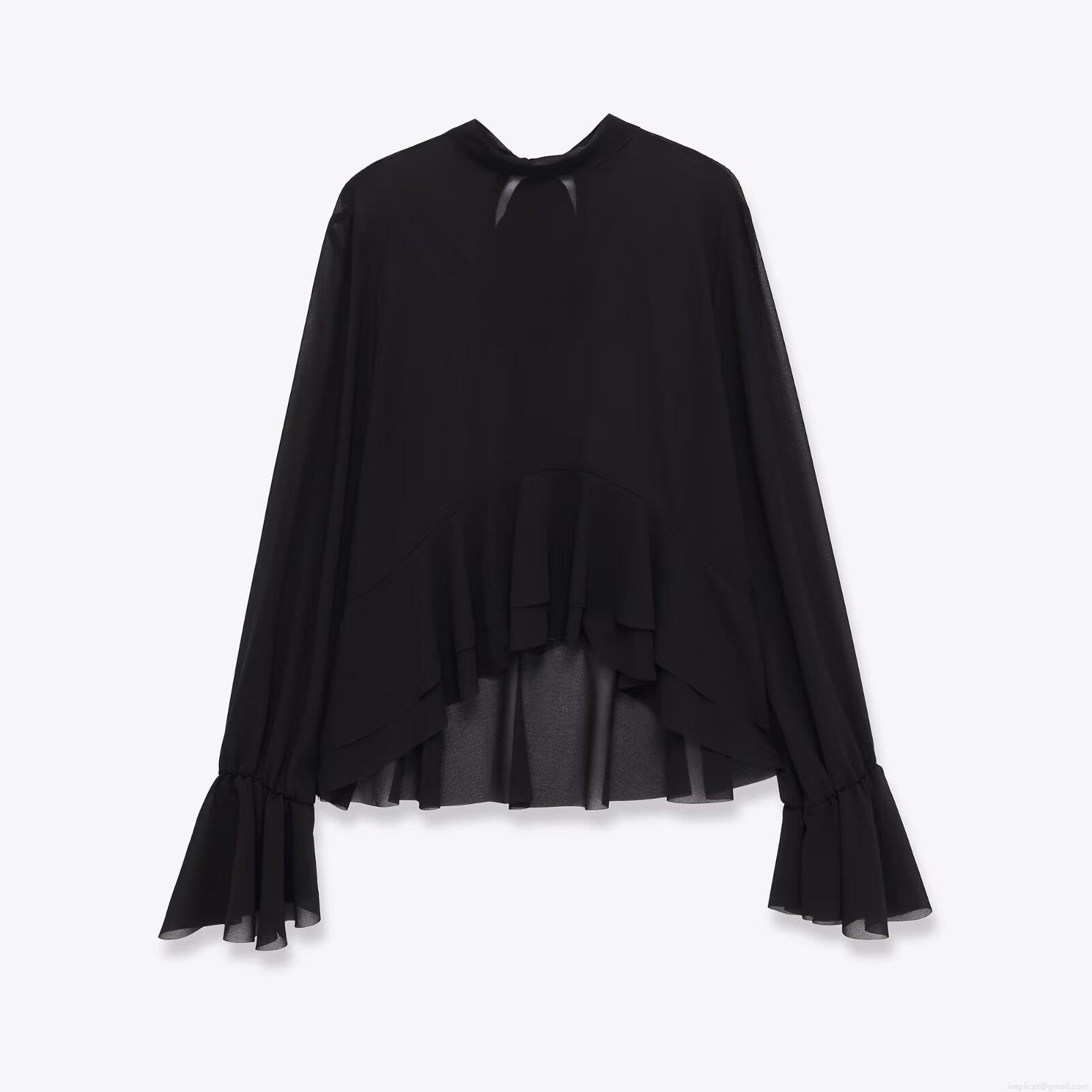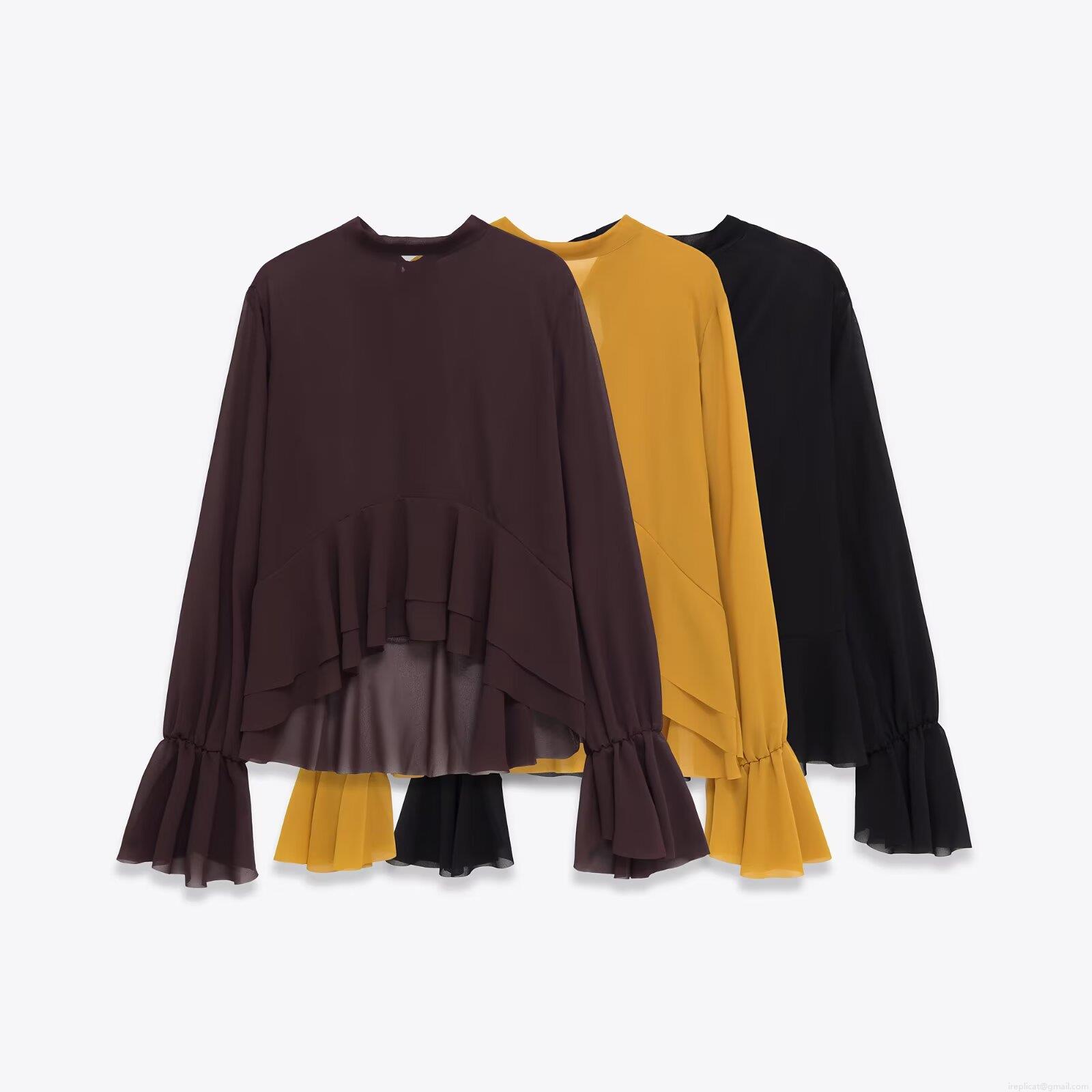 • Women's Elegant Ruffle Flare Sleeve Chiffon Blouse Solid Color Round Neck Layered Design Long Sleeve Pullover Tops For Casual Party Daily Wear