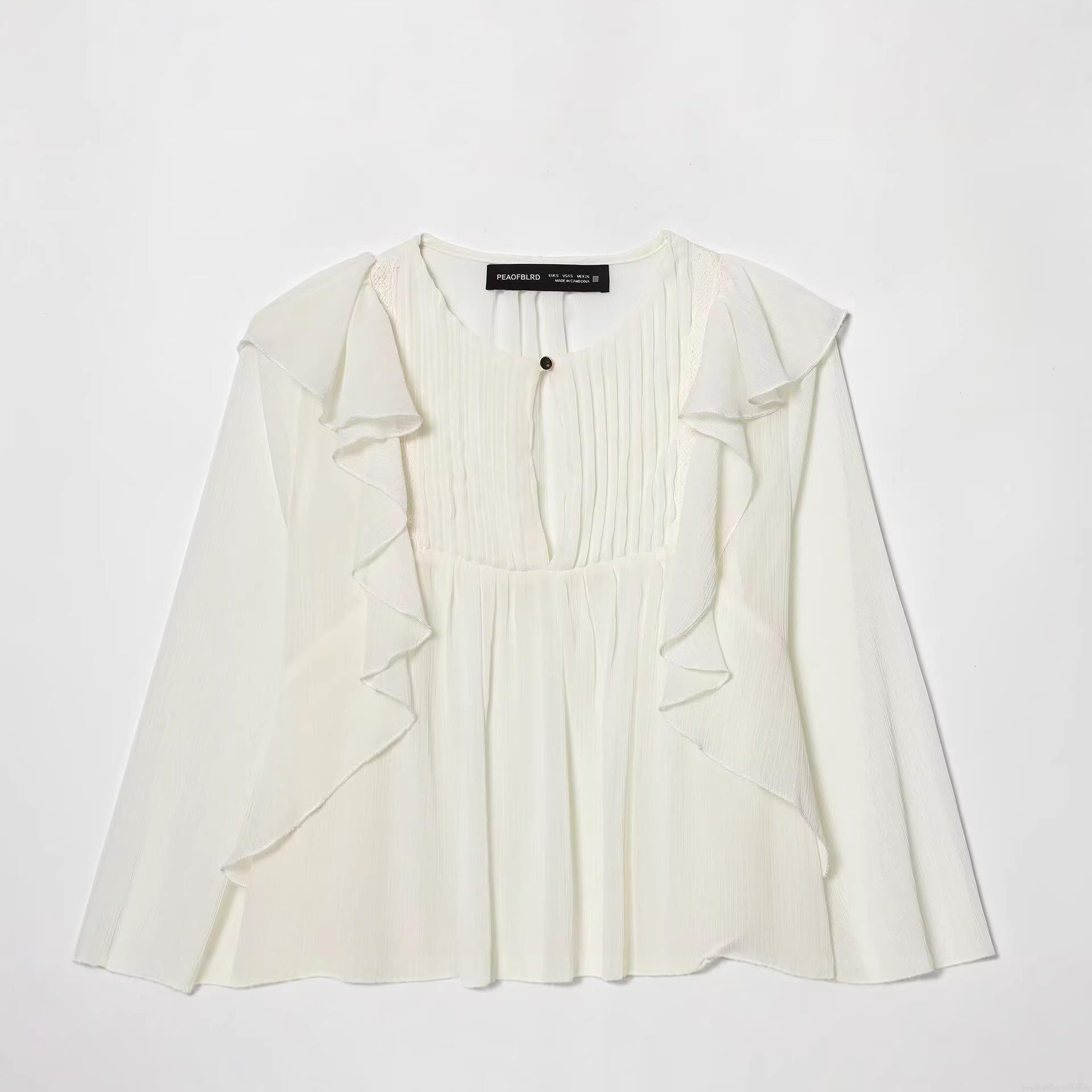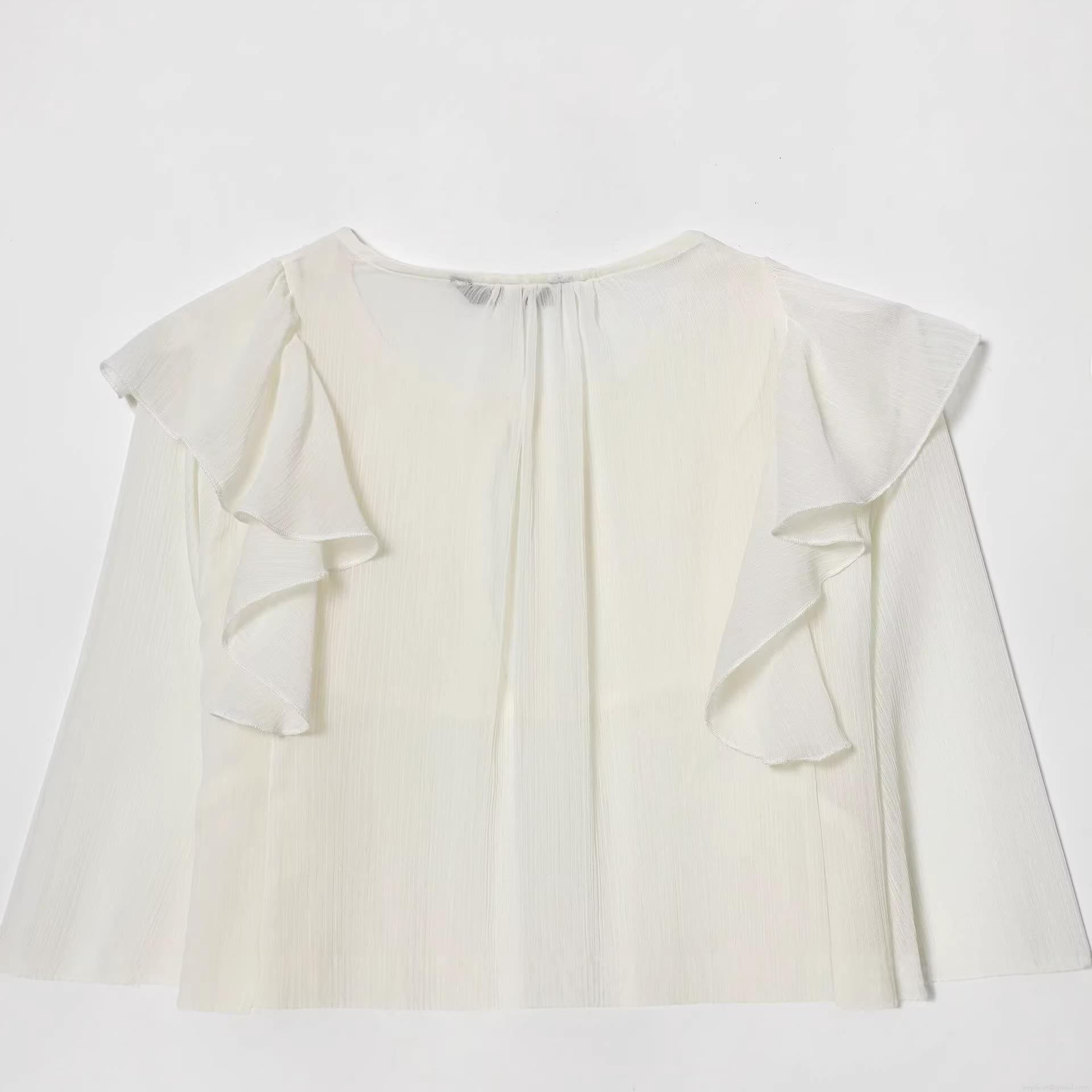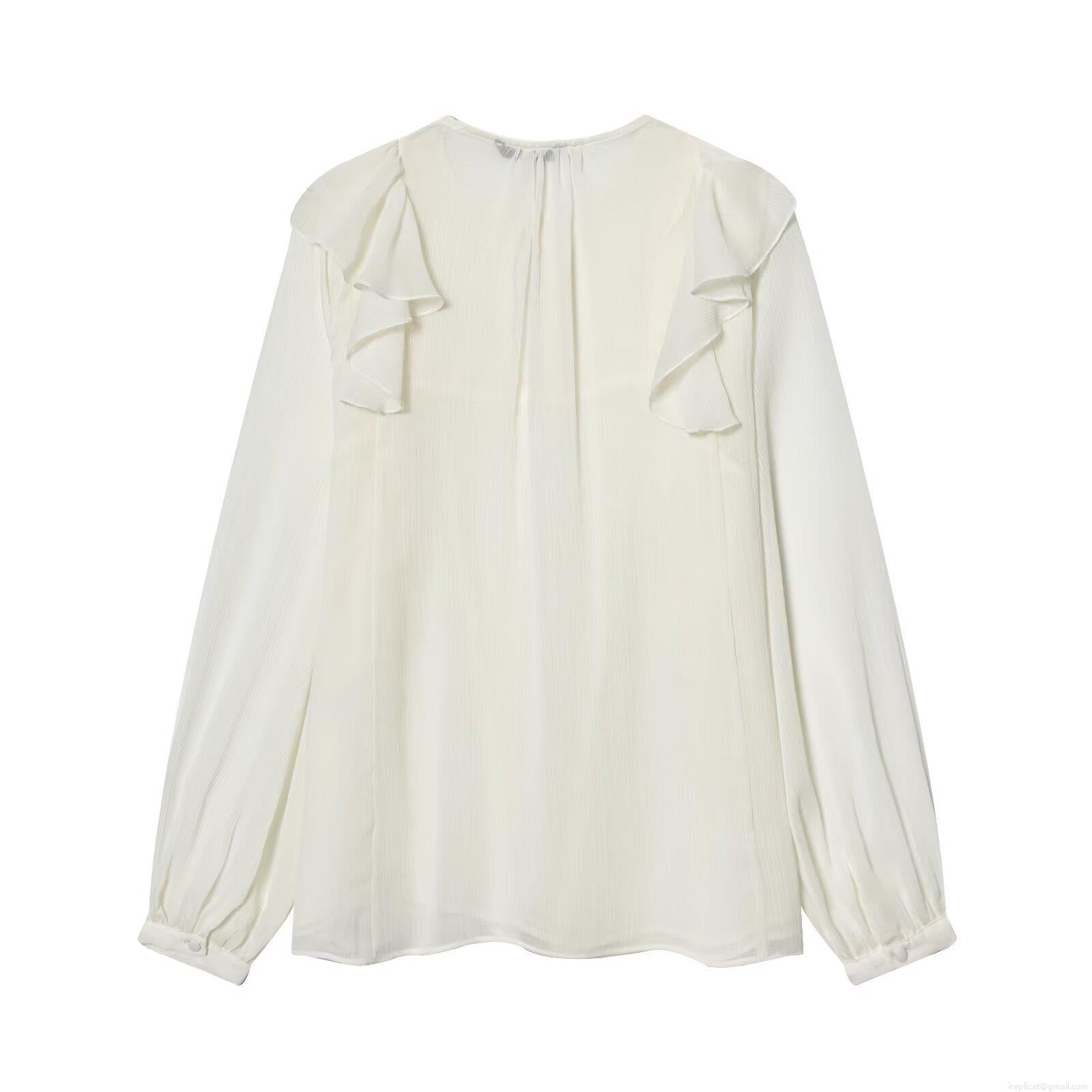• Women's Elegant Ruffle Long Sleeve Blouse Off White Polyester Cotton Blend Pleated Round Neck Pullover Shirt Stylish Streetwear Fashion Tops