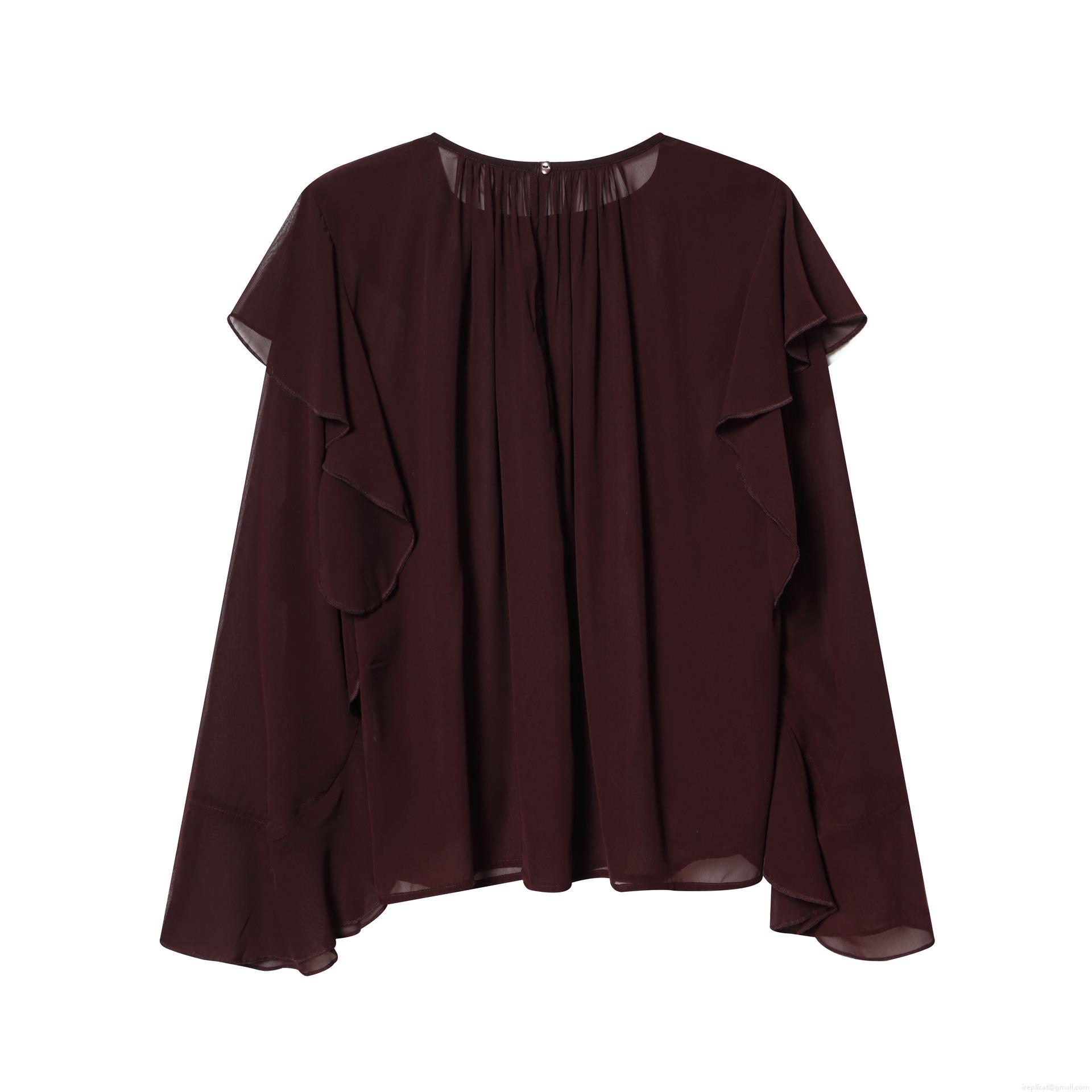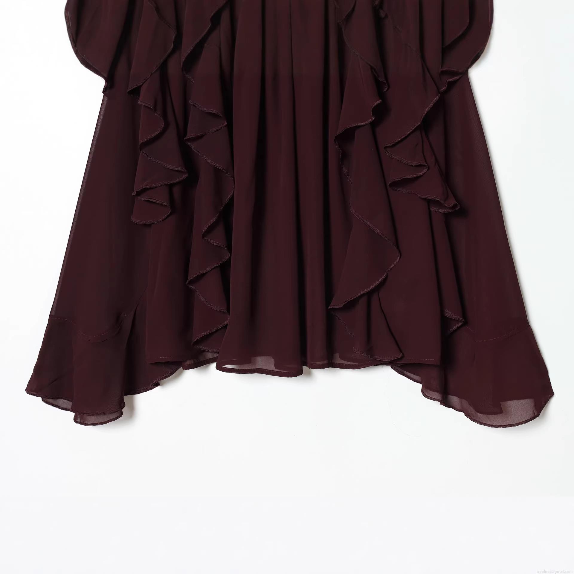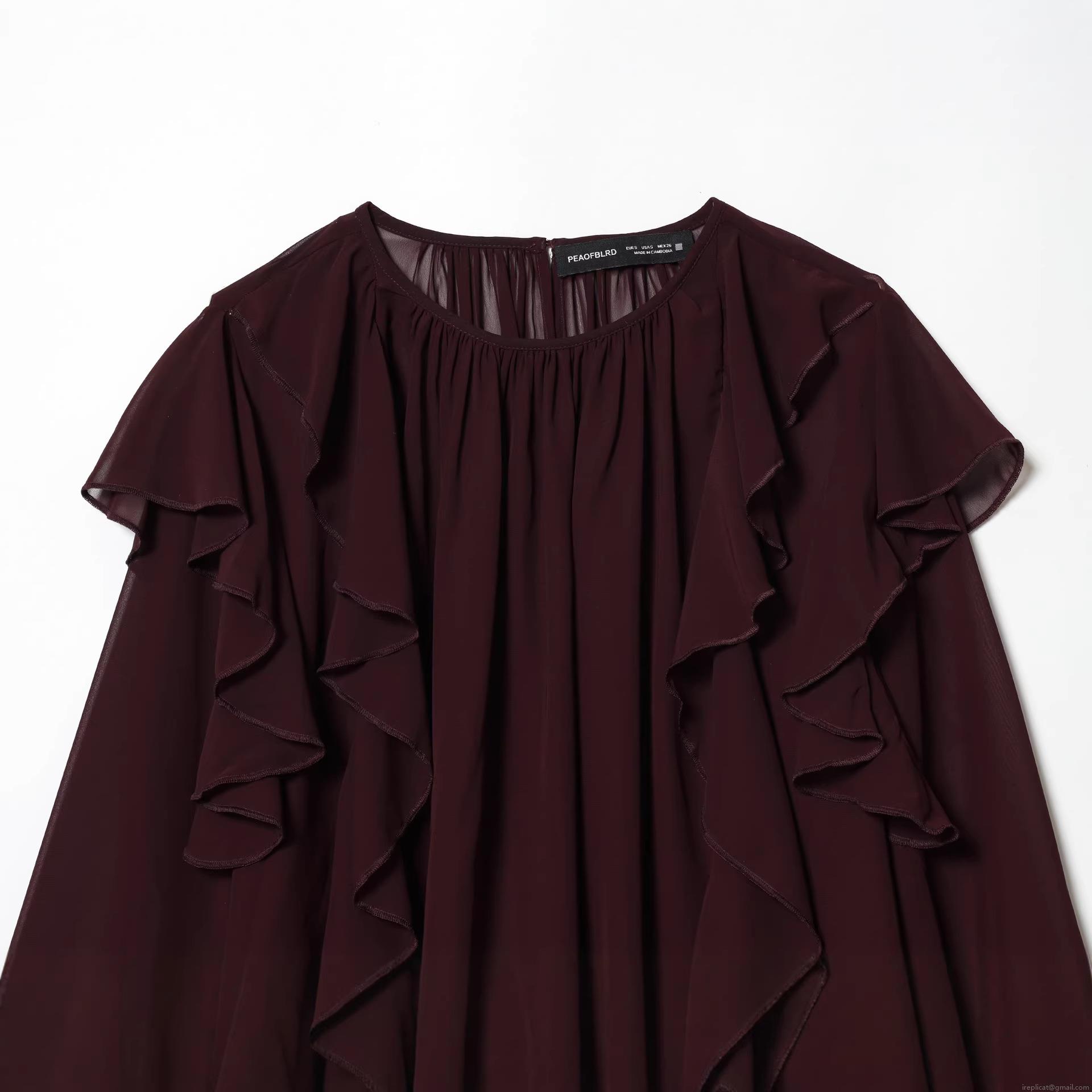 • Women's Elegant Ruffle Long Sleeve Chiffon Blouse Fashion Solid Color Pullover Top For Daily Office Lady Style Burgundy Coffee Shirt