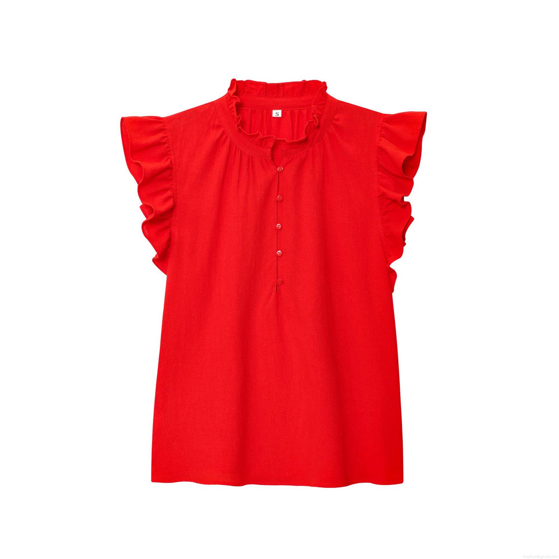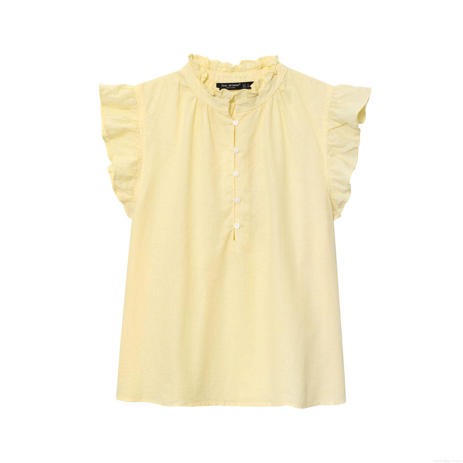 • Women's Elegant Ruffle Short Sleeve Blouse Stand Collar Button Down Shirt 100% Polyester Cotton Feel Summer Casual Solid Striped Tops for Lady