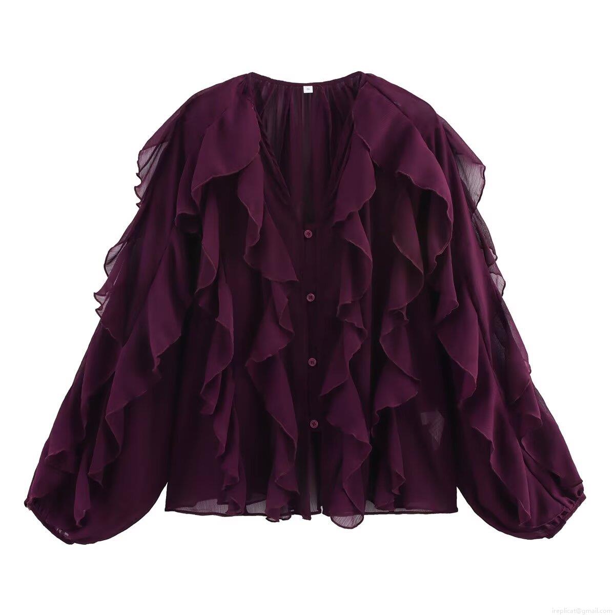 • Women's Elegant Ruffle Trim Chiffon Blouse V Neck Long Lantern Sleeve Solid Color Button Down Shirt Casual Lightweight Polyester Tops for Dating Office