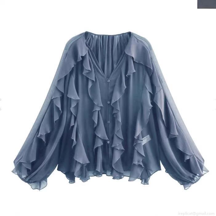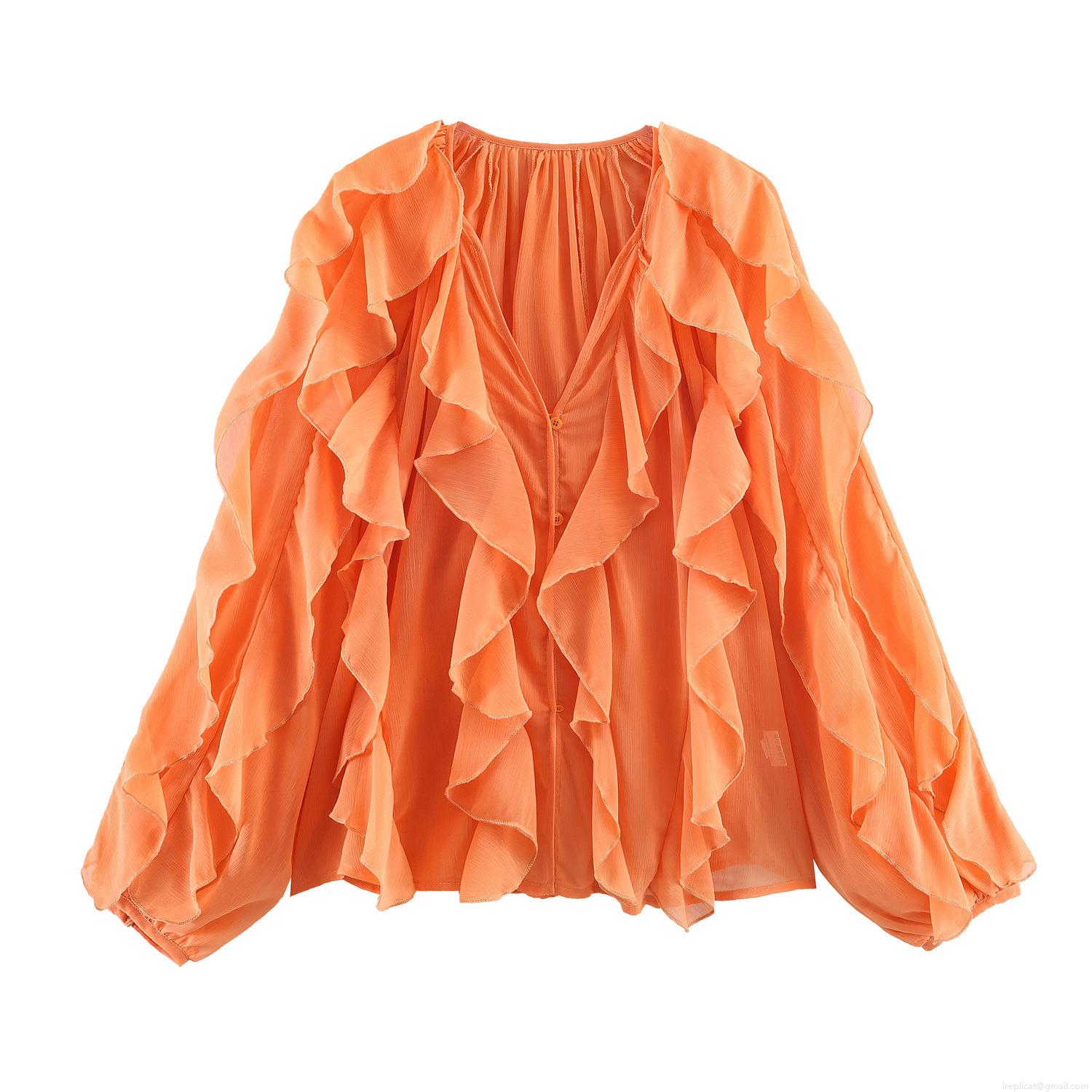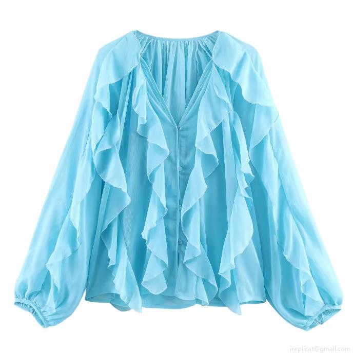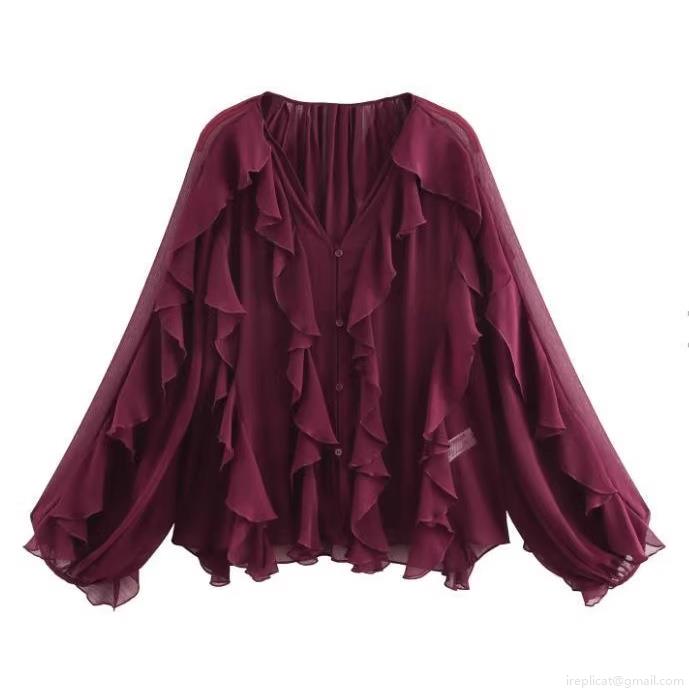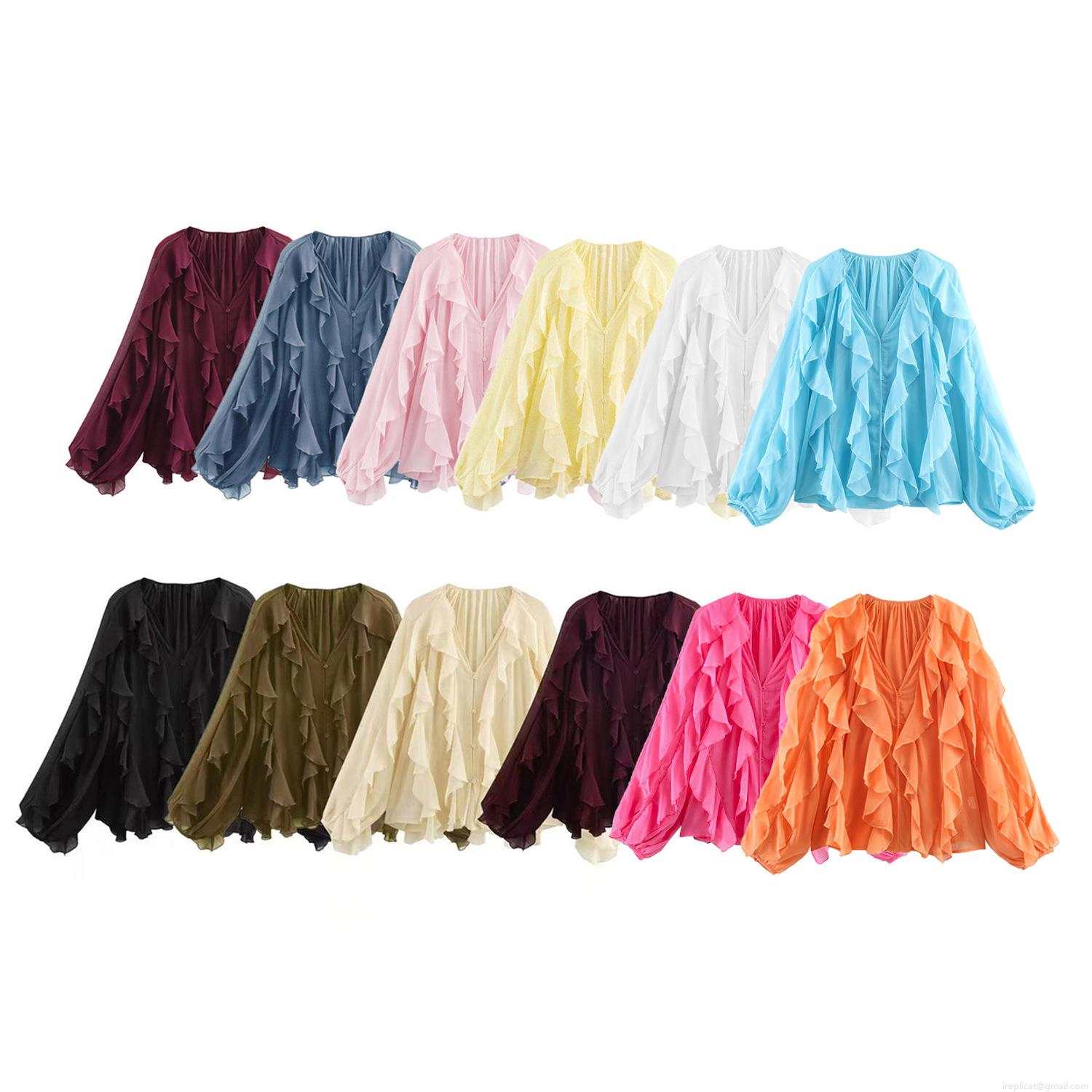 • Women's Elegant Ruffle V Neck Chiffon Blouse Long Sleeve Layered Solid Color Shirt Casual Chic Tops For Lady Party Dating