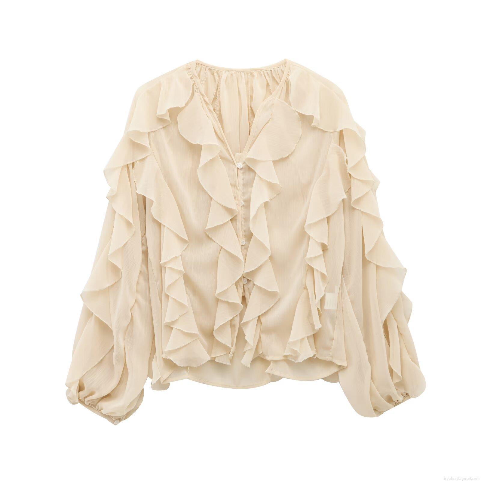 • Women's Elegant Ruffle V-Neck Long Sleeve Chiffon Blouse Casual Loose Floral Print Patchwork Button Down Shirt For Daily Vacation Streetwear Ladies Top