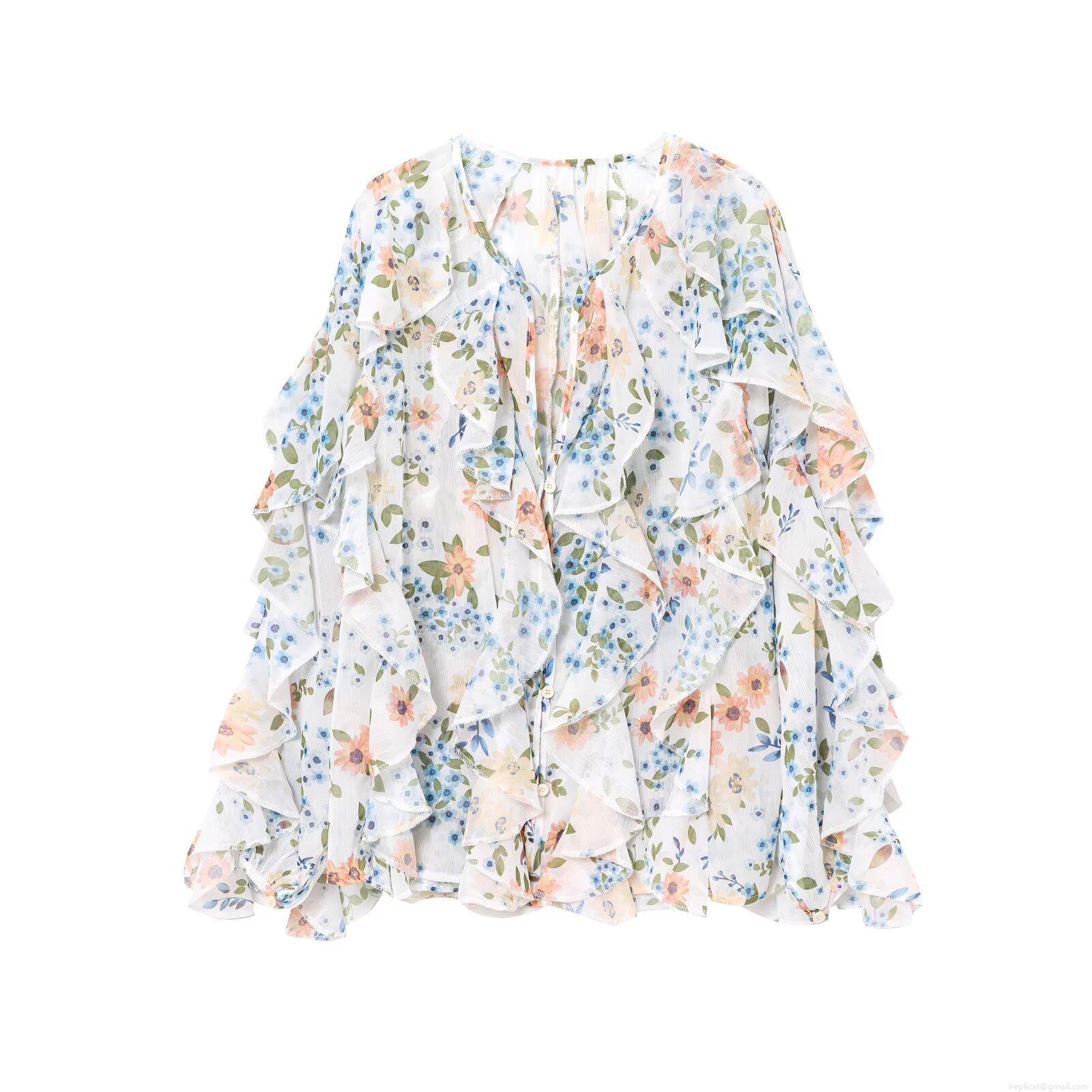 Women's Elegant Ruffle V-Neck Long Sleeve Chiffon Blouse Casual Loose Floral Print Patchwork Button Down Shirt For Daily Vacation Streetwear Ladies Top