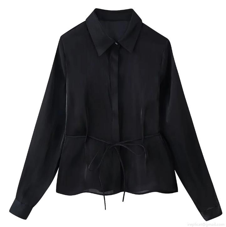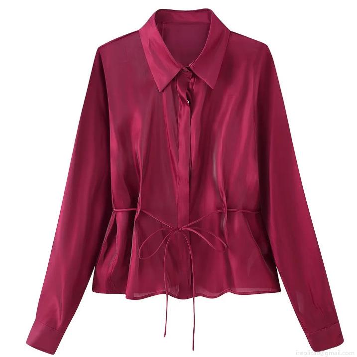 • Women's Elegant Satin Blouse Long Sleeve Button Down Shirt With Bow Tie Waist Shiny Solid Color 100% Polyester Office Lady Tops For Women