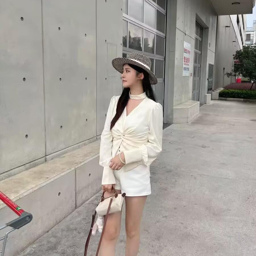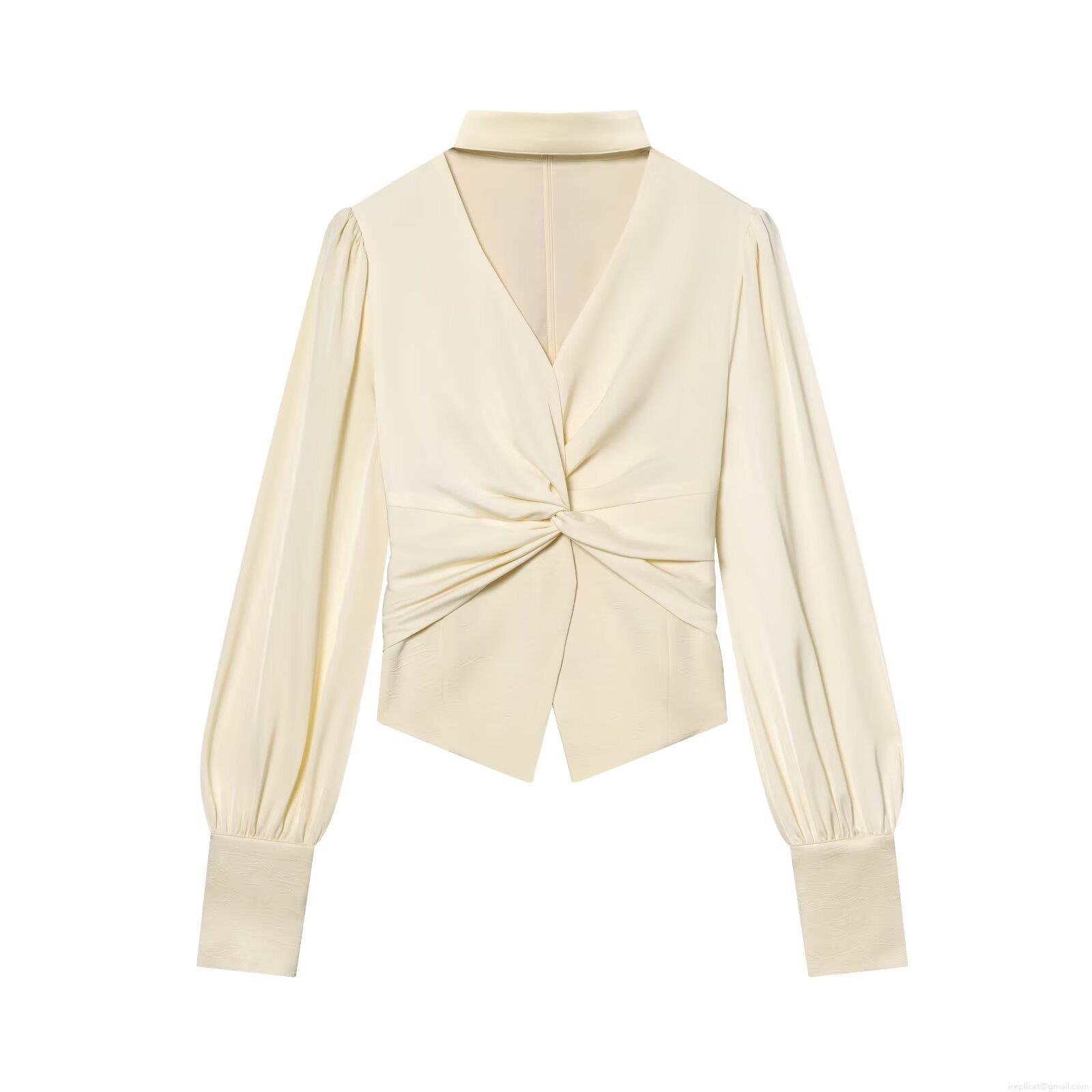 • Women's Elegant Satin Blouse Sexy V-Neck Twist Knot Front Long Puff Sleeve Shirt For Office Commute Party Ruched Wrap Top
