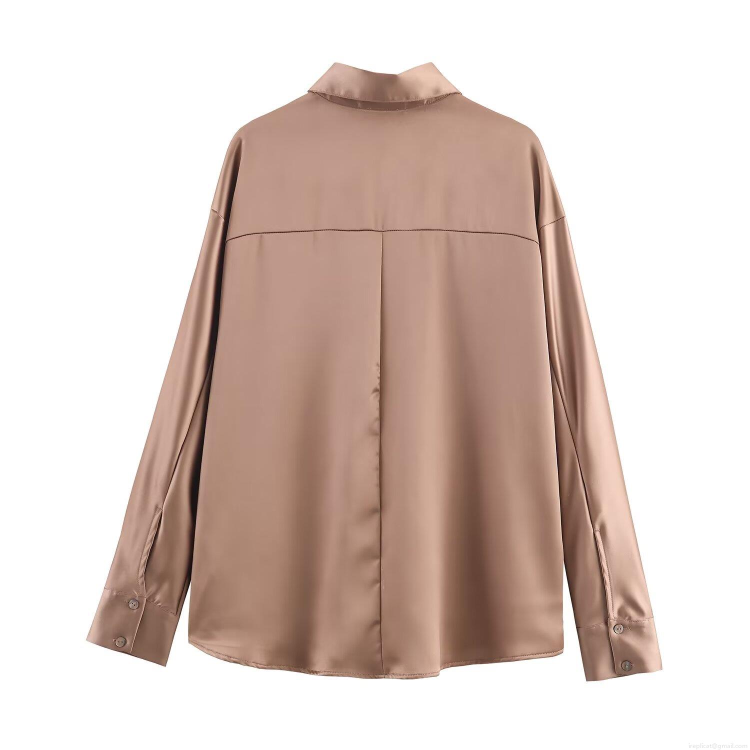 • Women's Elegant Satin Blouse Silk Texture Long Sleeve Button Down Shirt Loose Fit Solid Color Camel Bronze Top For Office Commute Daily Wear