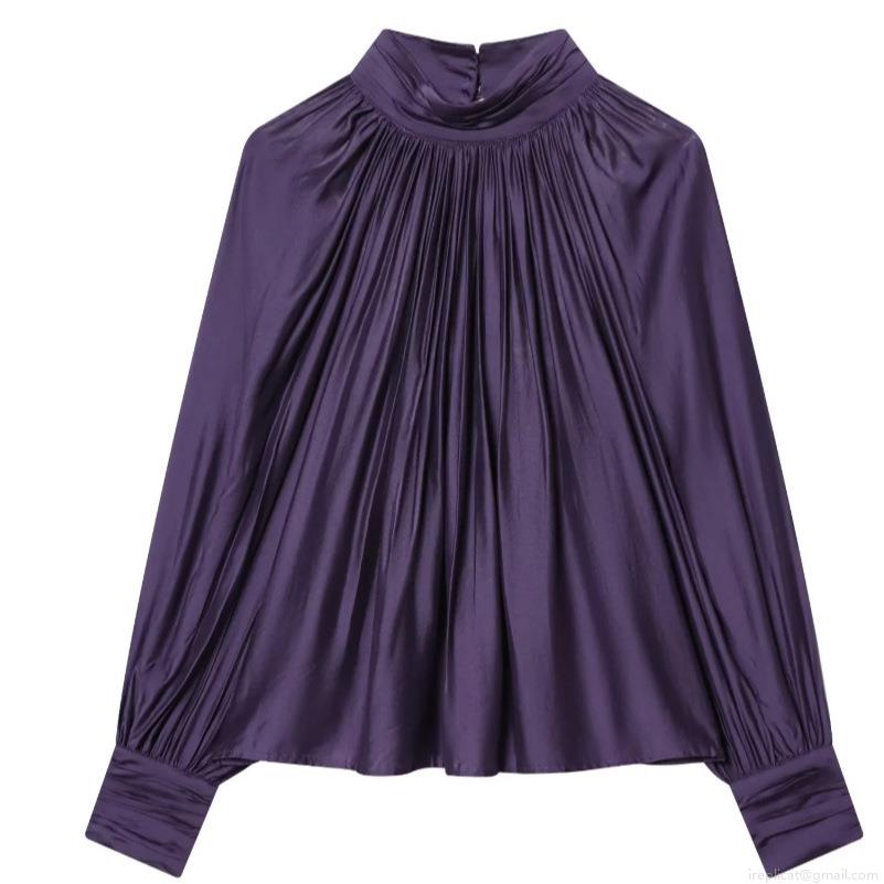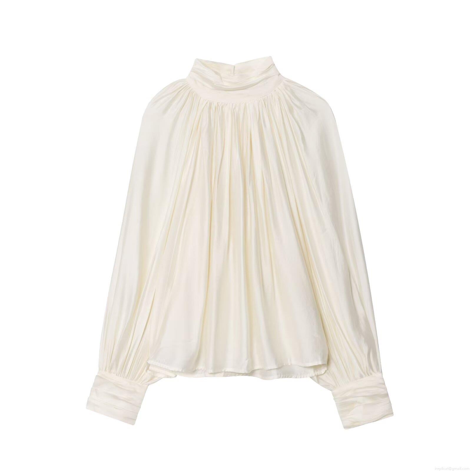 • Women's Elegant Satin Blouse Stand Collar Pleated Lantern Sleeve Pullover Top Long Sleeve Solid Color Fashion Shirt for Party Office Lady
