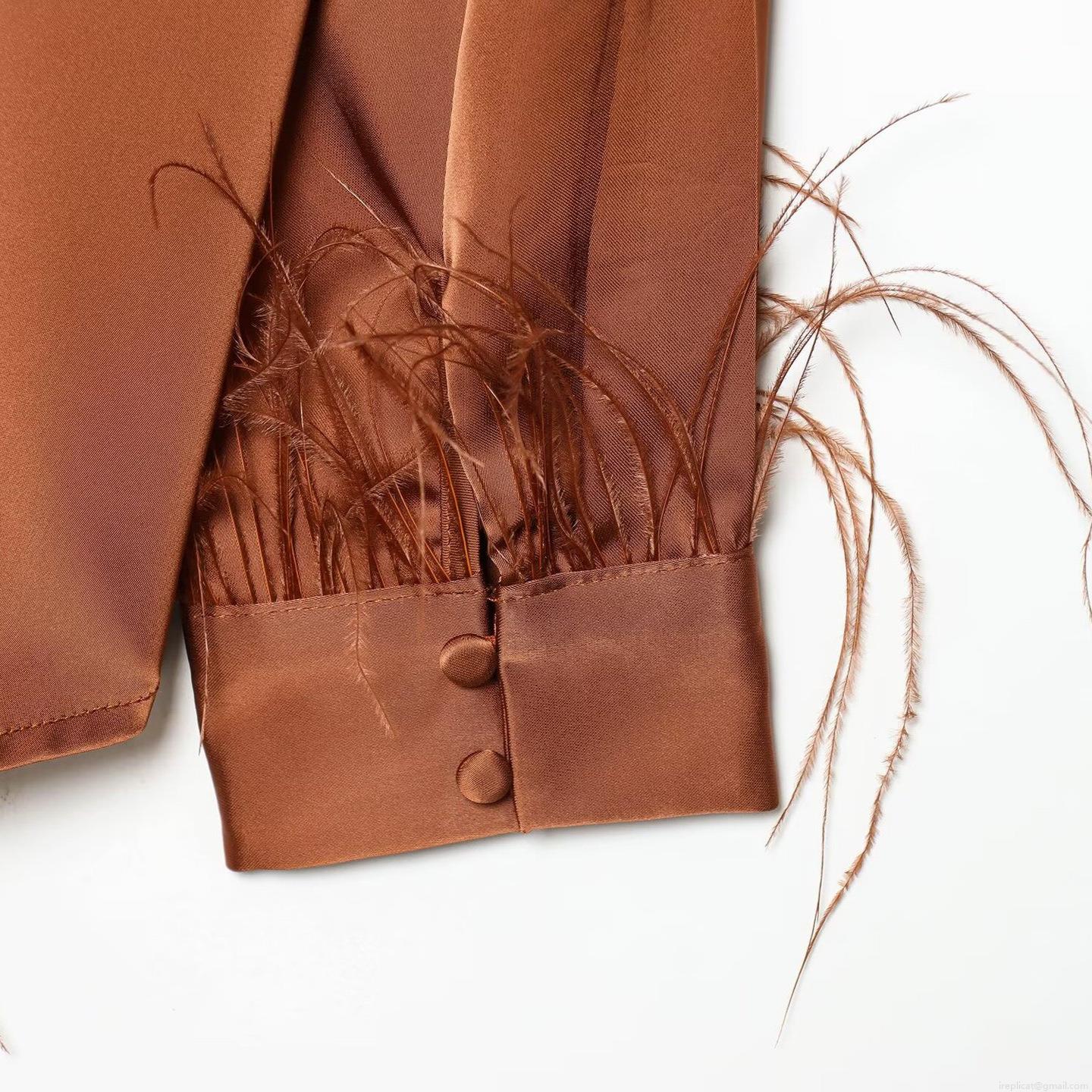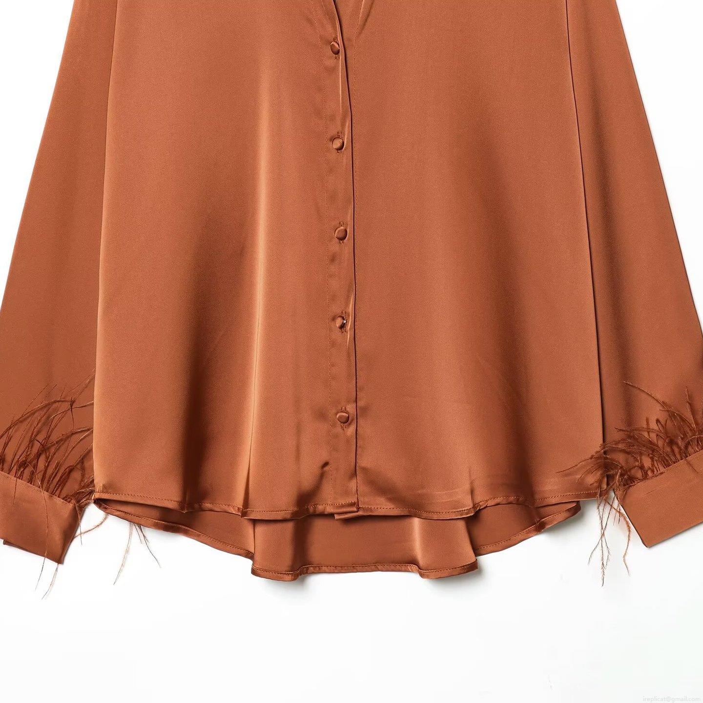 Women's Elegant Satin Long Sleeve Blouse With Feather Trim Cuffs Solid Color Button Down Shirt Collar Party Evening Fashion Casual Top