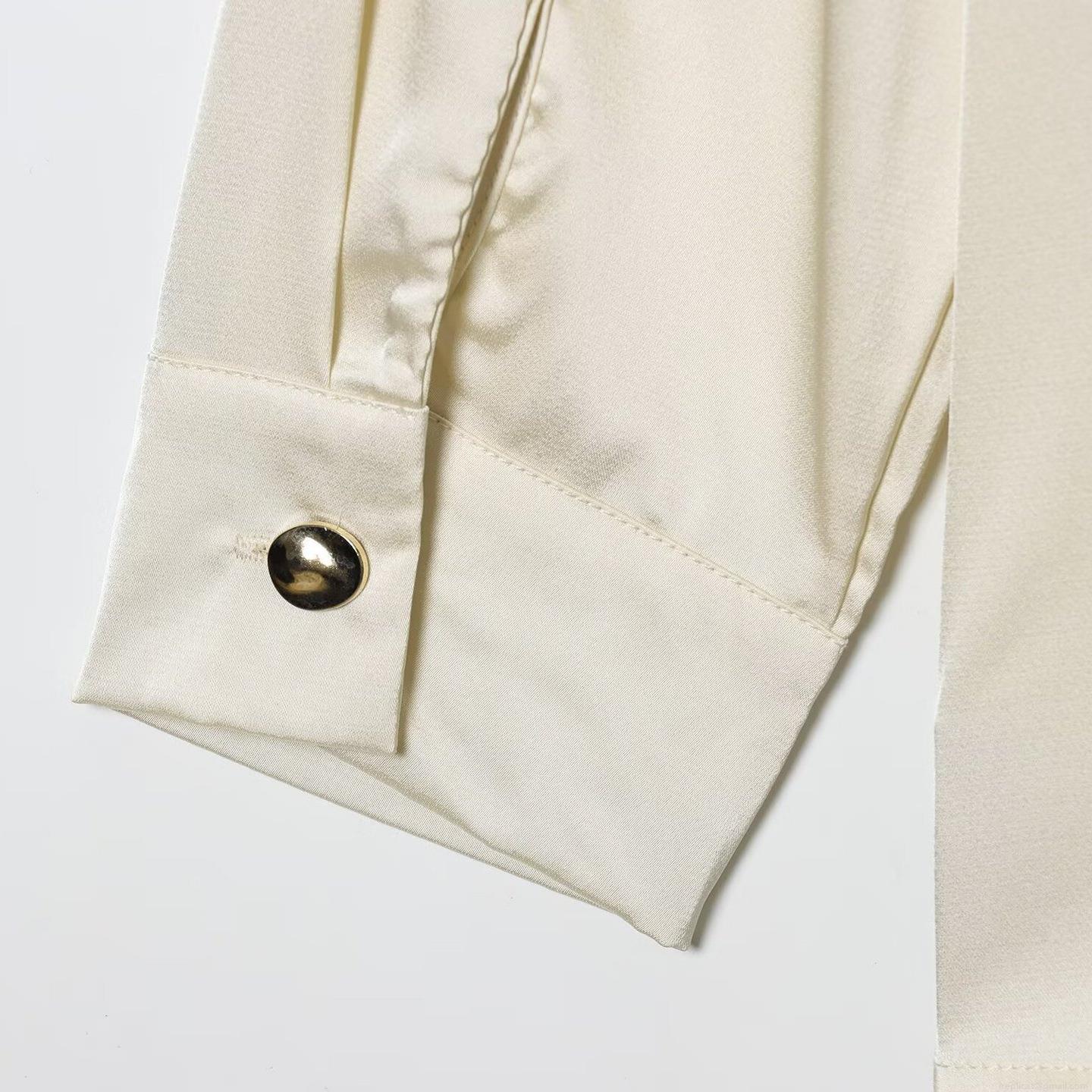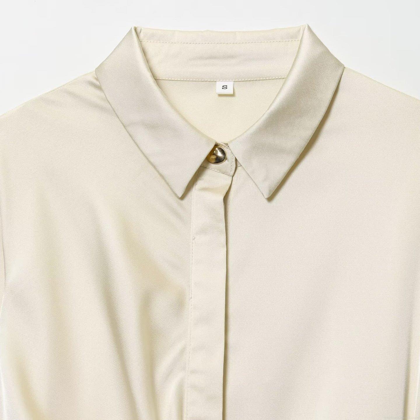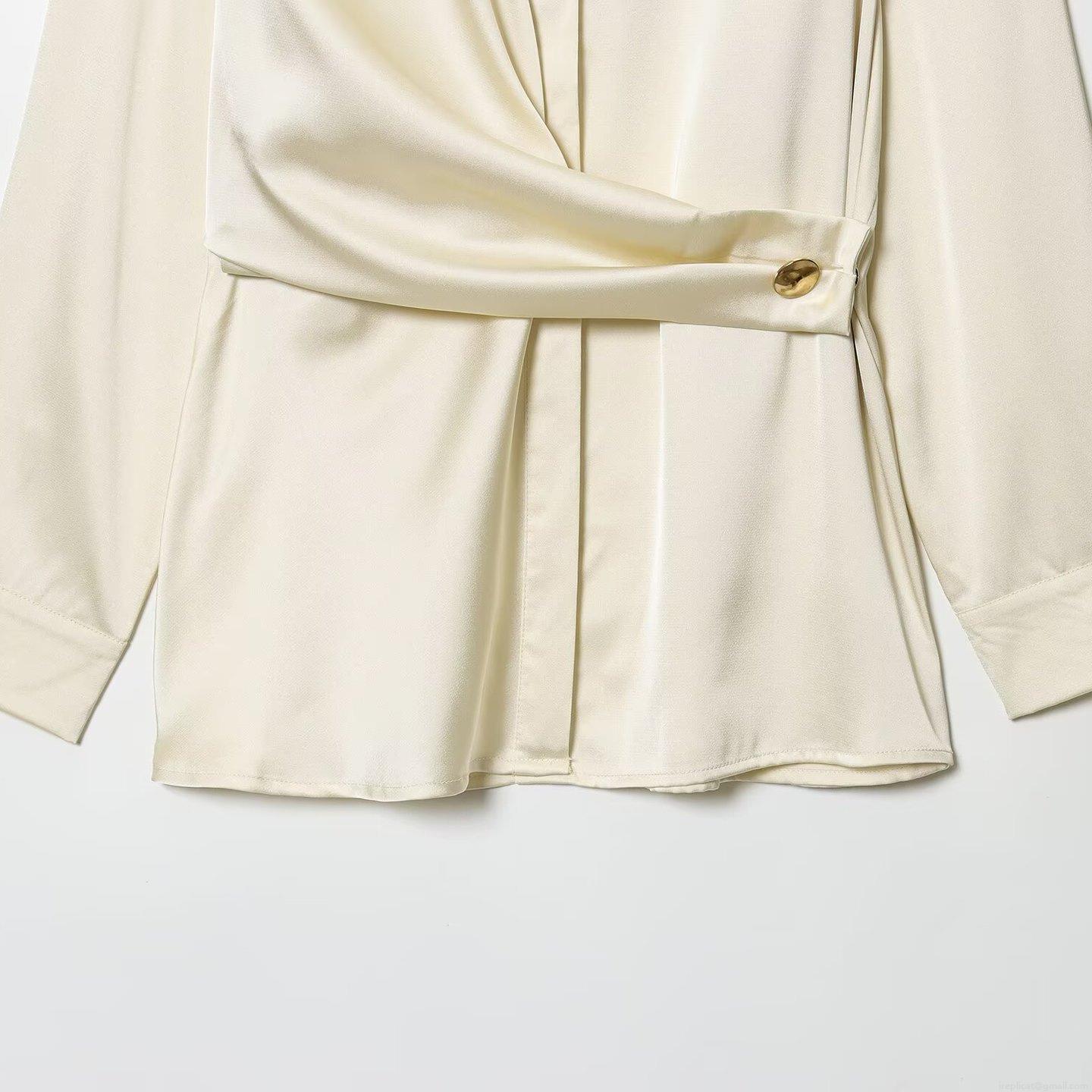 • Women's Elegant Satin Silk Blouse Lapel Long Sleeve Twist Front Pleated Shirt With Gold Button Office Commute Solid Color Tops