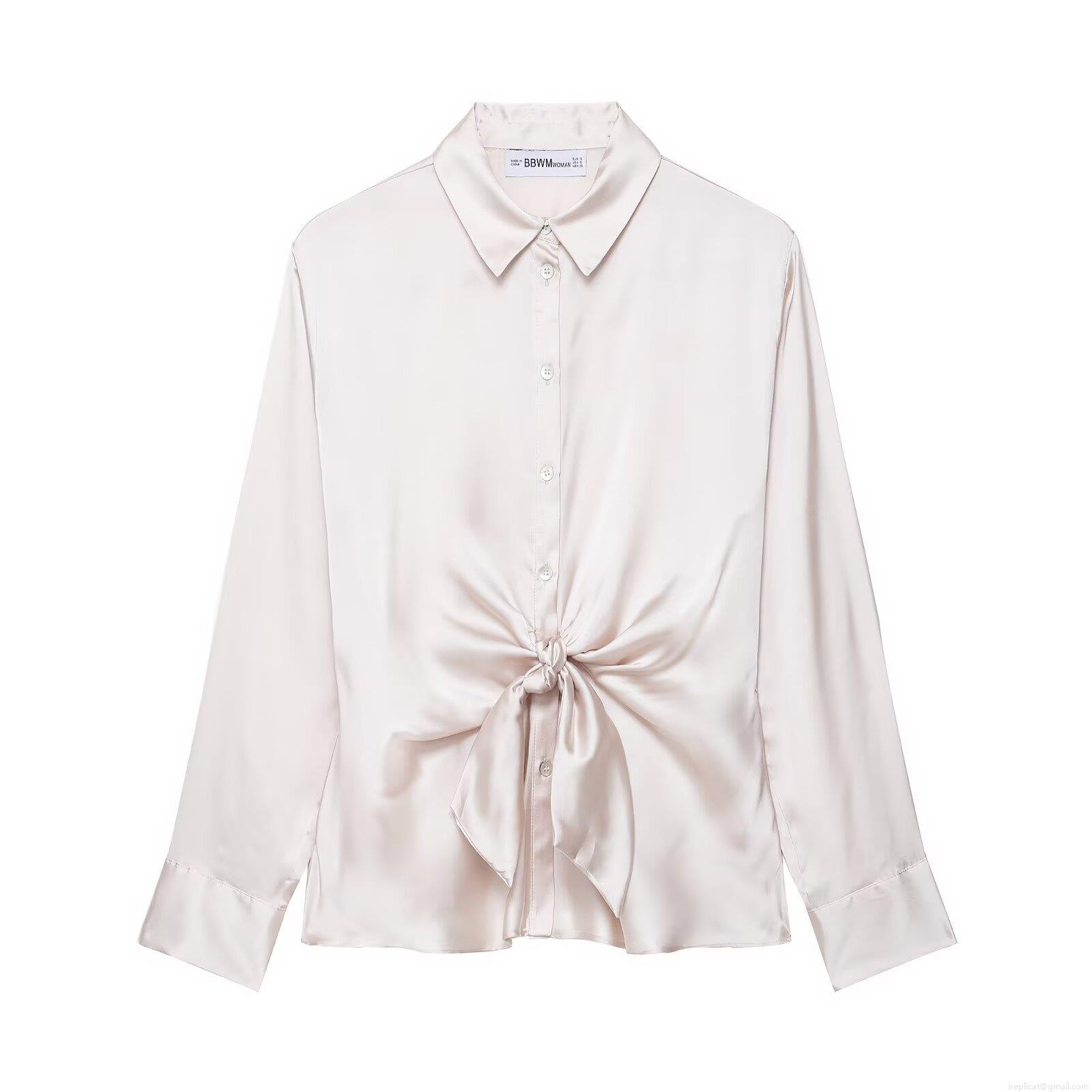 • Women's Elegant Satin Silk Like Blouse Long Sleeve Tie Knot Waist Casual Shirt For Party Dating Work Office Lady Top