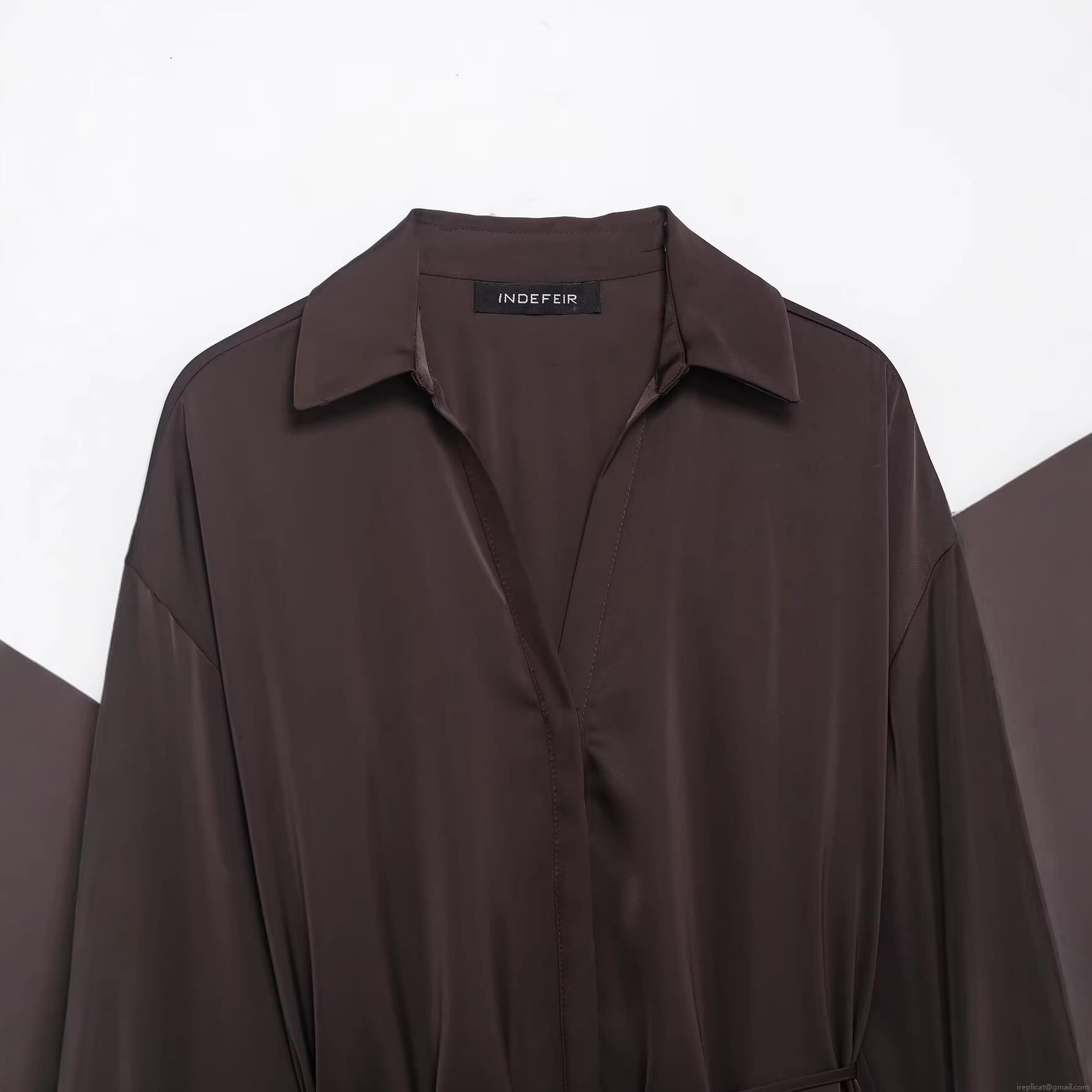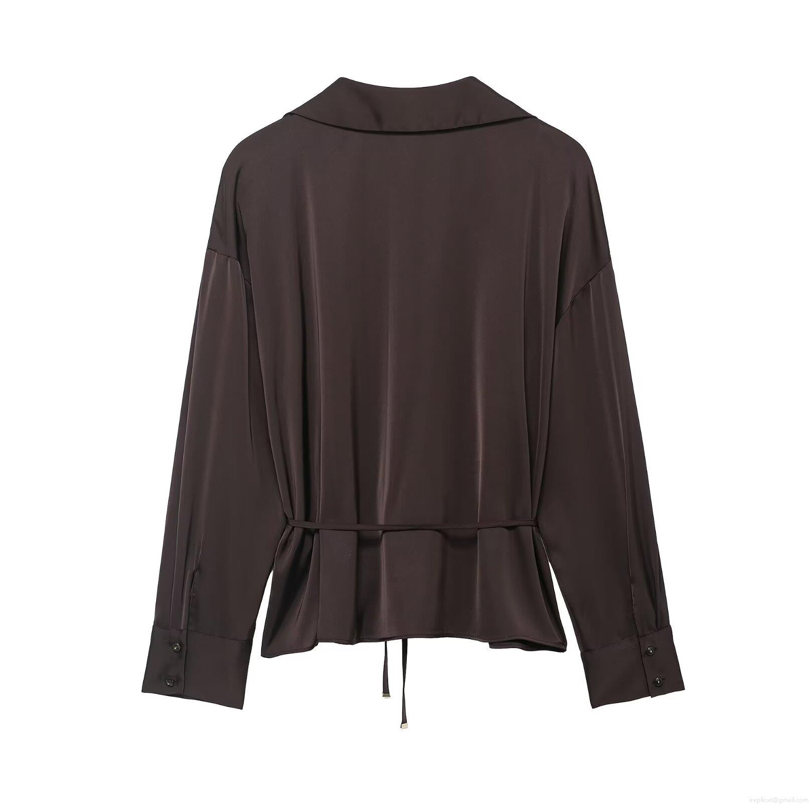 Women's Elegant Satin Silk-Like Shirt Long Sleeve V-Neck Blouse With Belt Drawstring Waist Coffee Solid Color Tops For Party Office