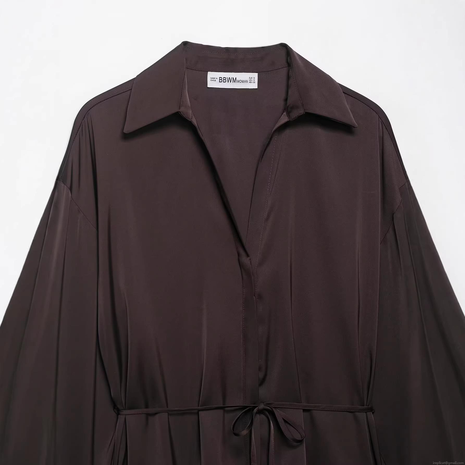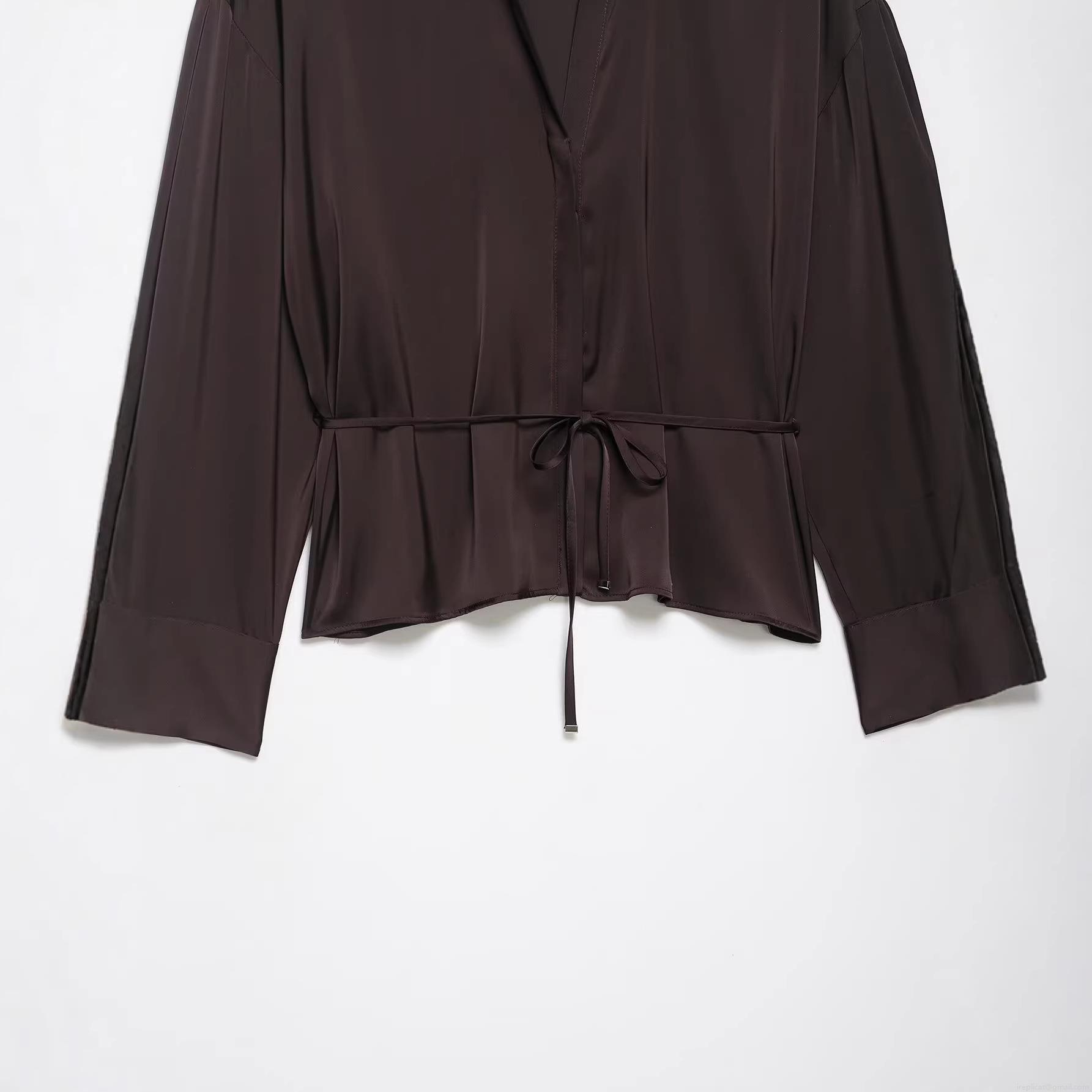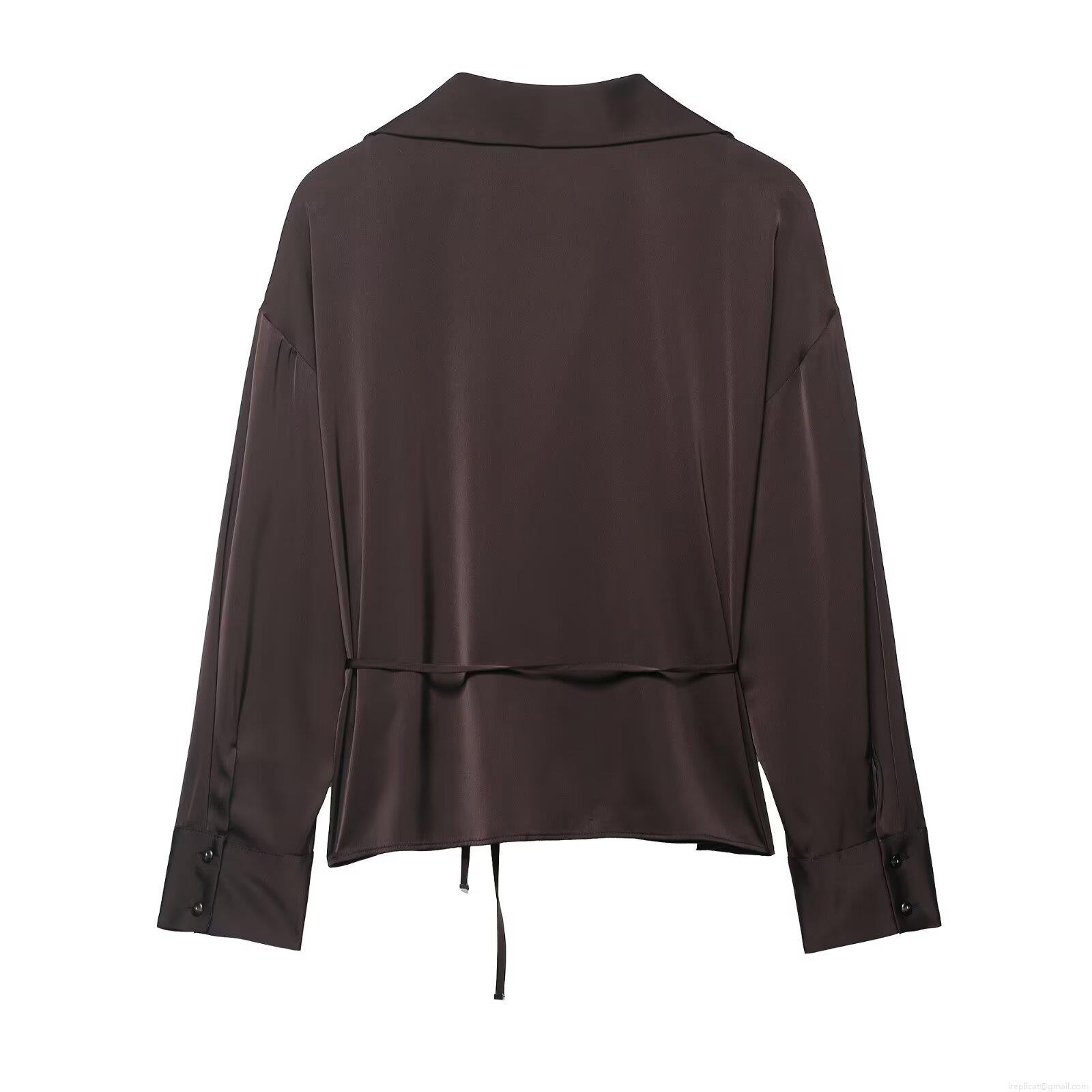 • Women's Elegant Satin Texture Long Sleeve Shirt With Waist Belt Solid Color V-Neck Drawstring Blouse For Office Daily Party Autumn Fashion Tops