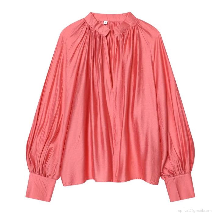• Women's Elegant Satin V Neck Blouse Long Lantern Sleeve Pleated Top With Pearl Button Cuffs Solid Color Loose Casual Shirts For Women Office Daily Wear