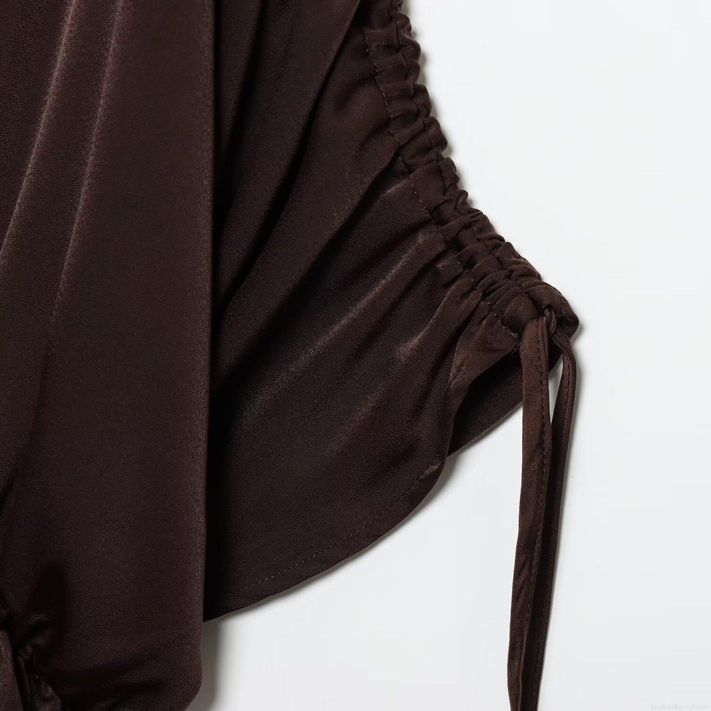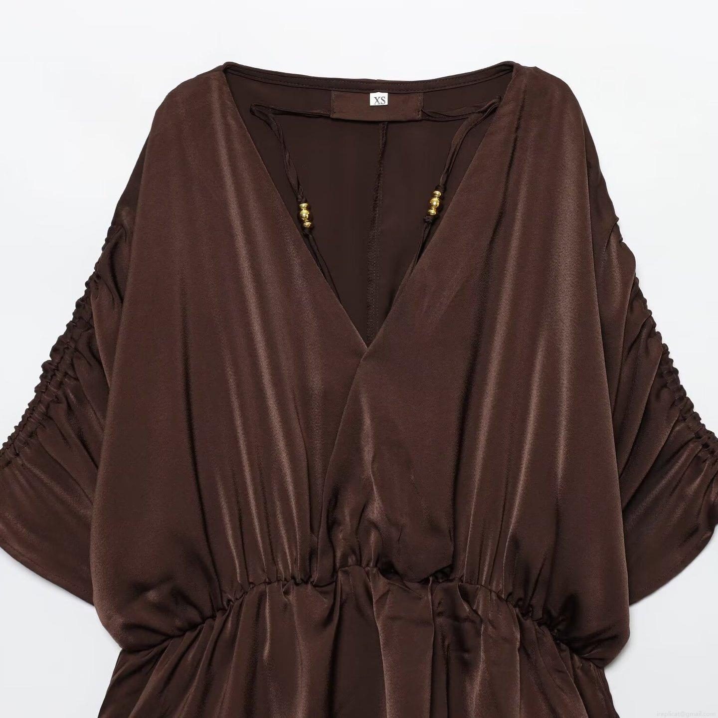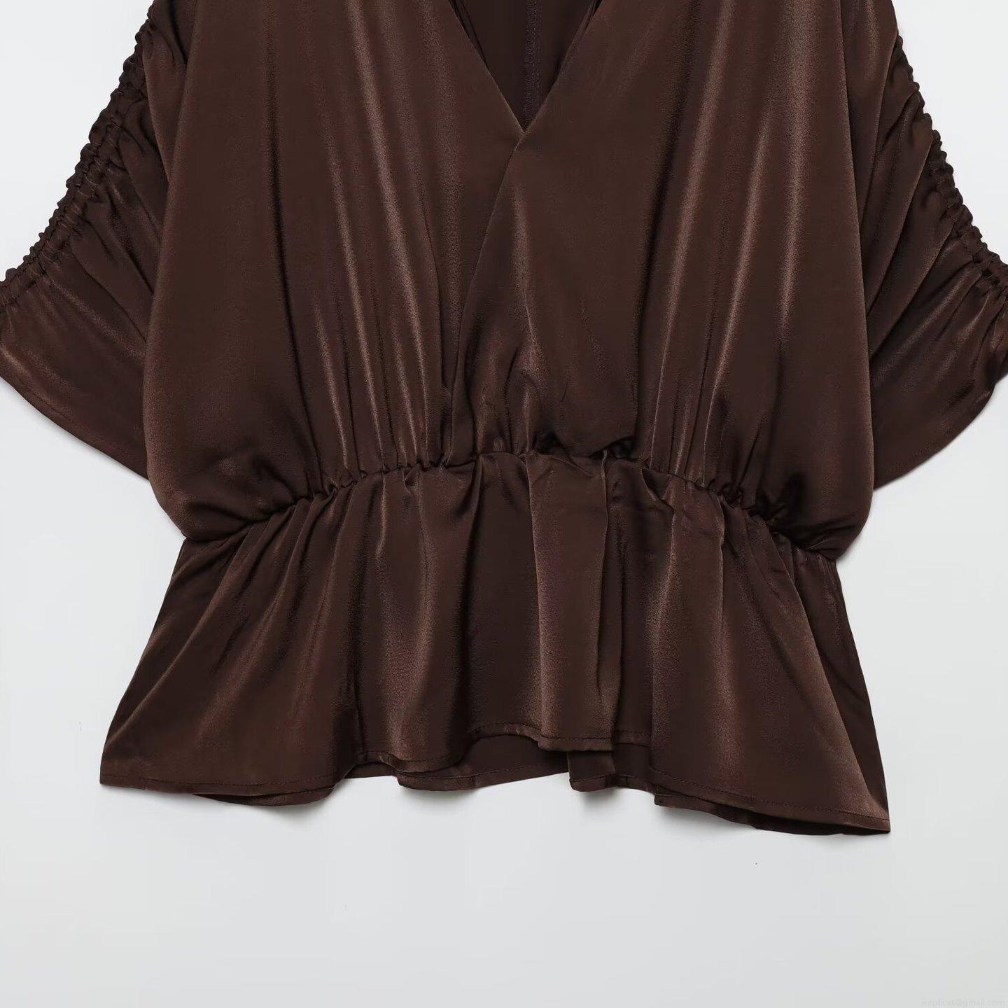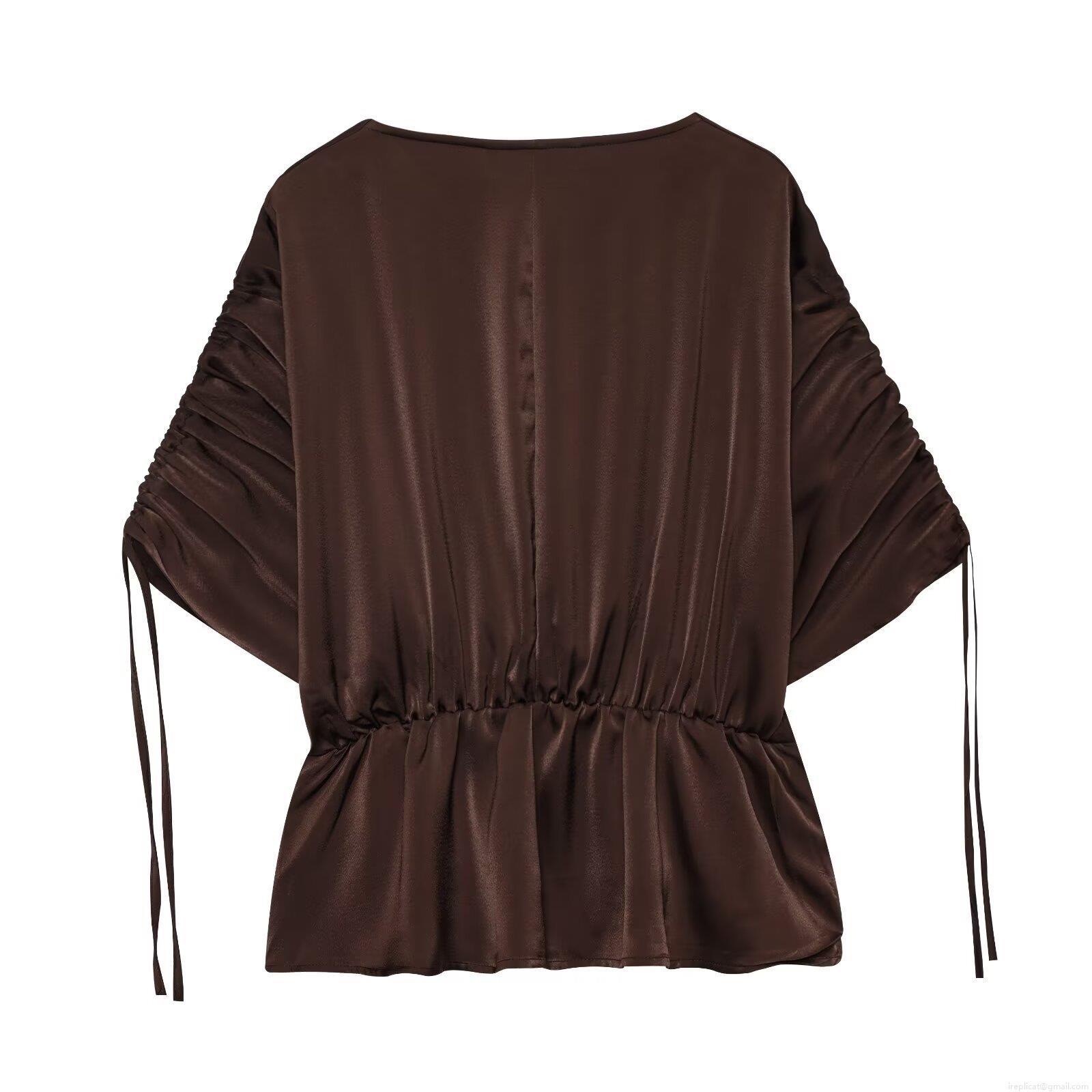 • Women's Elegant Satin V-Neck Blouse Ruched Drawstring Short Batwing Sleeve Slim Fit Polyester Spandex Top For Office Party Daily Casual
