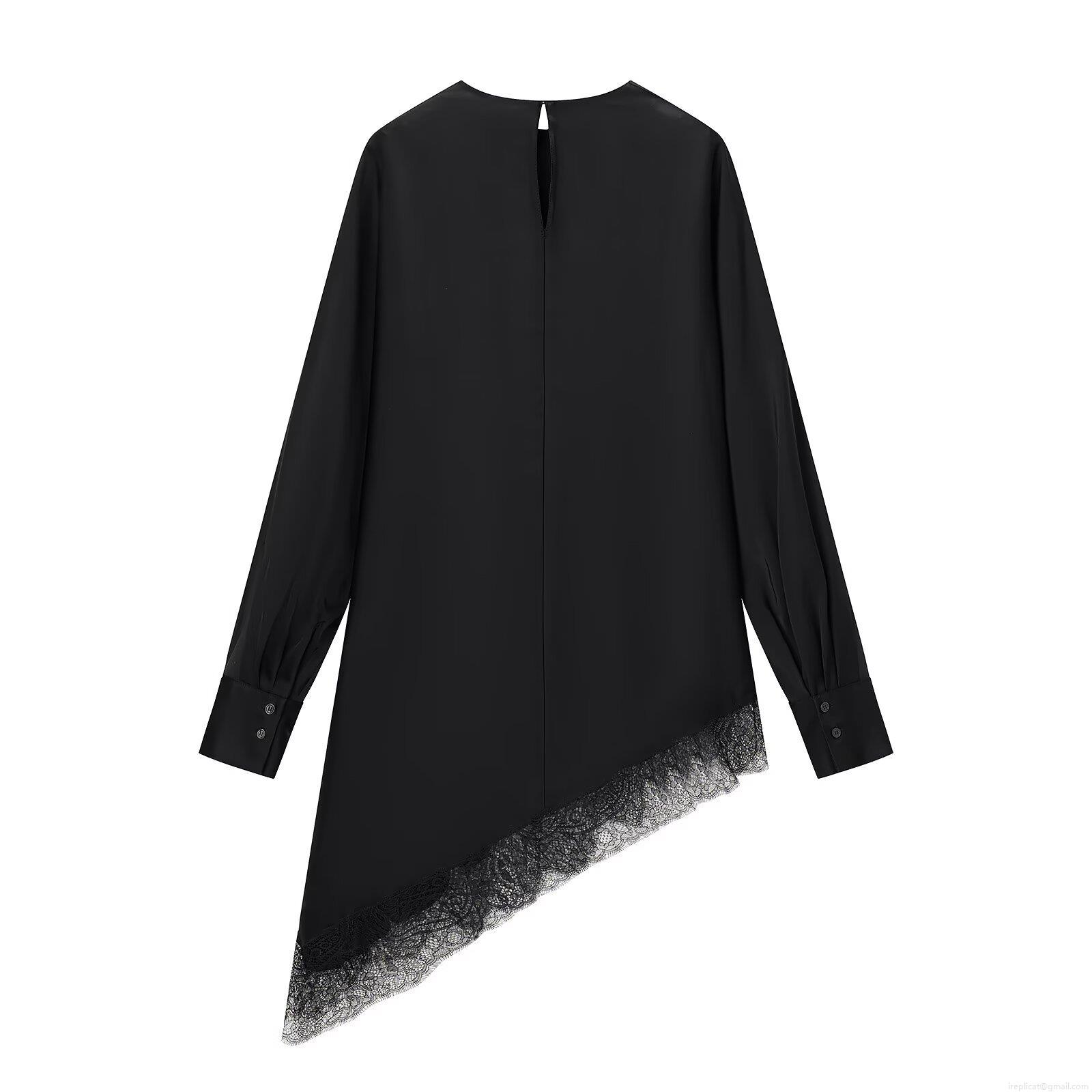 • Women's Elegant Satin Woven Polyester Long Sleeve Blouse With Asymmetric Lace Hem Round Neck Casual Fashion Shirt For Party Office Ladies