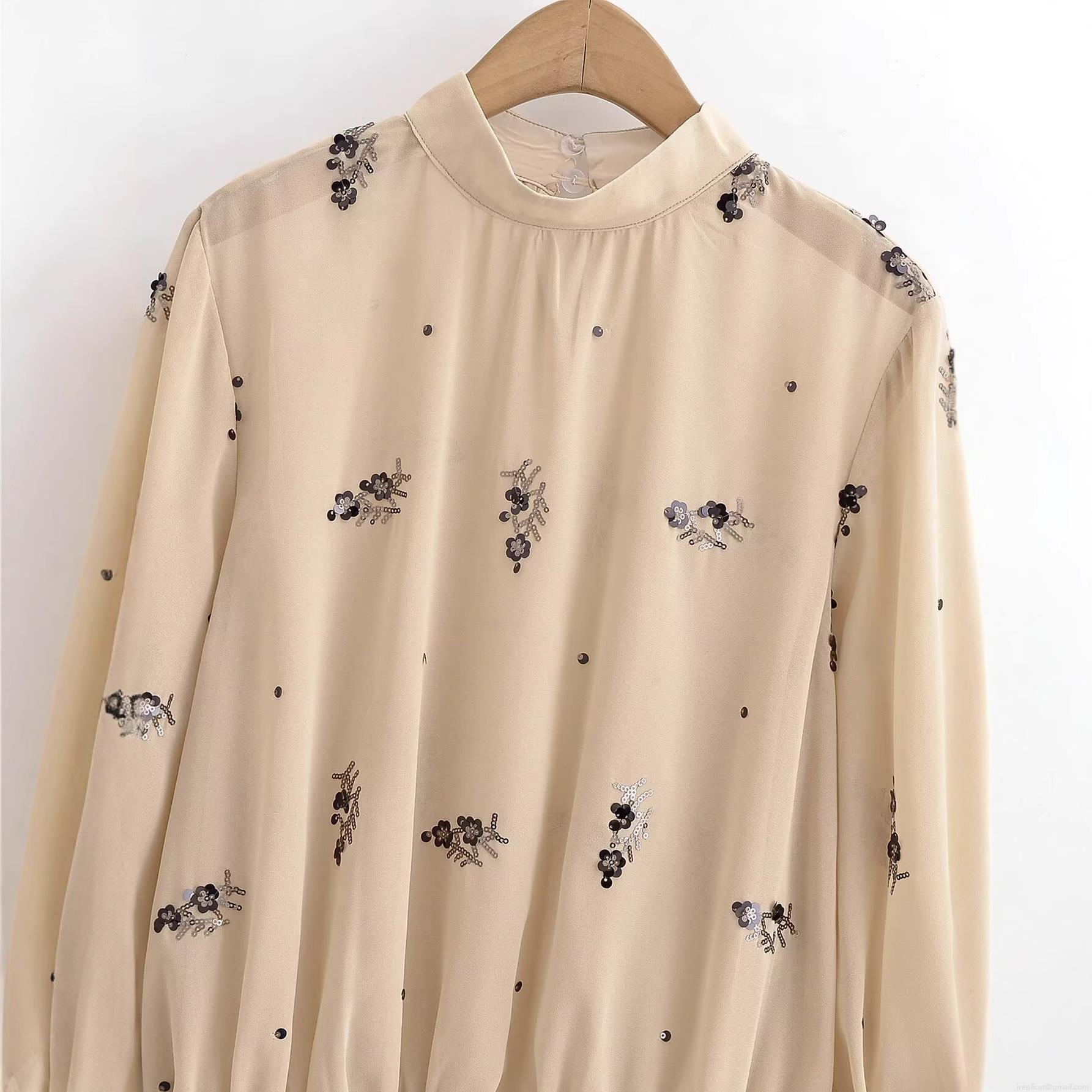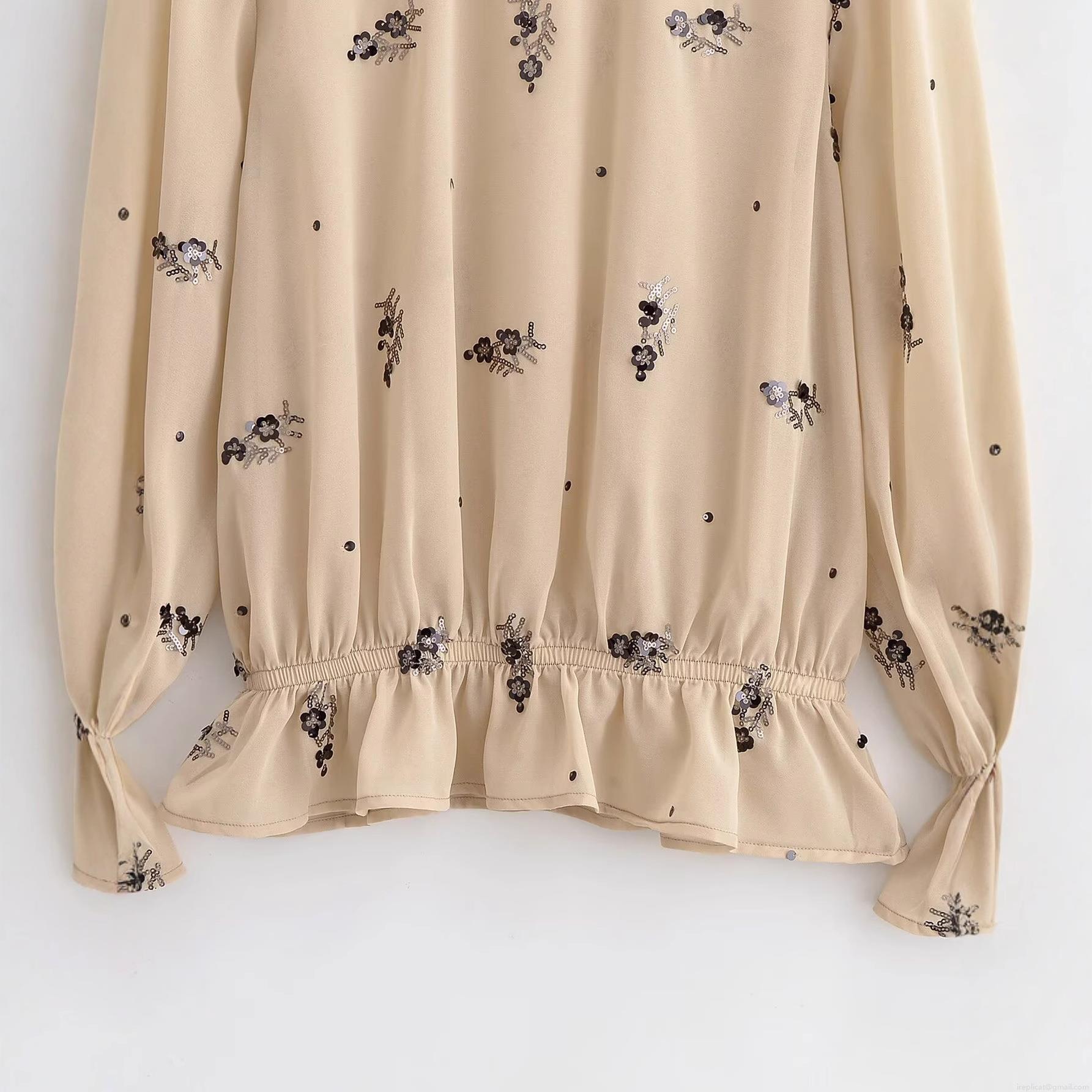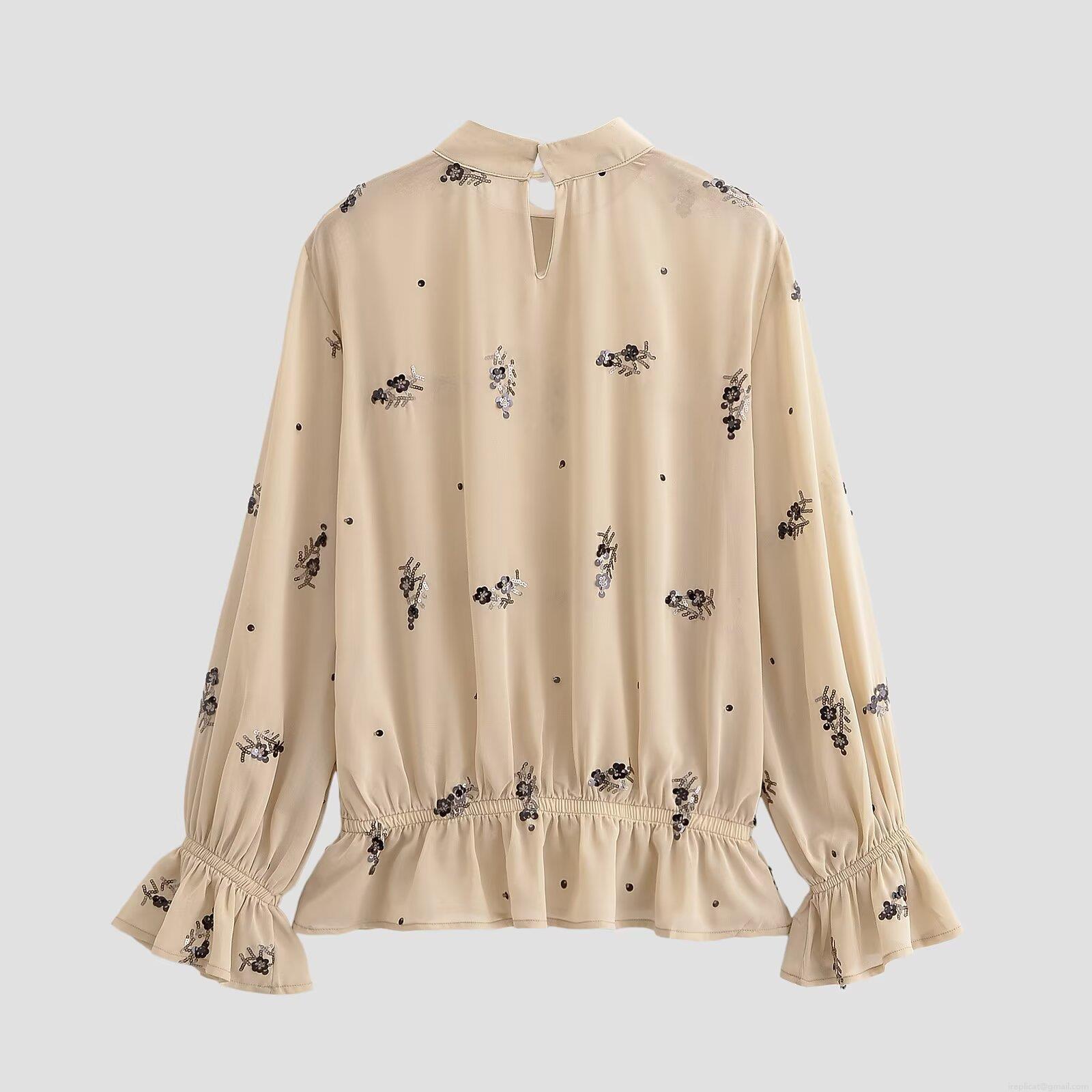 • Women's Elegant Sequin Floral Chiffon Blouse Long Sleeve Stand Collar Ruffle Hem Top For Party Evening Casual Ladies Beige Apricot Shirt
