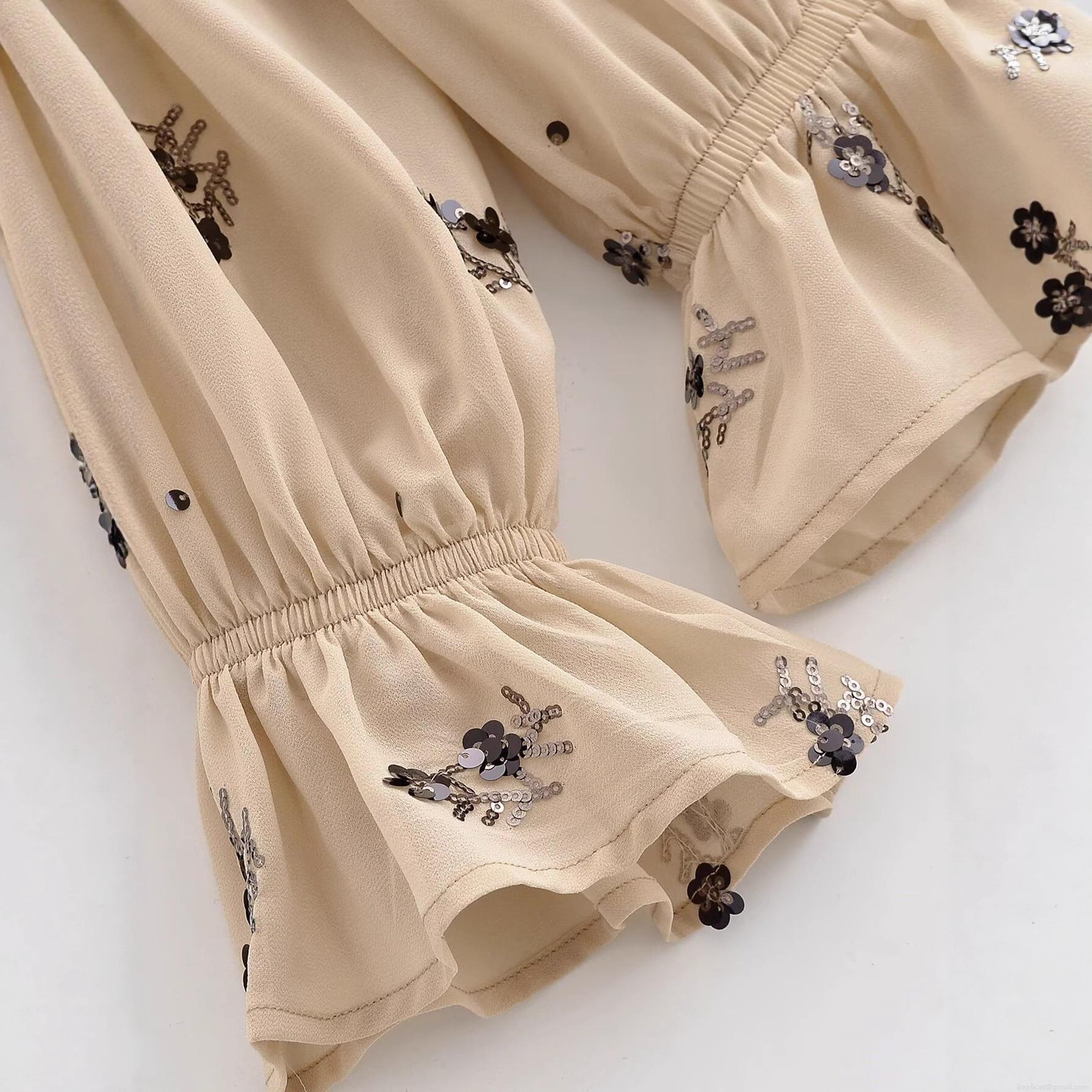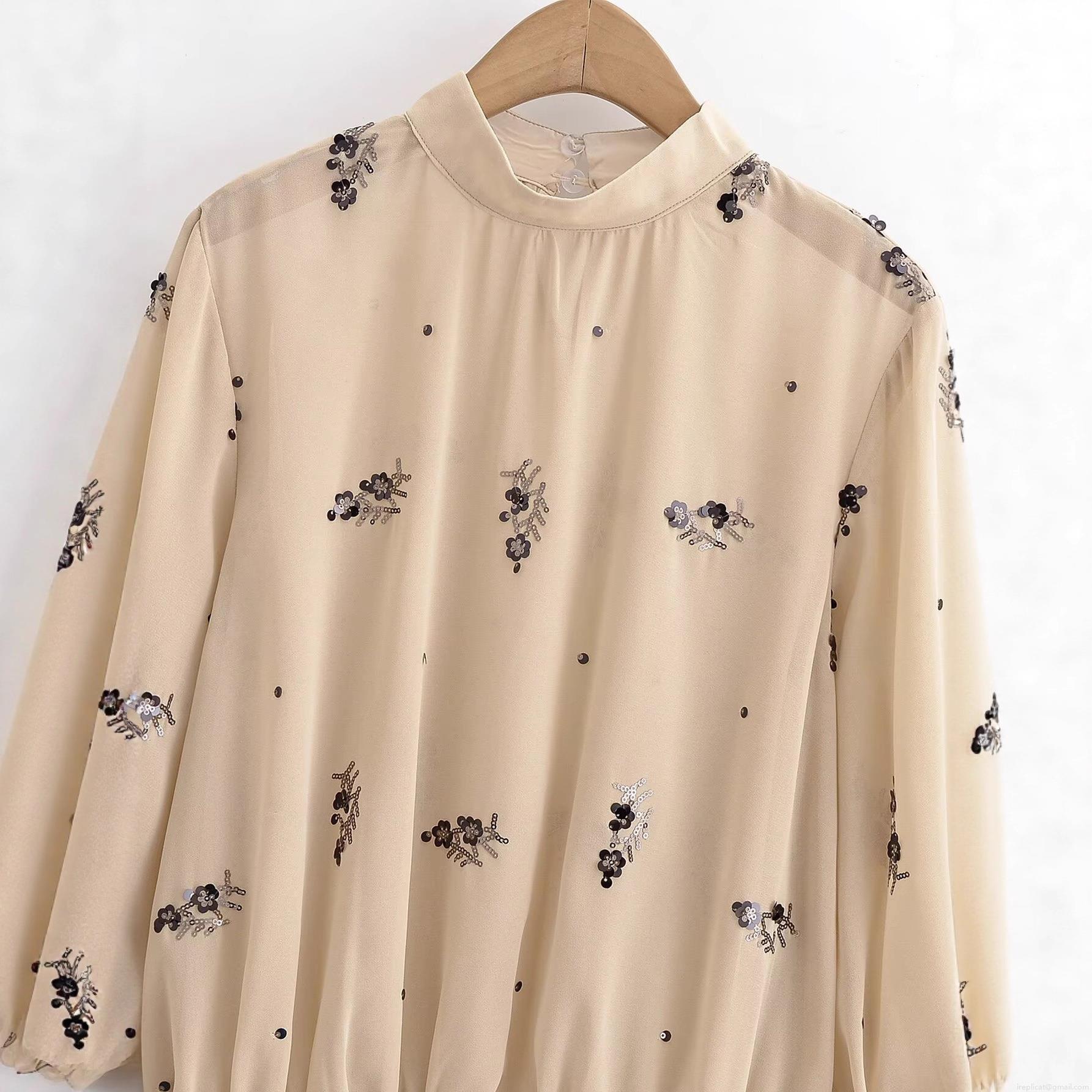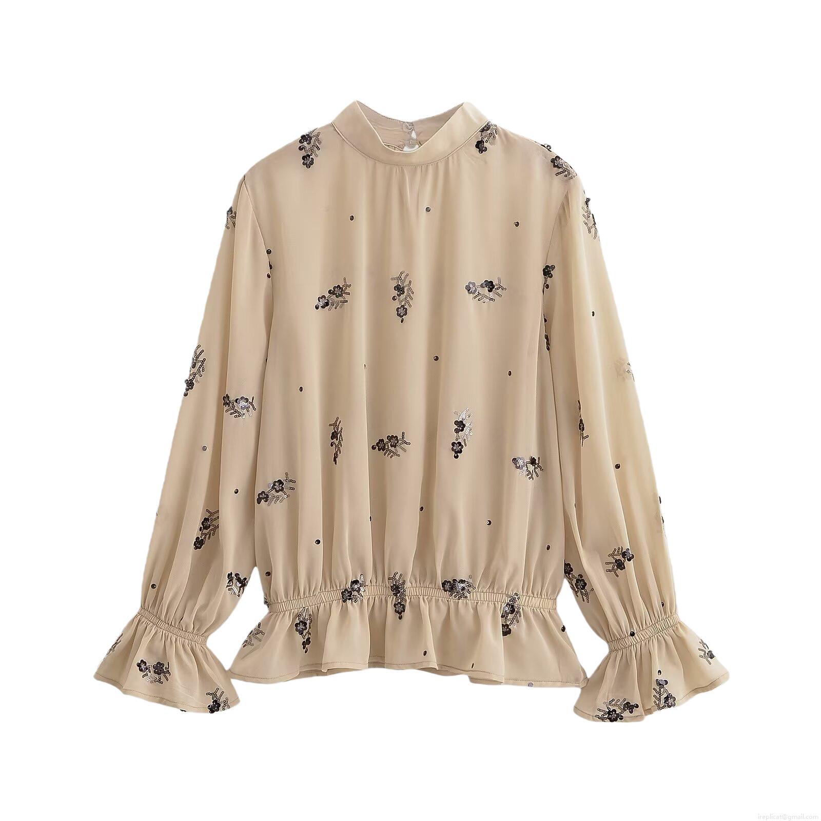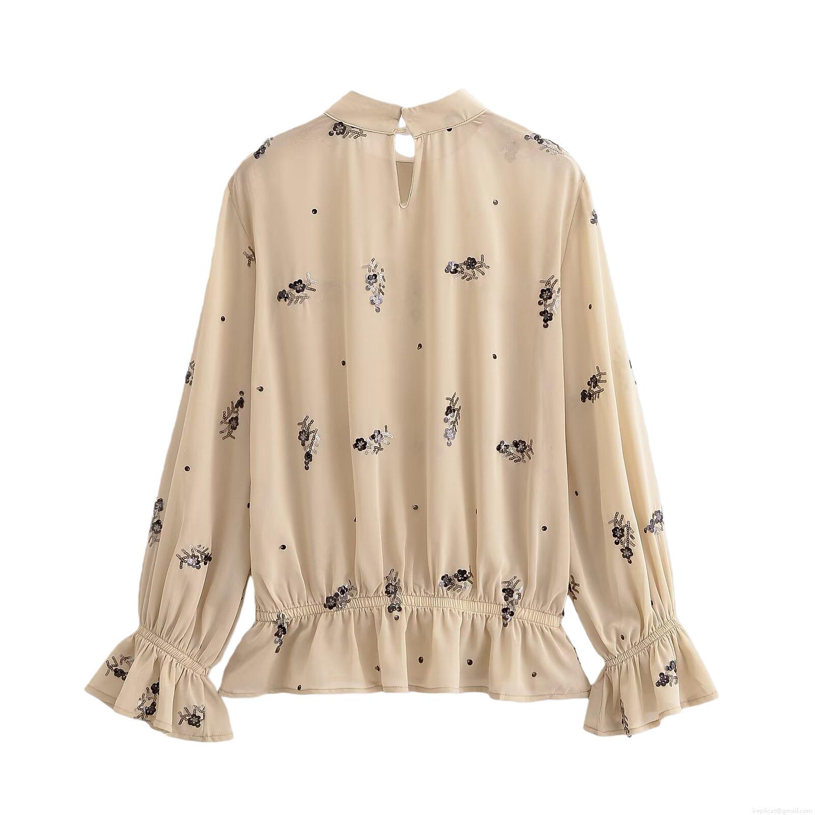 • Women's Elegant Sequin Flower Embroidery Blouse 100% Polyester Chiffon Shirt Stand Collar Long Sleeve Smocked Top With Ruffled Cuffs For Daily Party Apricot Beige