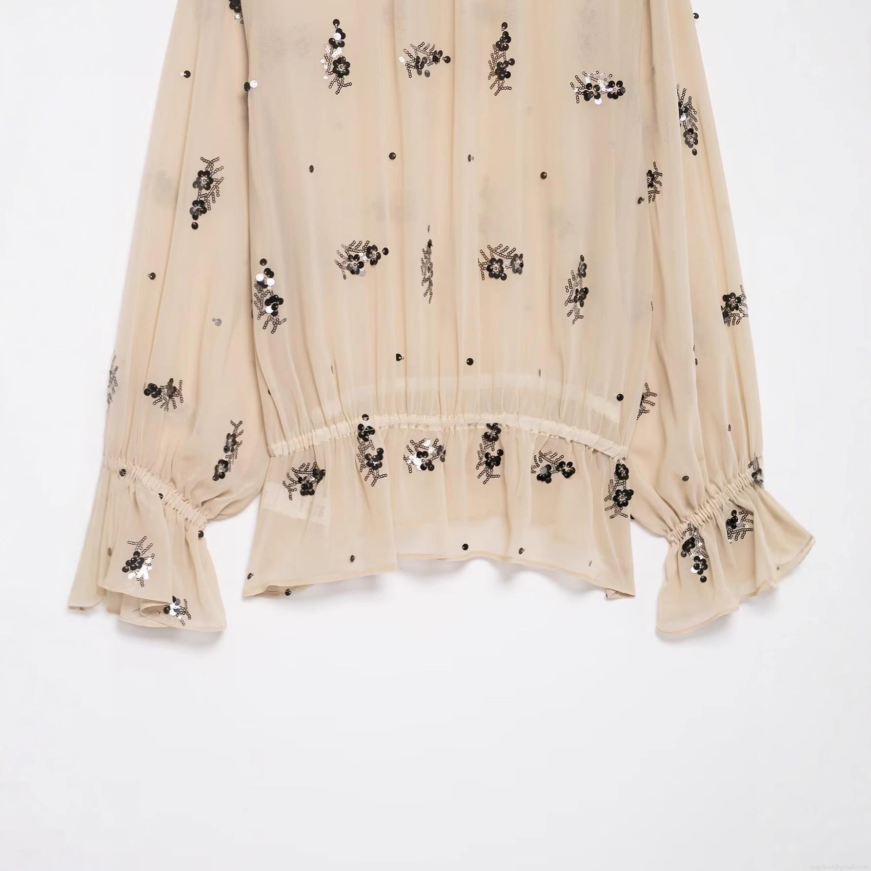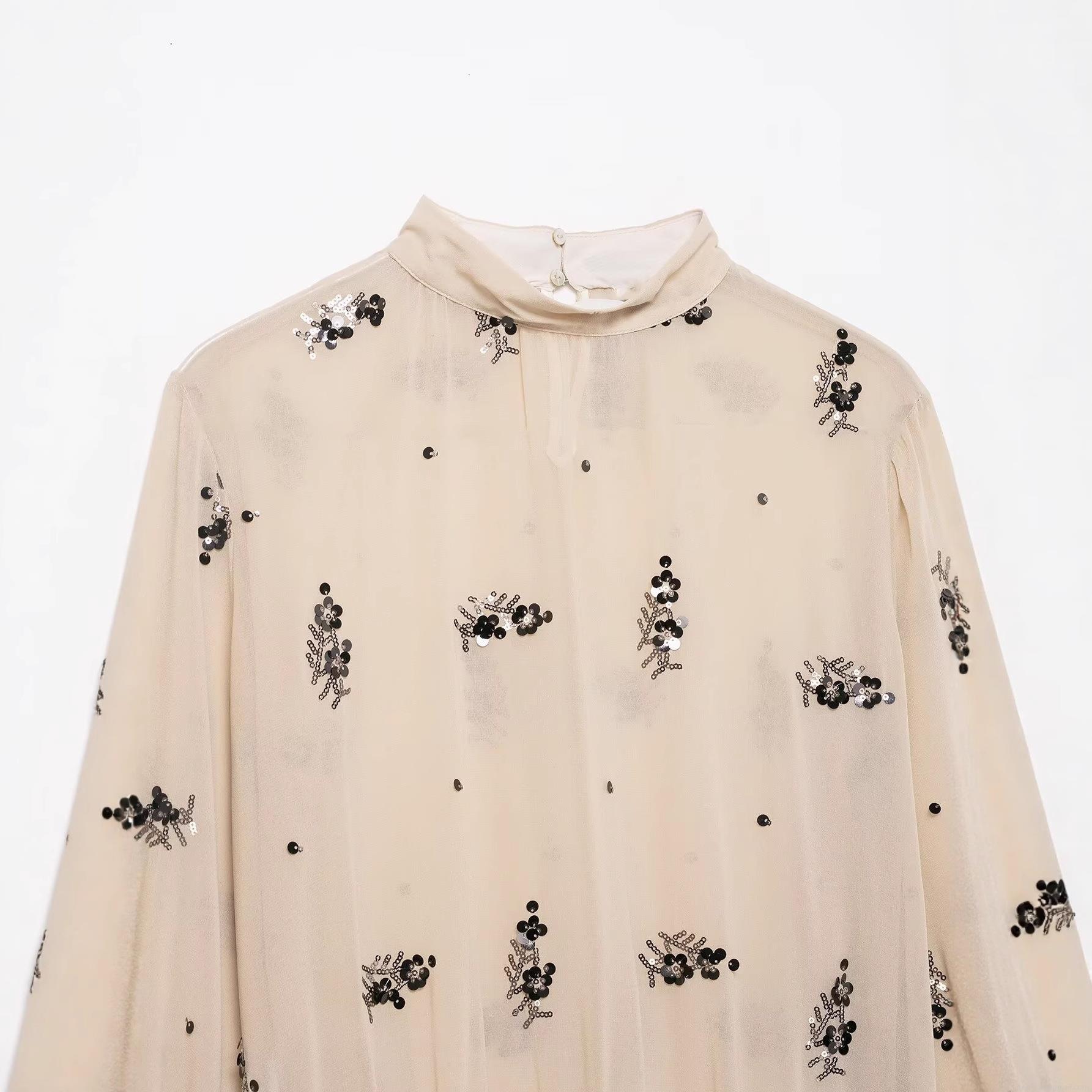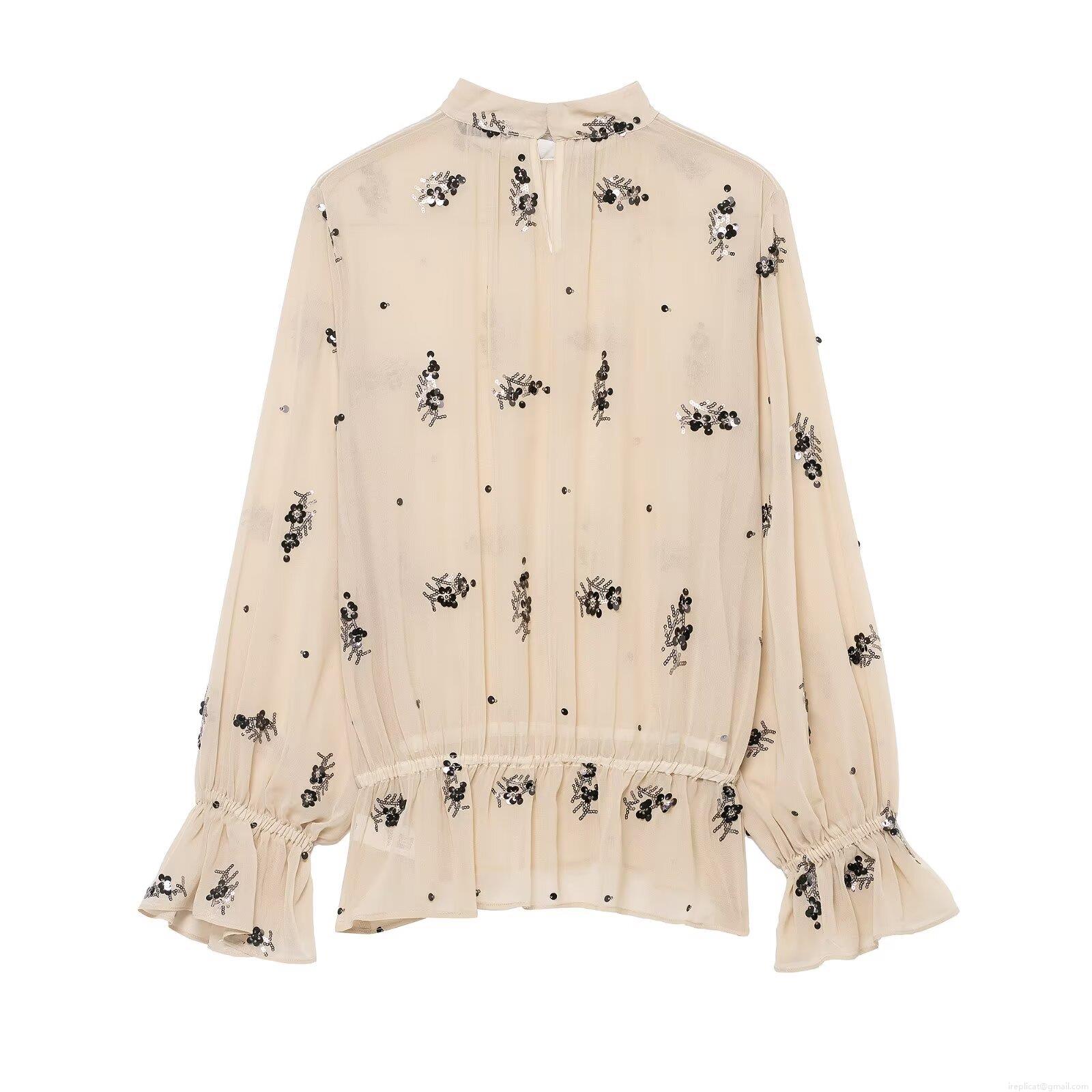 • Women's Elegant Sequin Flower Embroidery Blouse Stand Collar Long Sleeve Ruffle Cuffs Chiffon Shirt Pullover Top for Party Office