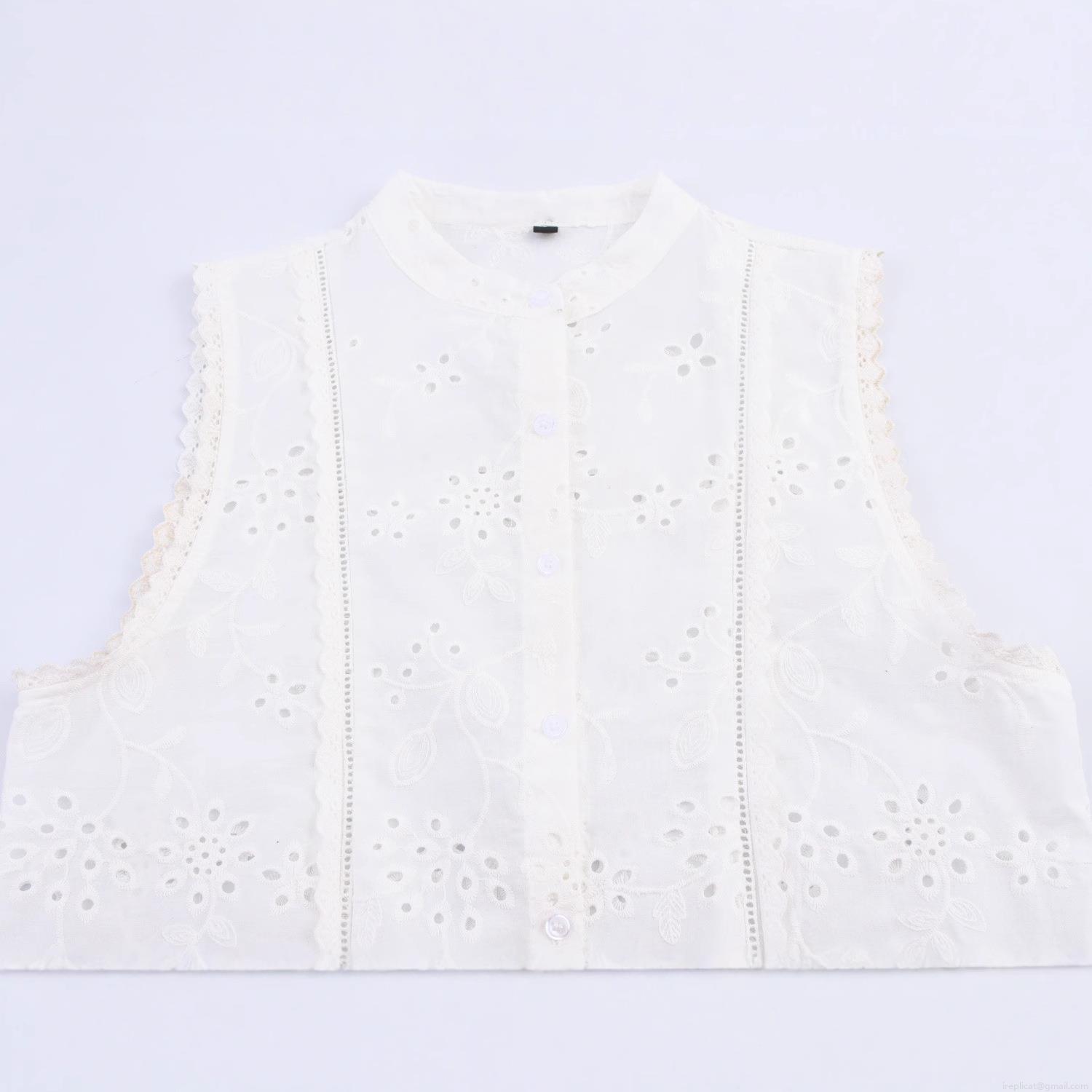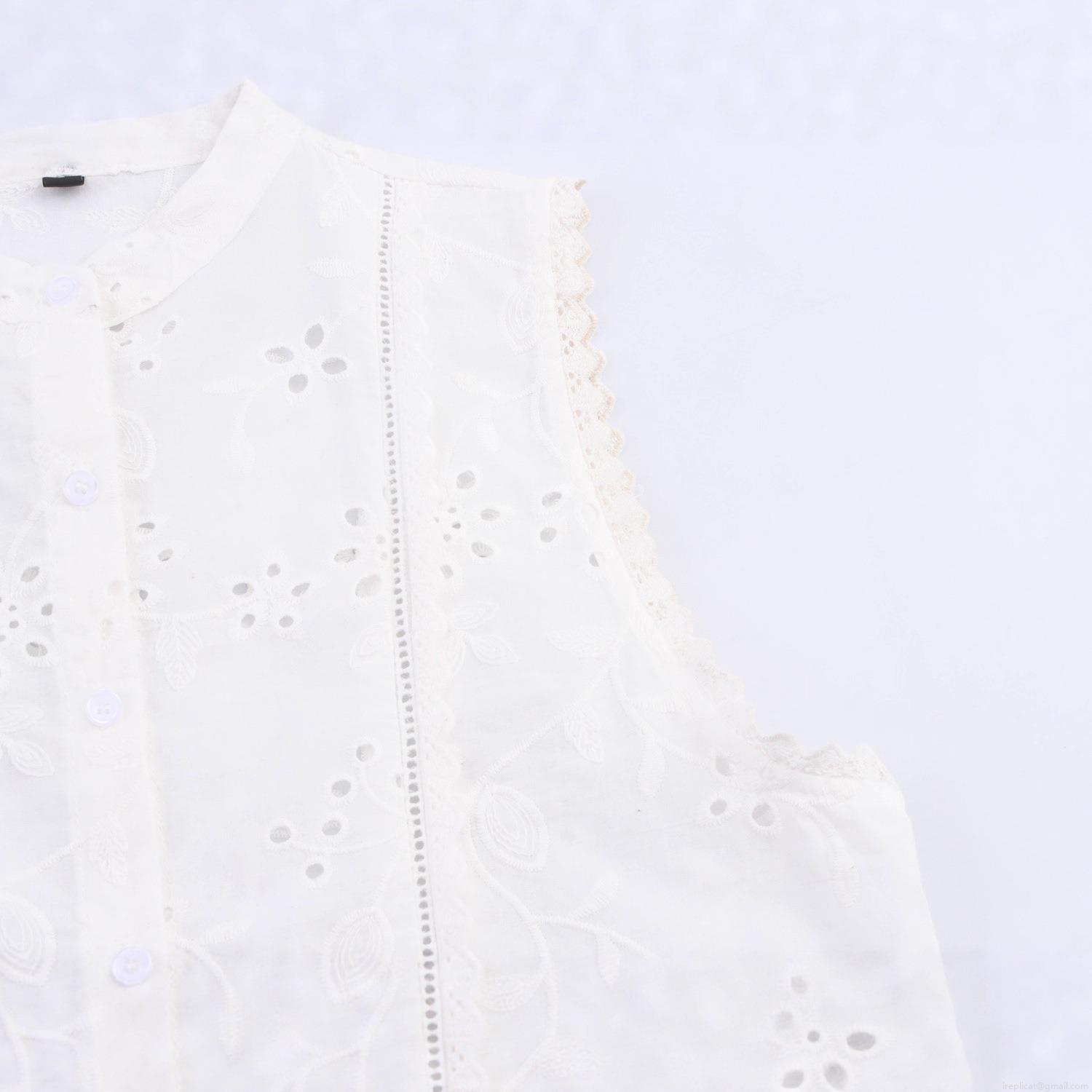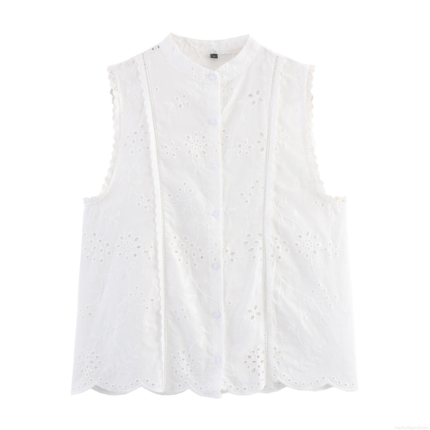 • Women's Elegant Sleeveless Cotton Blend Hollow Embroidery Blouse Stand Collar Button Down Floral Eyelet Shirt With Scalloped Hem Casual Sweet Summer Tops