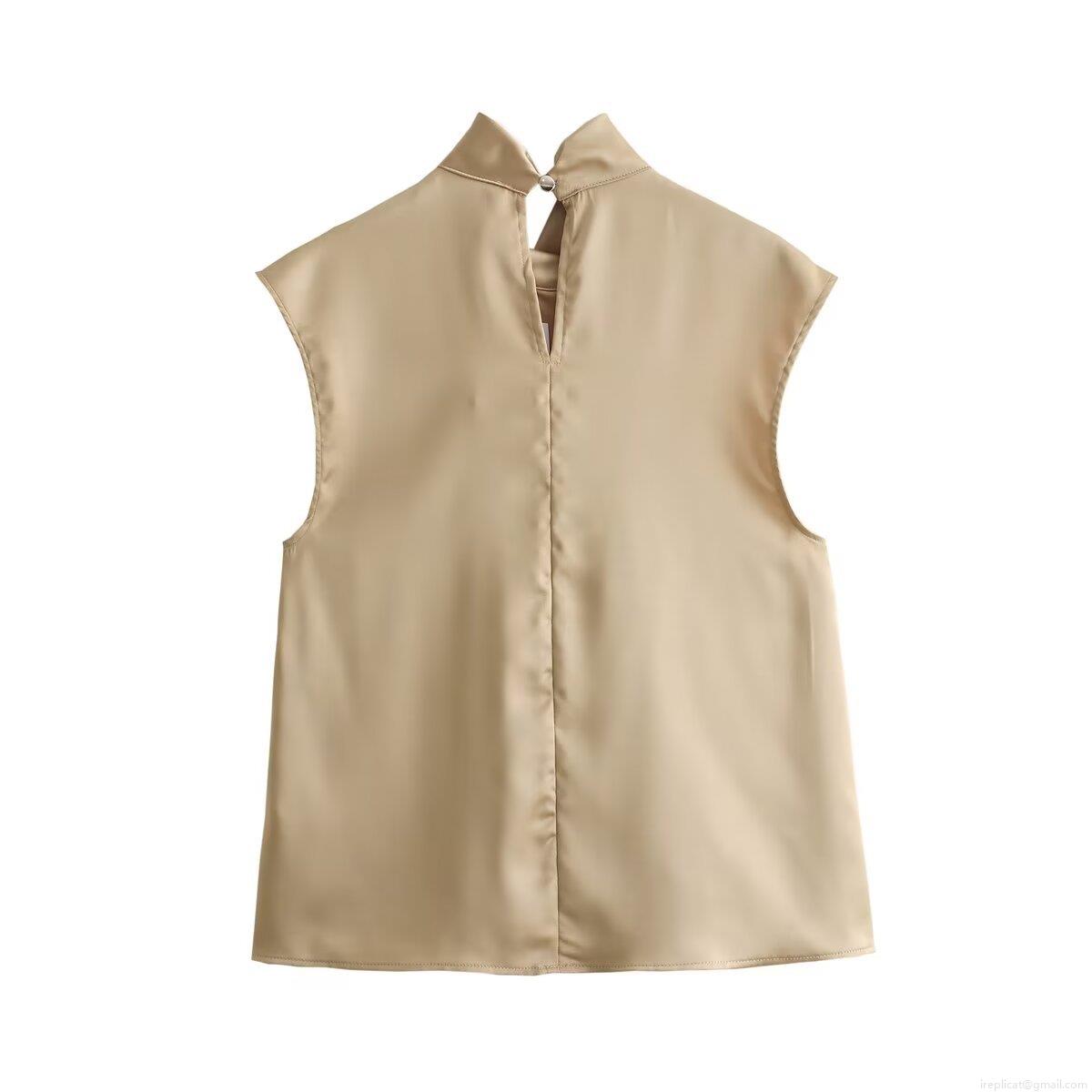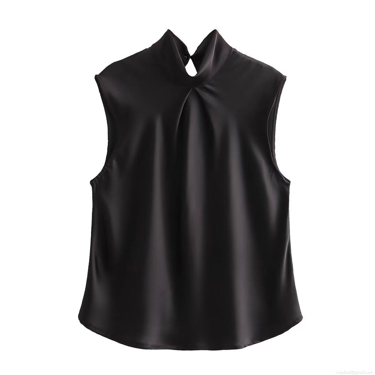 • Women's Elegant Sleeveless Satin Blouse High Neck Pleated Halter Top Silky Texture Office Party Summer Streetwear Blouse For Women
