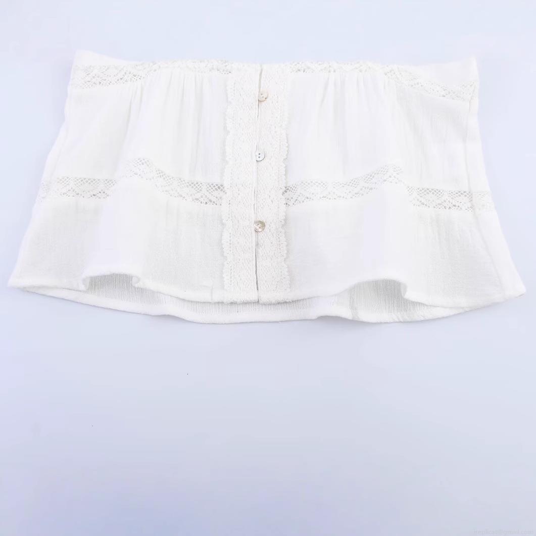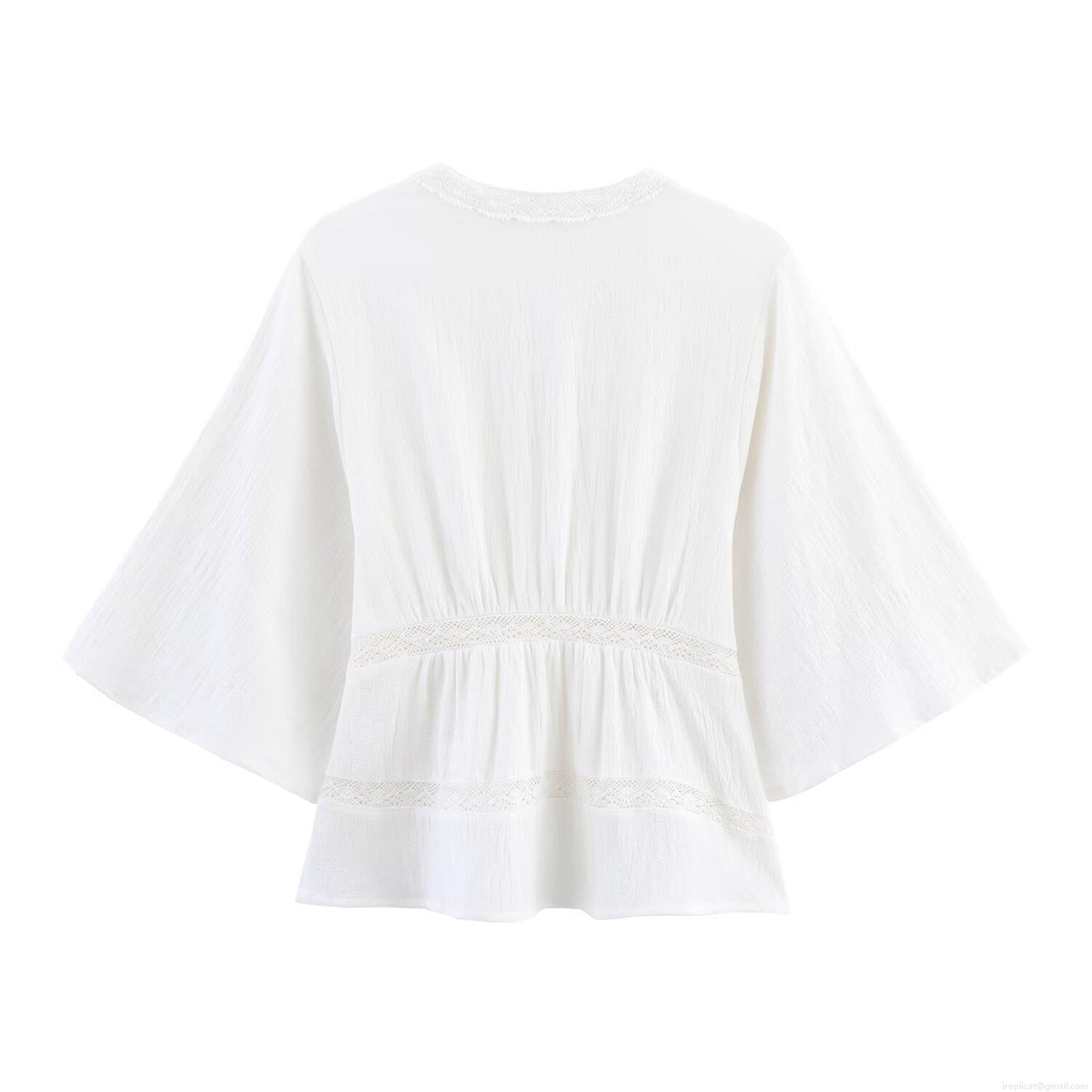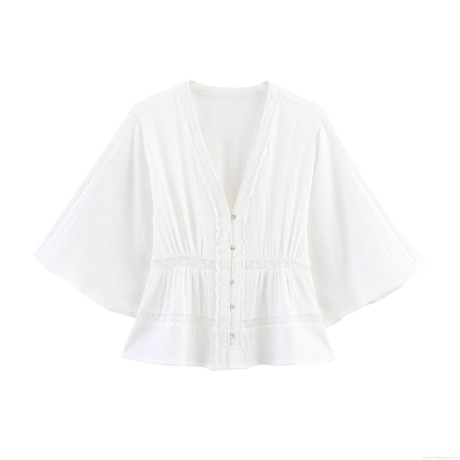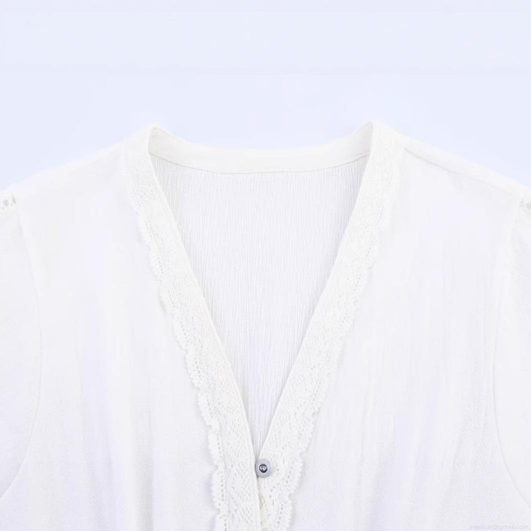 Women's Elegant Solid Color Lace Trim V Neck Blouse Short Sleeve Pleated Button Up Shirt Sweet Summer Top For Lady