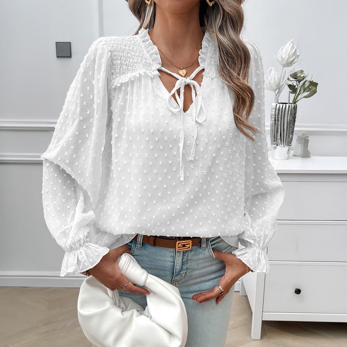 • Women's Elegant Swiss Dot Chiffon Blouse V Neck Long Sleeve Ruffle Tie Front Jacquard Shirt Casual Solid Color Office Tops For Women Fall Clothes